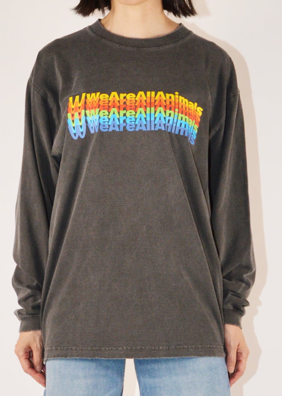 デザインレーベル【WEAREALLANIMALS】によりスタートしたファッションレーベル【STUDIO WEAREALLANIMALS(スタジオ・ウィーアーオールアニマルズ)】。コレクションは70~90年代のファッション・音楽・アートなどのカルチャーからインスパイアされています。"Retrieval and Transposition"というコンセプトの元、すべての商品を単なる洋服としてではなく”作品”と捉え、様々な過去のカルチャーをリスペクトし、そこに現代的なエッセンスを織り交ぜた商品を提案します。某有名ハンバーガーチェーンへの販促用Tシャツからのオマージュ。プリントはラバープリントのクラック加工、ピグメントダイでヴィンテージライクなフェードを表現しています。ボールバイオウォッシュ加工によりUSEDのような柔らかい肌触りを再現。襟、裾、袖口にはライトなダメージ加工を施しています。