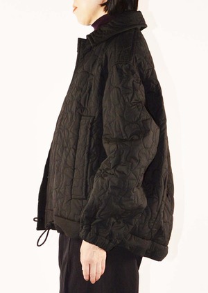 裾に施されたドローストリングを絞ってボリュームのバランスを変えて楽しめるショート丈のブルゾン。リサイクルポリエステルとリサイクルカシミアをミックスしたオリジナルのファブリックです。ヘッド柄のキルティングがユニークで、リバーシブル可能なインサイドはネイビーをセレクト。