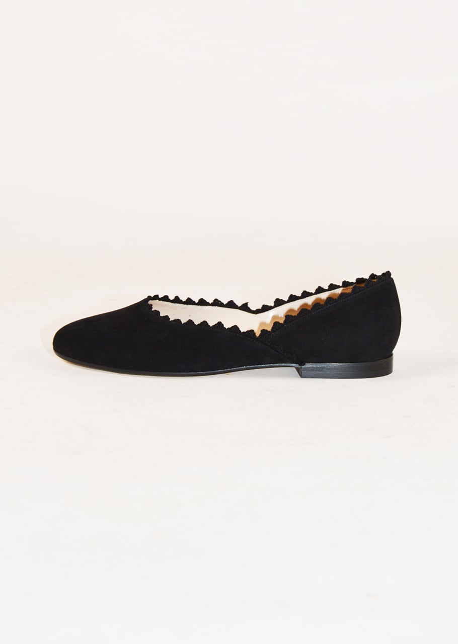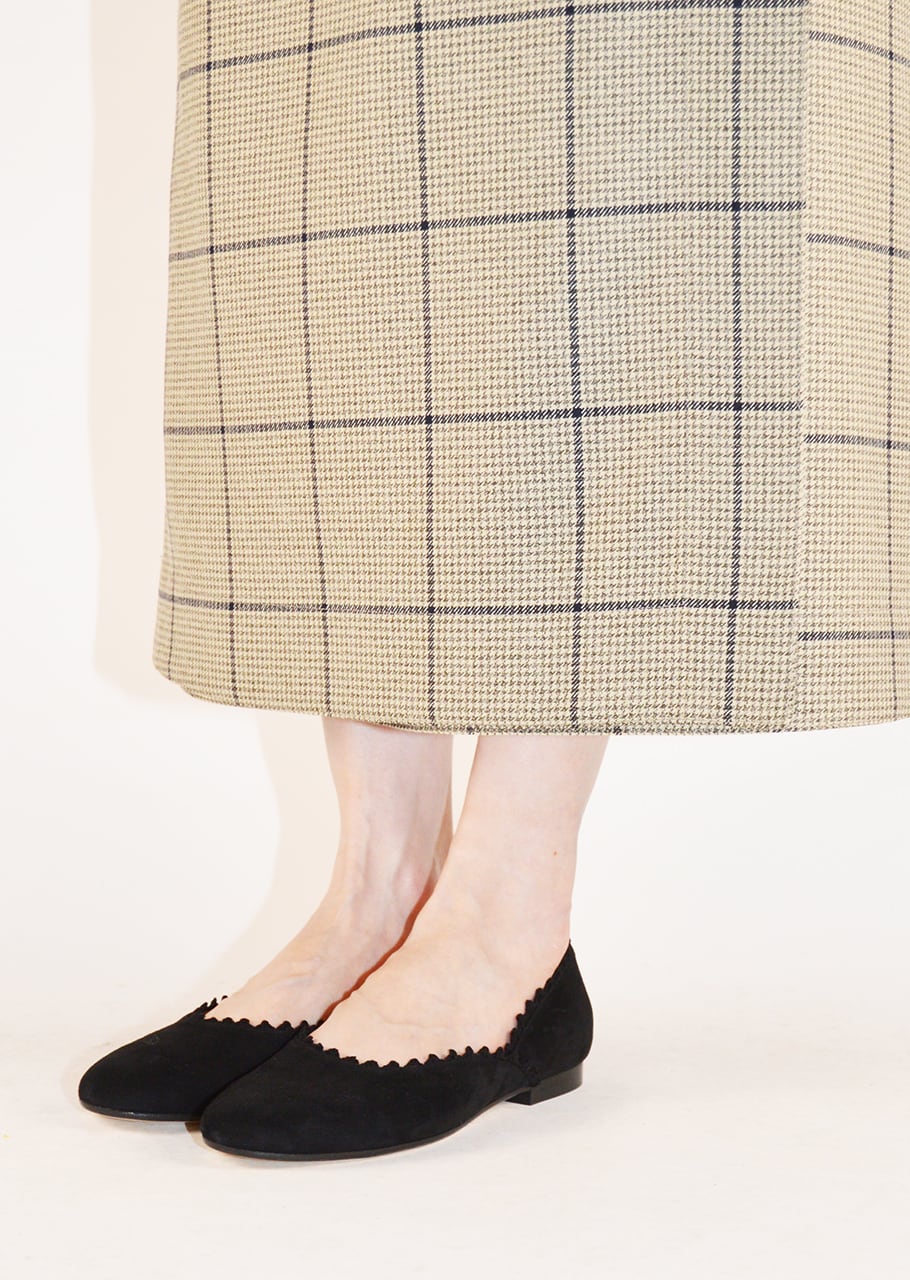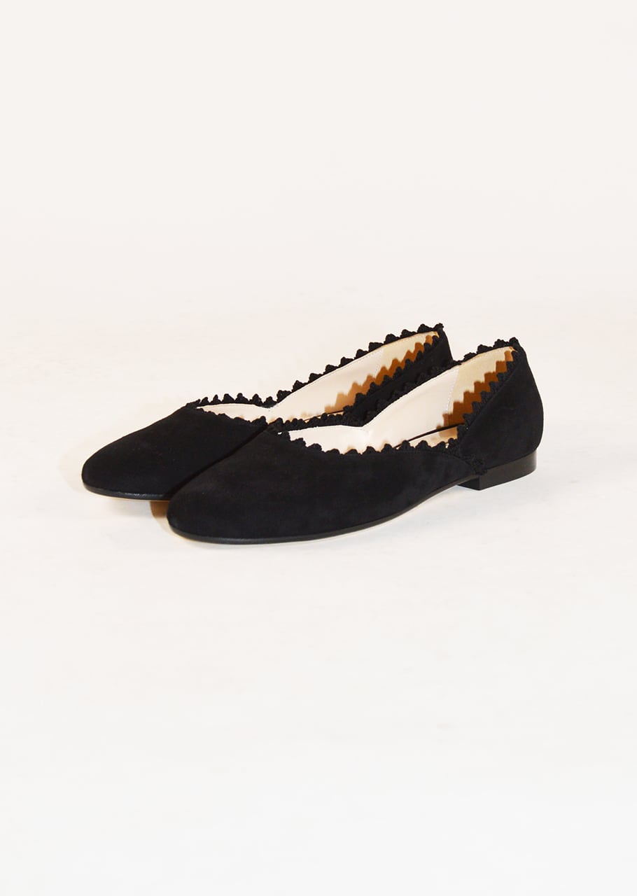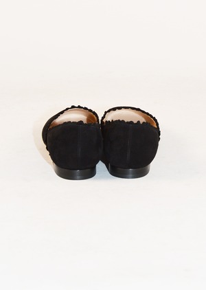 毎日履けるフラットシューズなら今シーズンはこちらをお勧め。やわらかなスェードを用いた全体的に丸くやわらかなフォルムのフラットシューズはとても軽快な履き心地。甲の部分にあしらわれたスキャラップレースはありそうでなかったデザイン。レッグウェアとのコーディネートも楽しみな一足です。
