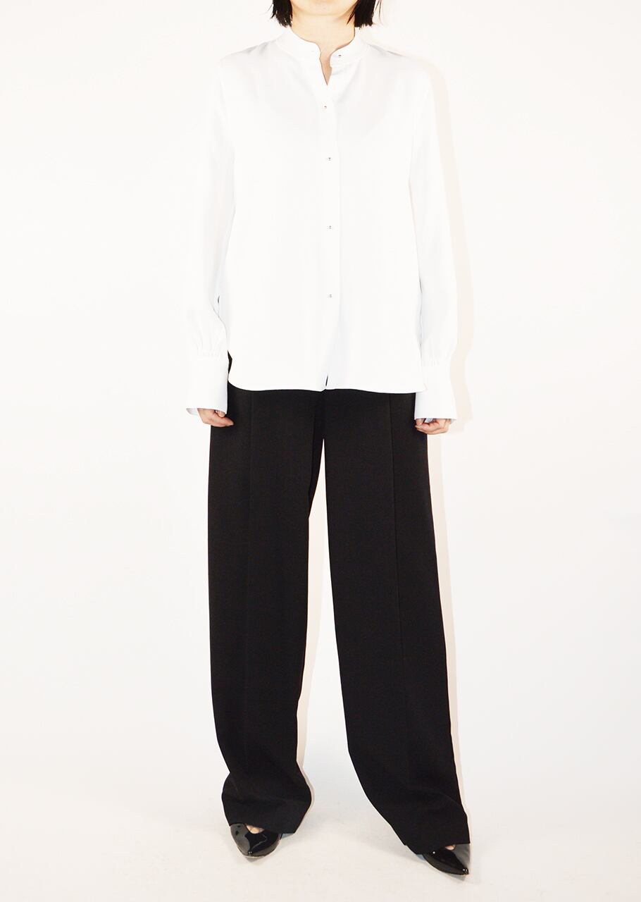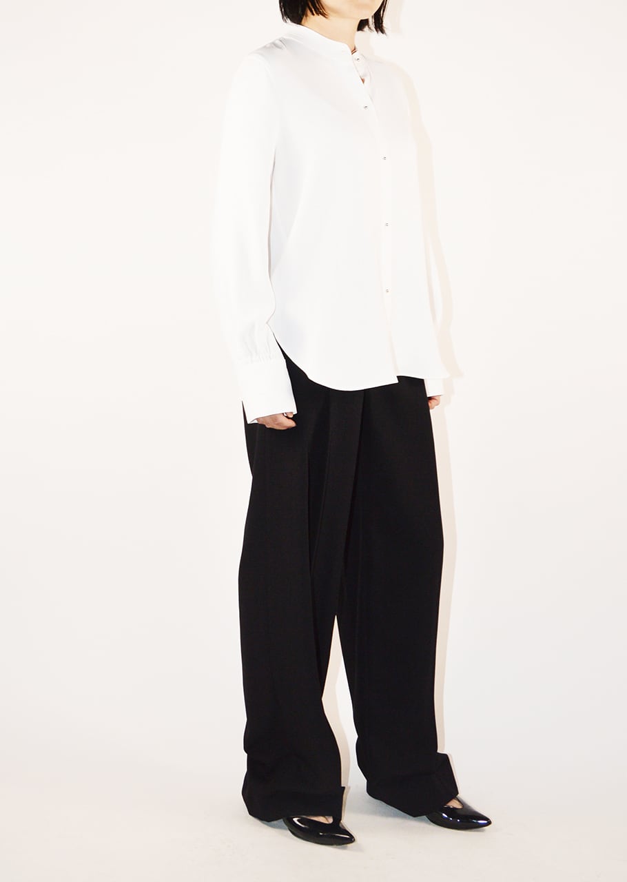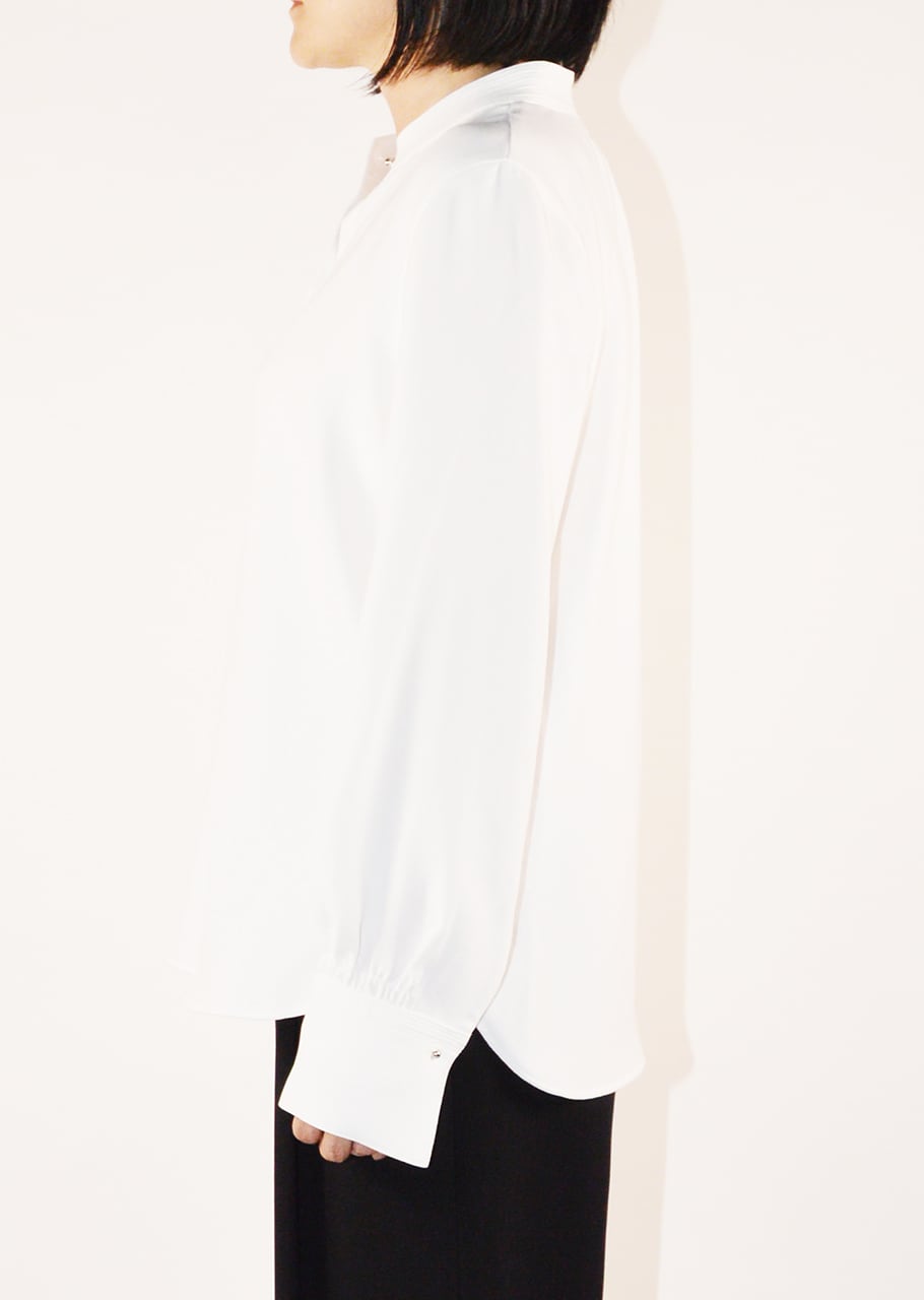 滑らかな素材で仕上げたシンプルなブラウスです。襟元のステッチワーク、袖口のギャザー、ボタンの代わりにあしらわれたシルバーパーツと、シンプルさの中に華のある要素が目を惹くアイテムです。合わせるもの次第でオンオフ問わず着こなせるのも魅力です。