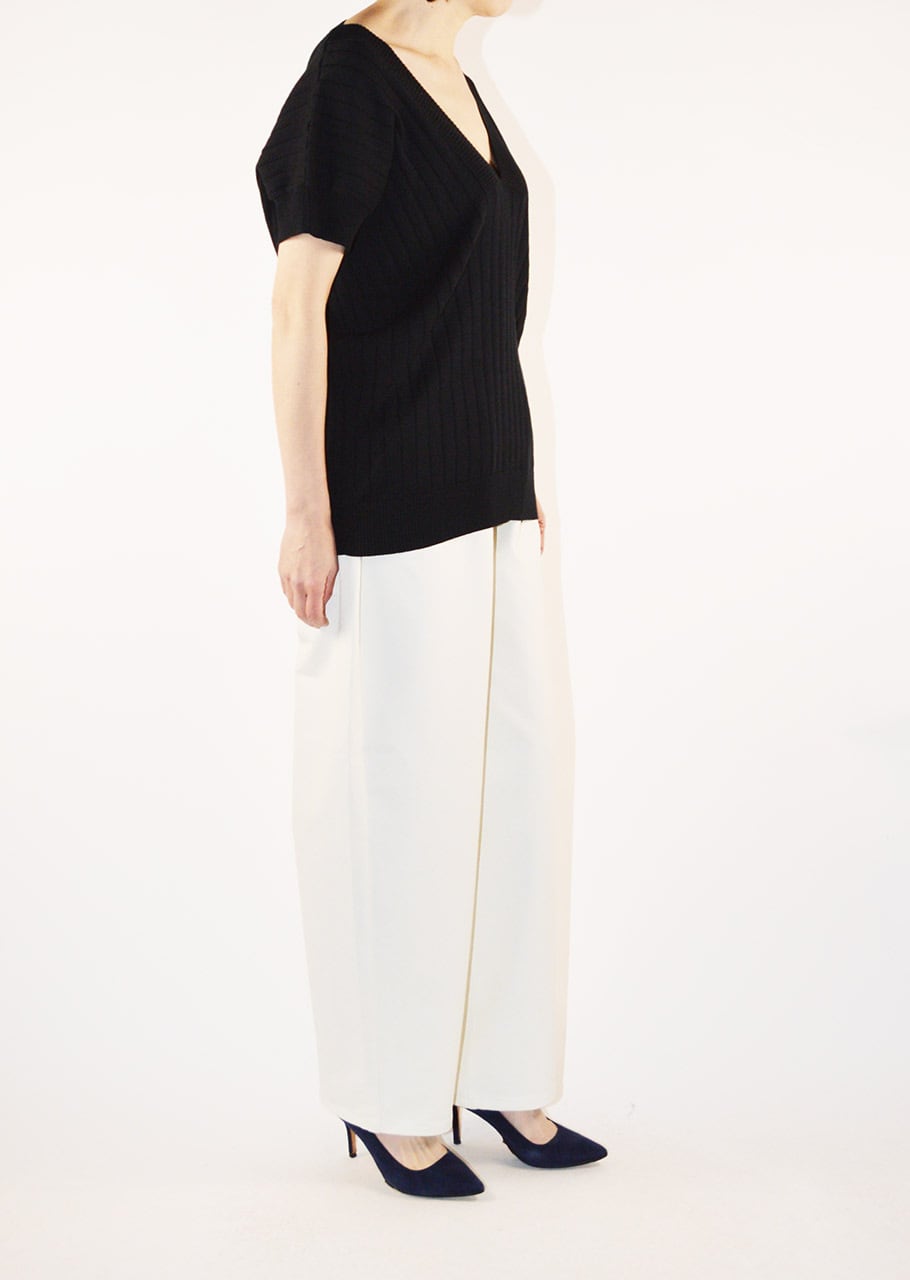 コットン100%のシンプルなショートスリーブリブセーター。 前後共V開きになった美しいシルエットのデザイン。これ一枚で着るのはもちろん、インナーや羽織りを合わせた重ね着もおすすめの着こなしです。