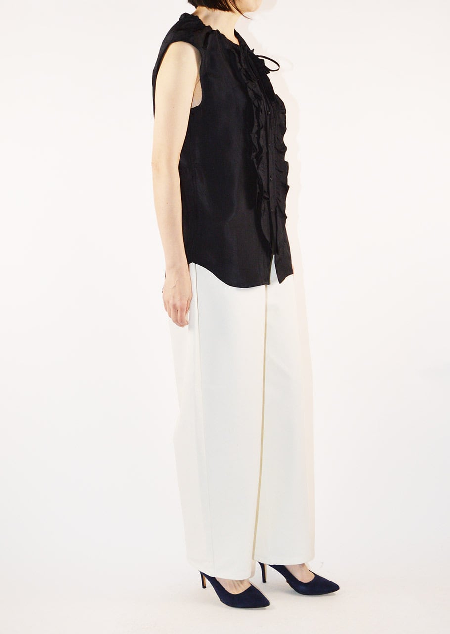 このブランドには新しい甘めなフリルを用いた遊び心の効いたデザイン。真夏にはこれ一枚で着るのはもちろん、ジャケットやカーディガンのインナーにもおすすめです。
