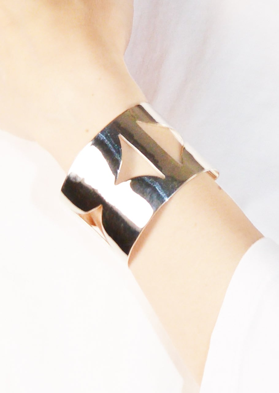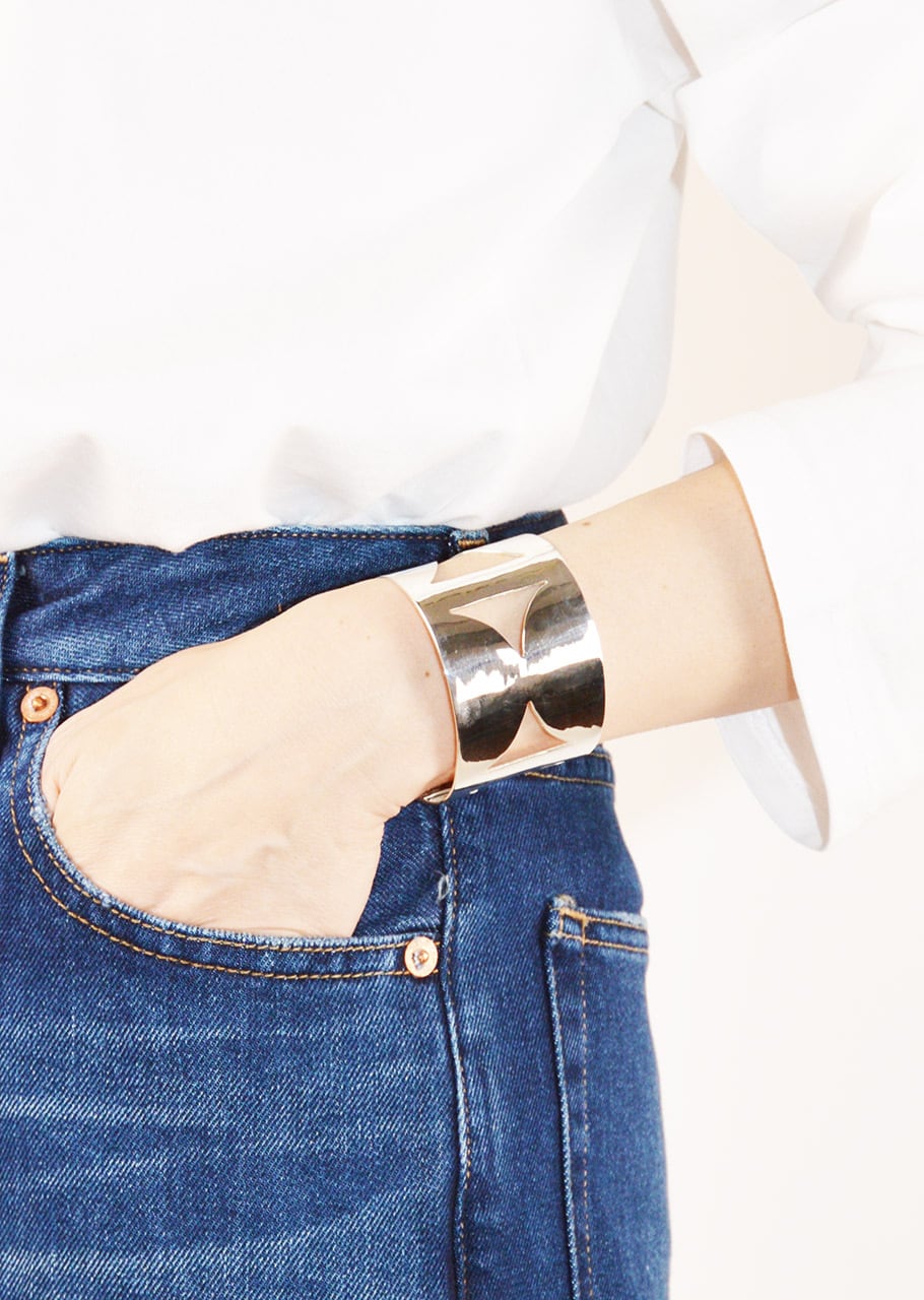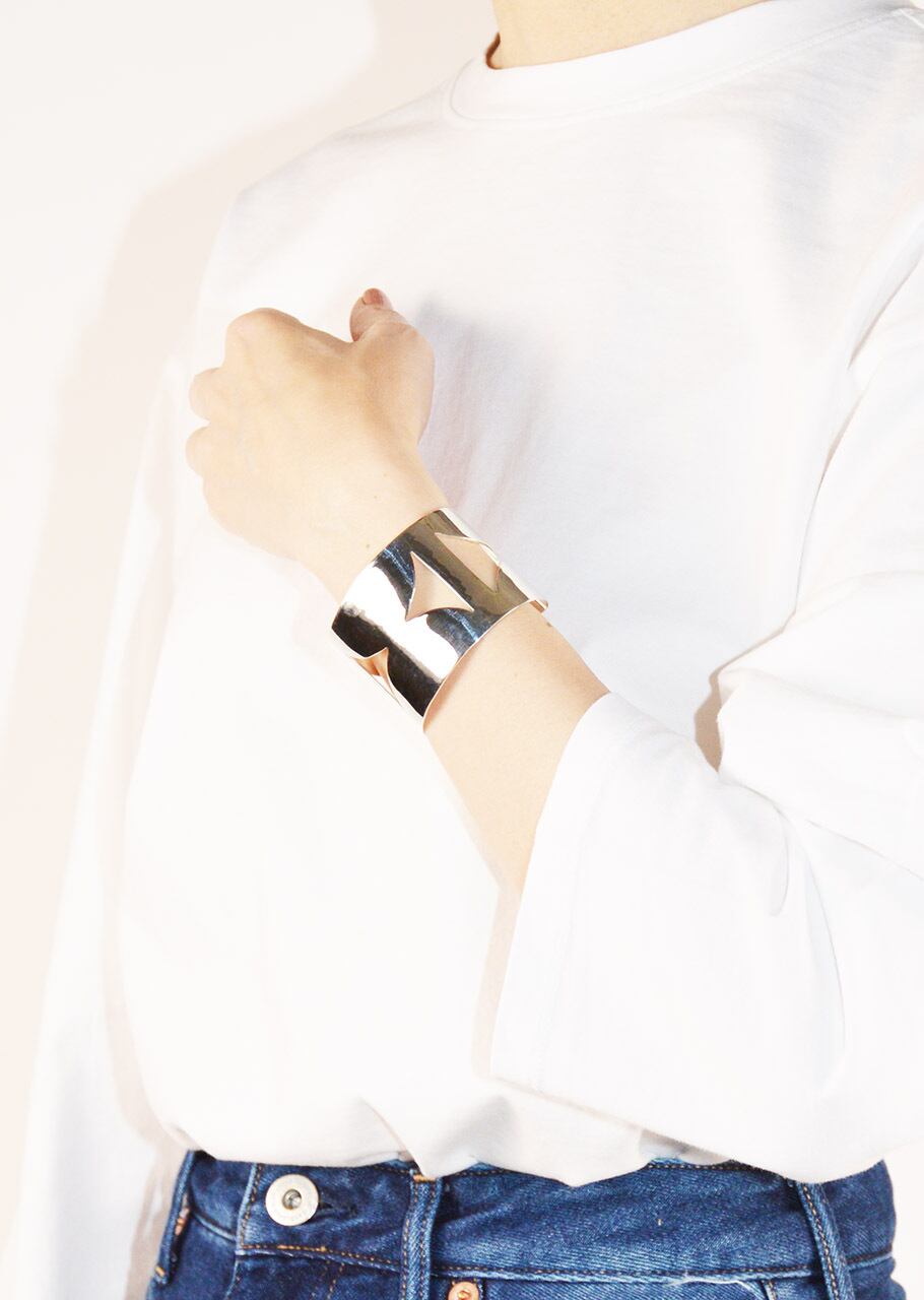 より純度の高いシルバー950にをレースのなカットを入れた、透明感のあるシックな表情に仕上げたバングル。従来のシルバージュエリーのイメージを覆すモダンかつスタイリッシュなアイテムです。アジャスター機能を省くことで付け外しがしやすく、デイリーな装いのポイントにおすすめです。