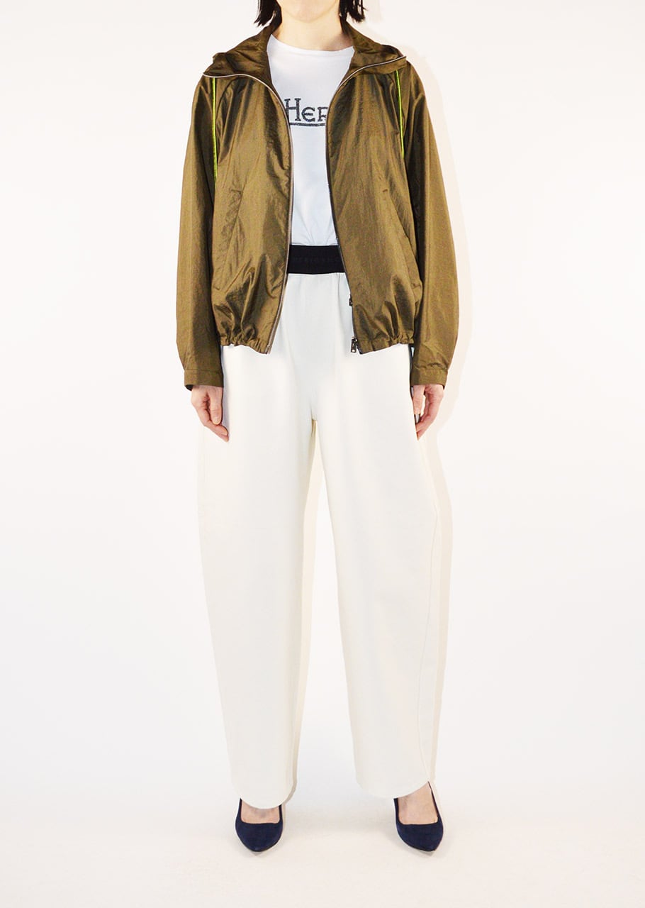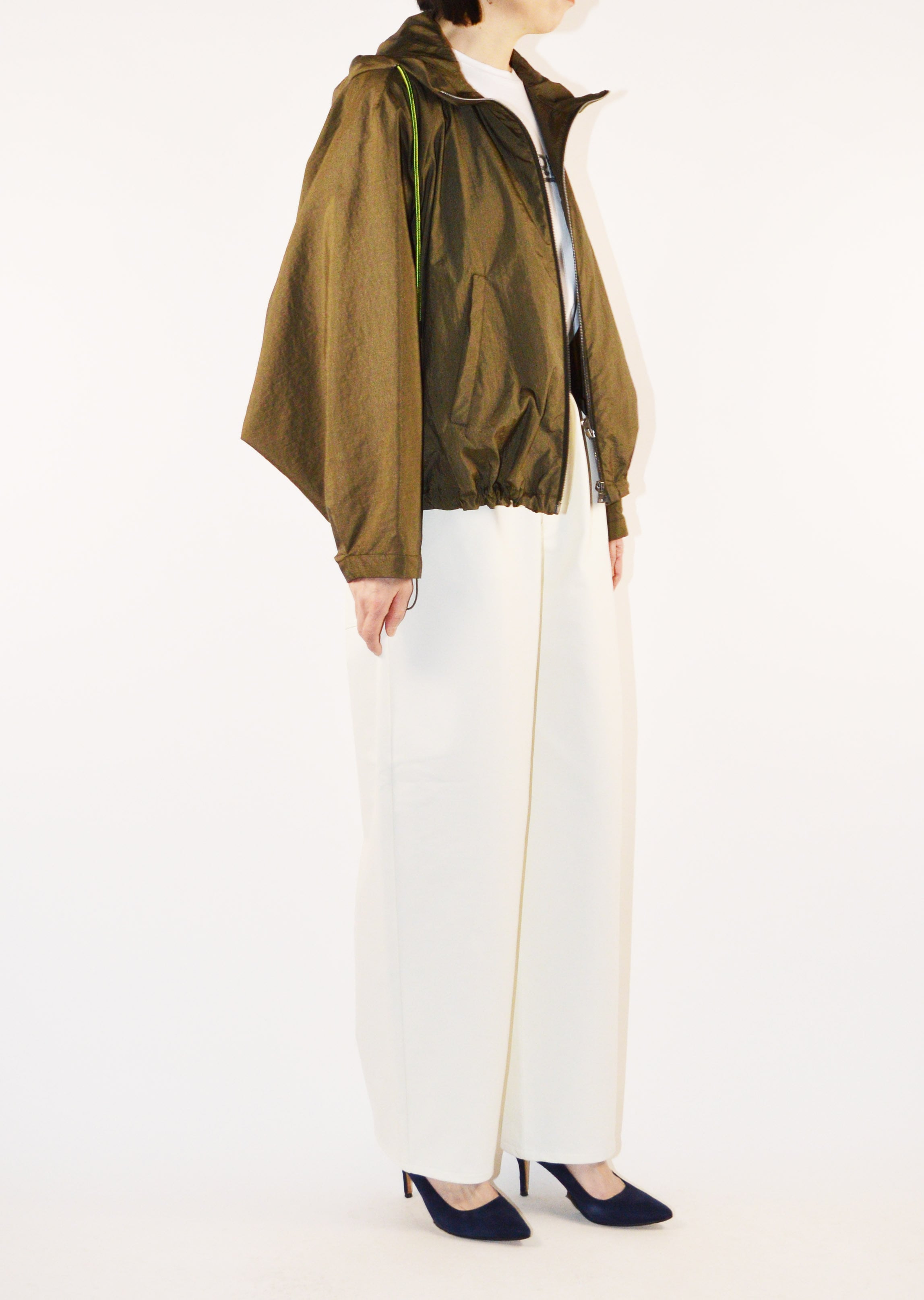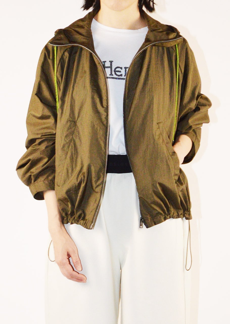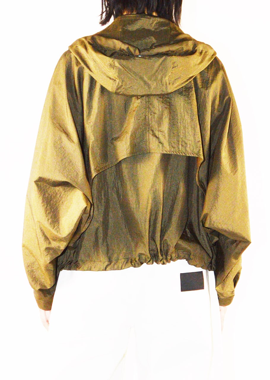 20デニールの超極細糸を用いた撥水ナイロンのフーデッドブルゾン。たっぷりとしたストームシールドから繋がる袖は、デザイン性に加えて快適な着心地をもたらしてくれます。メタリックな微光沢素材がスポーティなデザインに女性らしさと華やかを加えています。