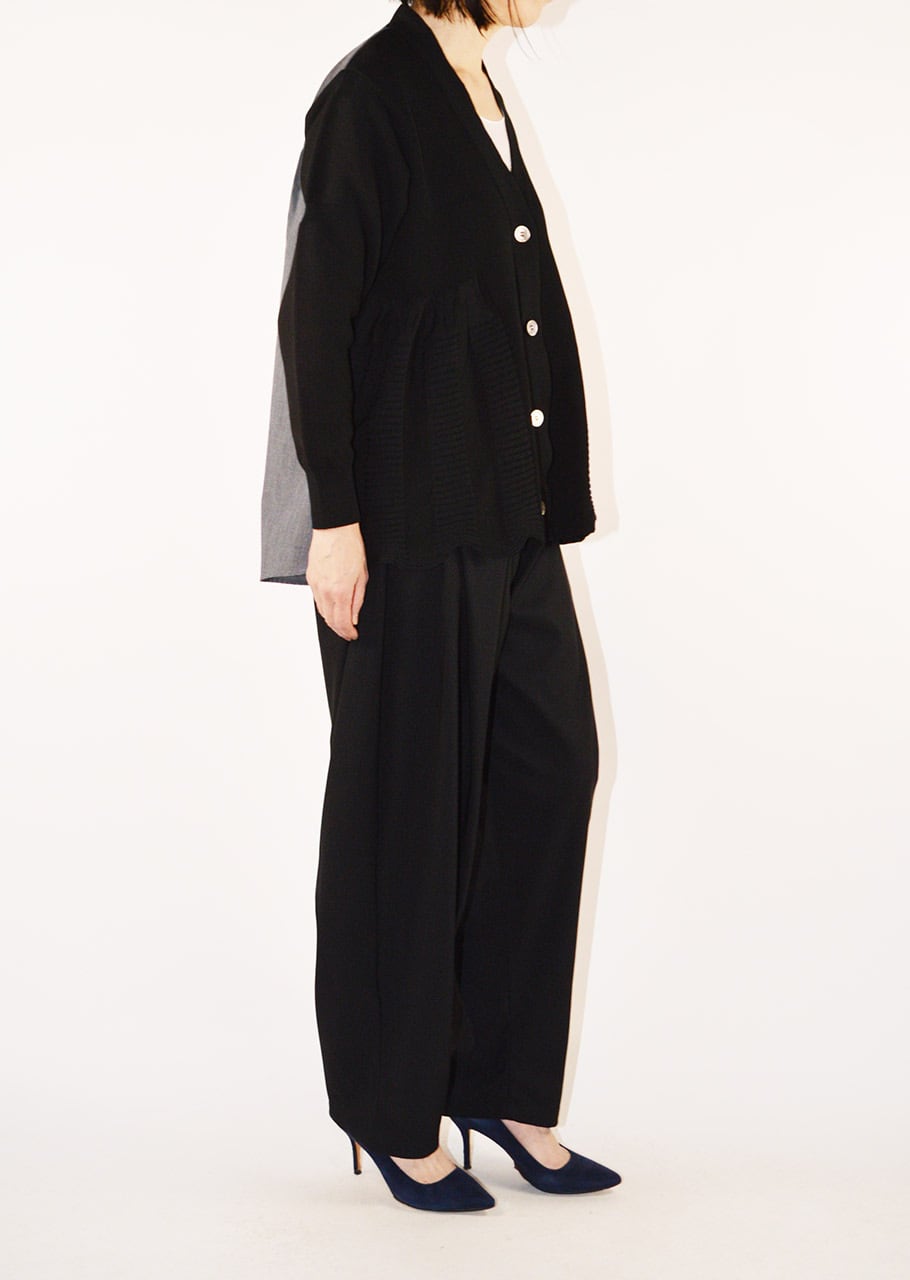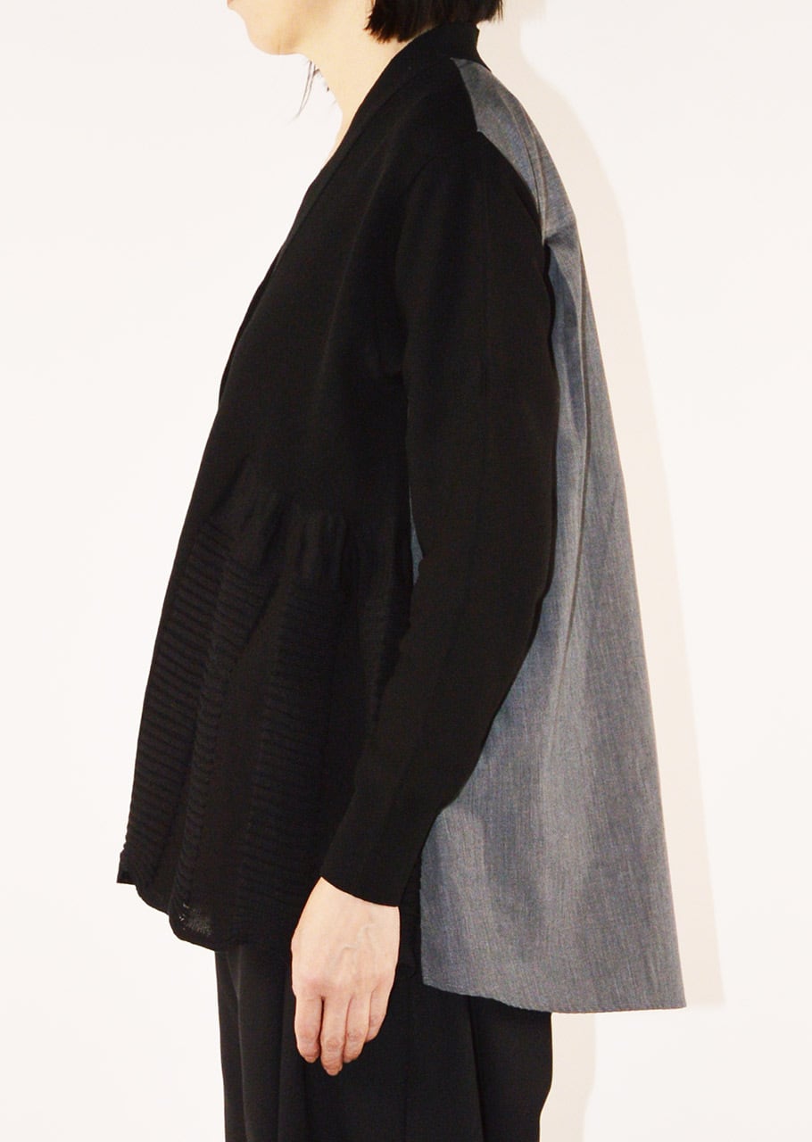 前後で素材を変えていることでコントラストが際立つ存在感あるカーディガン。インナー次第でロングシーズン楽しめる一着です。