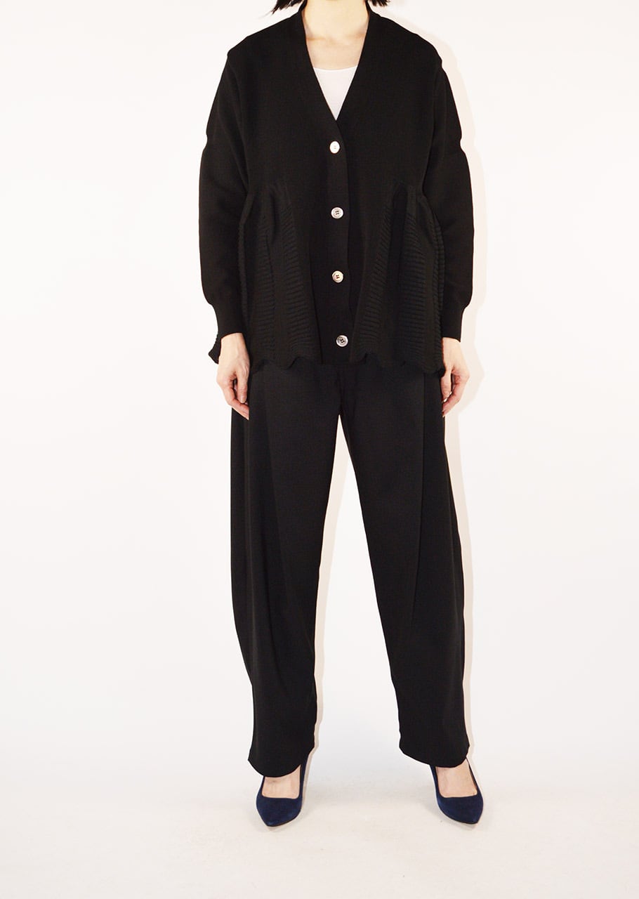 裾に向かってボリュームのあるフレアシルエットが印象的なVネックカーディガン。身体から離れる量感あるシルエットが動きによって立体的な表情を生み出します。背面にシャツ生地を組み合わせているのでニットと異なる張りと直線を楽しめます。