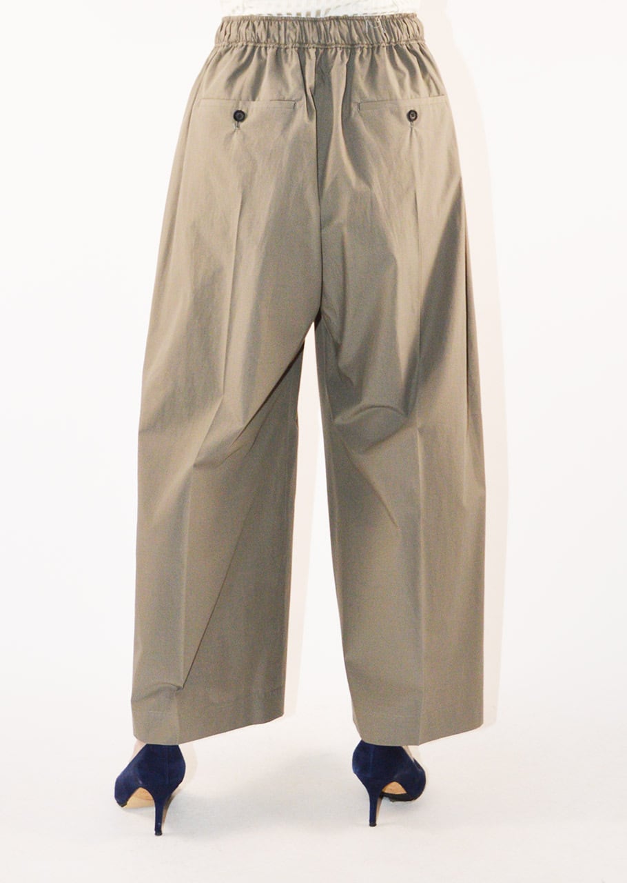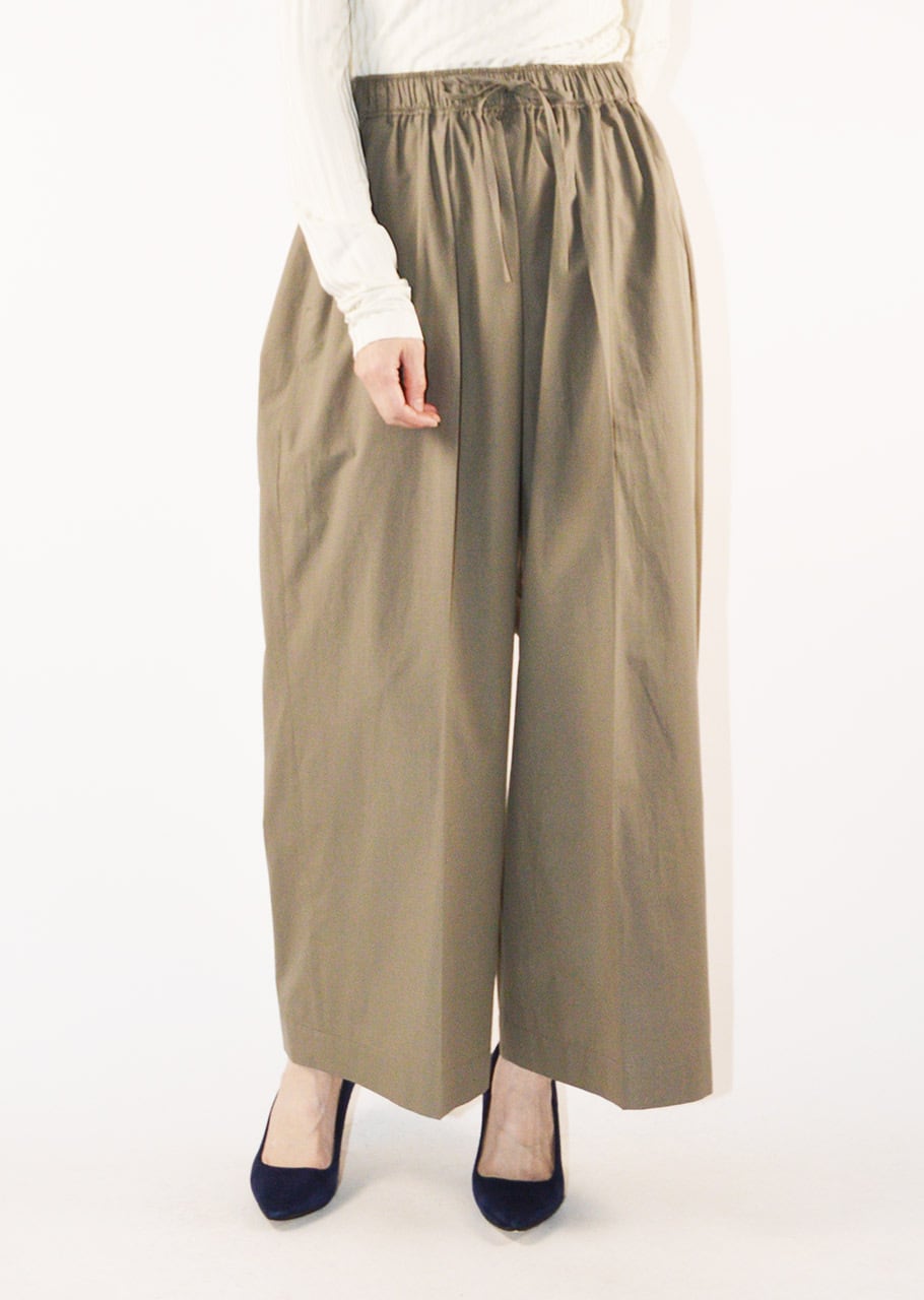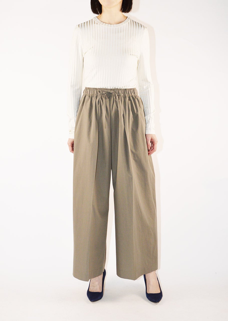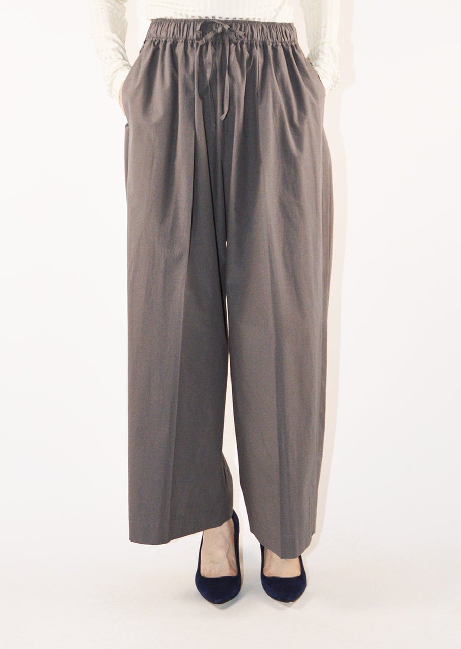 ブランドの定番モデルエクストラワイドパンツ。細番手の糸を高密度に織り立てられたコットン×ポリエステルの素材感。フロントに1タック、全体にギャザーが施されたディーテール。適度にカーブを描くシルエットで履いただけで雰囲気を生み出すパンツです。