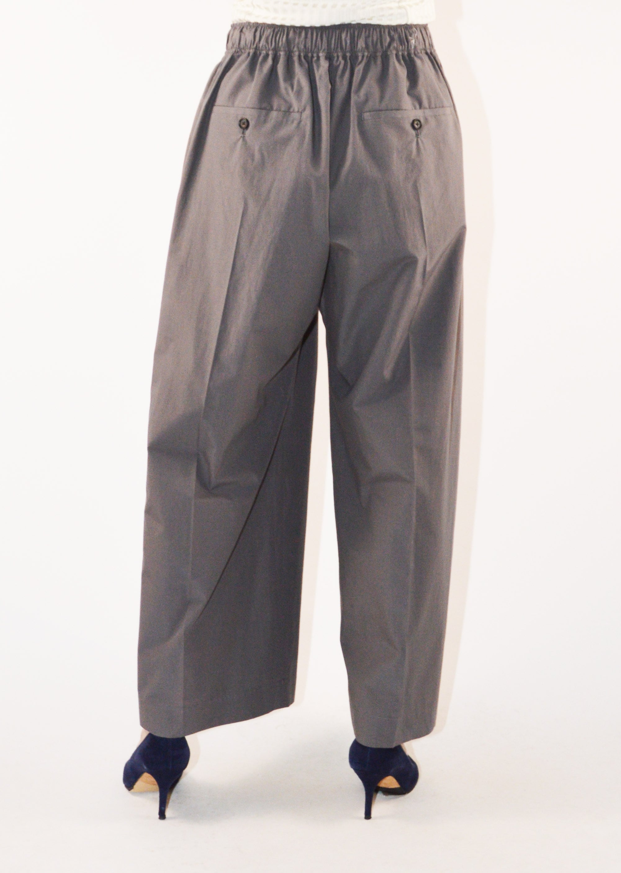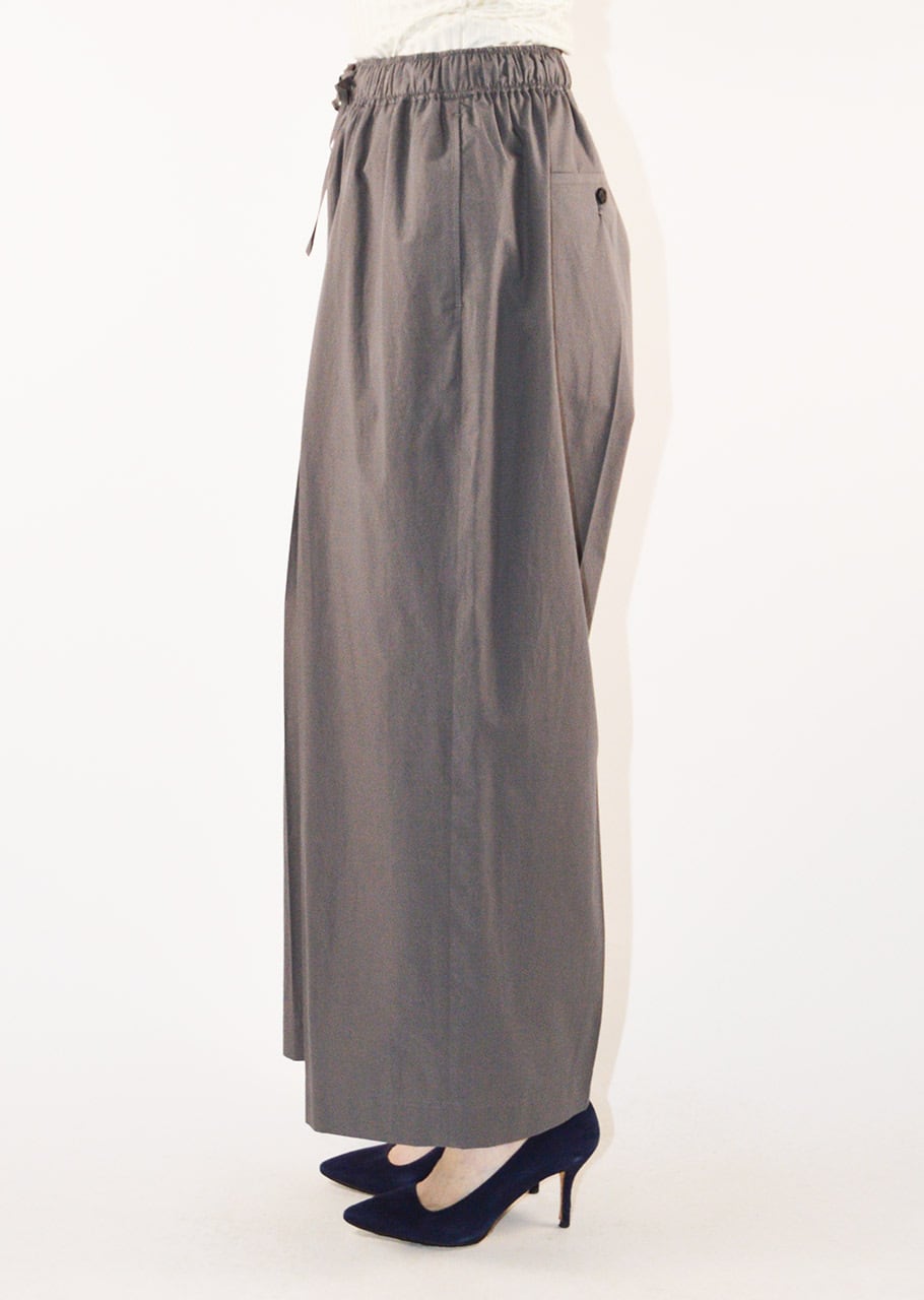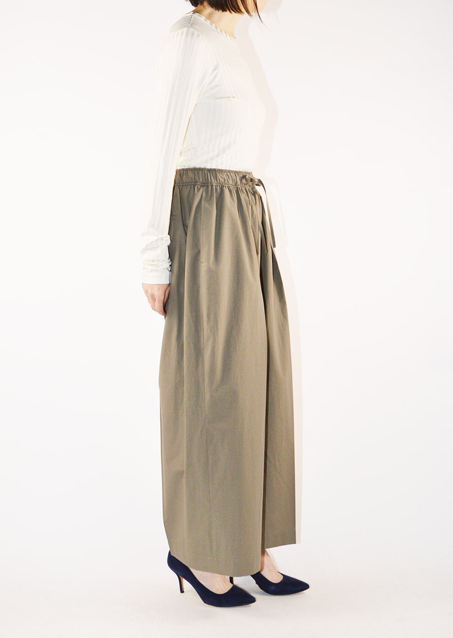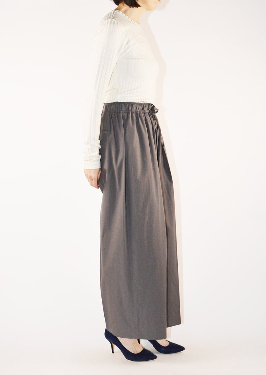 ブランドの定番モデルエクストラワイドパンツ。細番手の糸を高密度に織り立てられたコットン×ポリエステルの素材感。フロントに1タック、全体にギャザーが施されたディーテール。適度にカーブを描くシルエットで履いただけで雰囲気を生み出すパンツです。