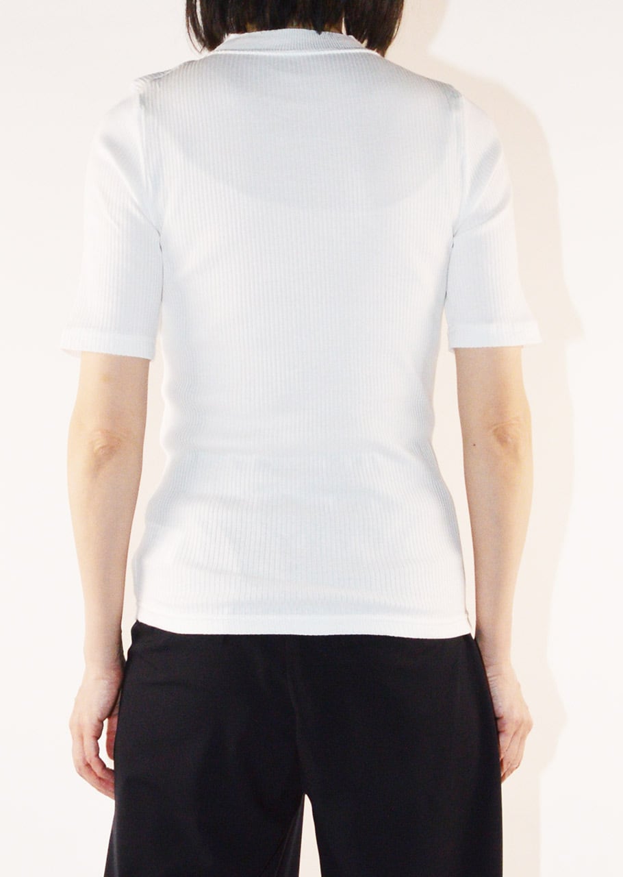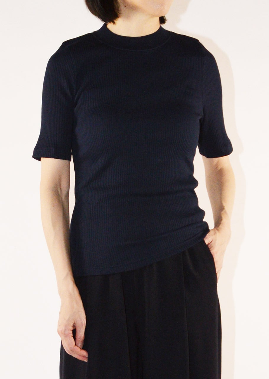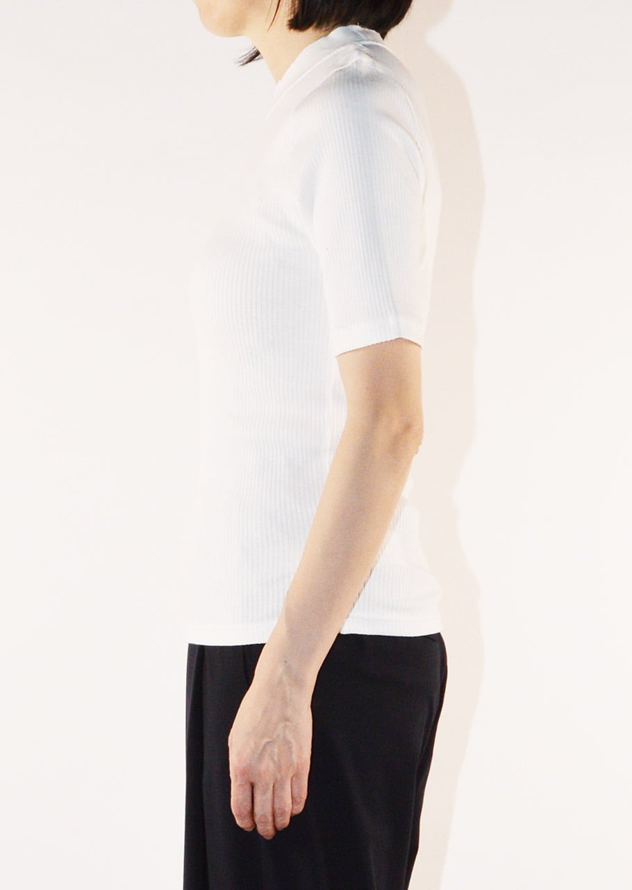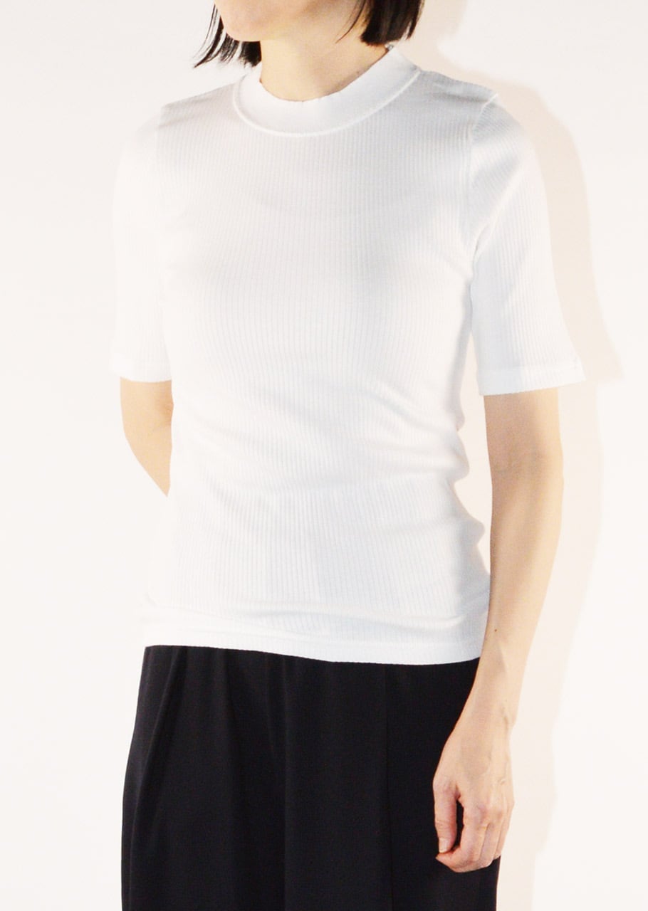 オーガニックコットンのリブクルーネックTシャツ。上質な素材をつかい美しい編み立てで仕上げられたモデル。ネックのリブをしっかりさせることでニットのような表情に仕上げられています。五分袖丈になっていて腕周りをすっきり見せてくれるバランスもうれしい。