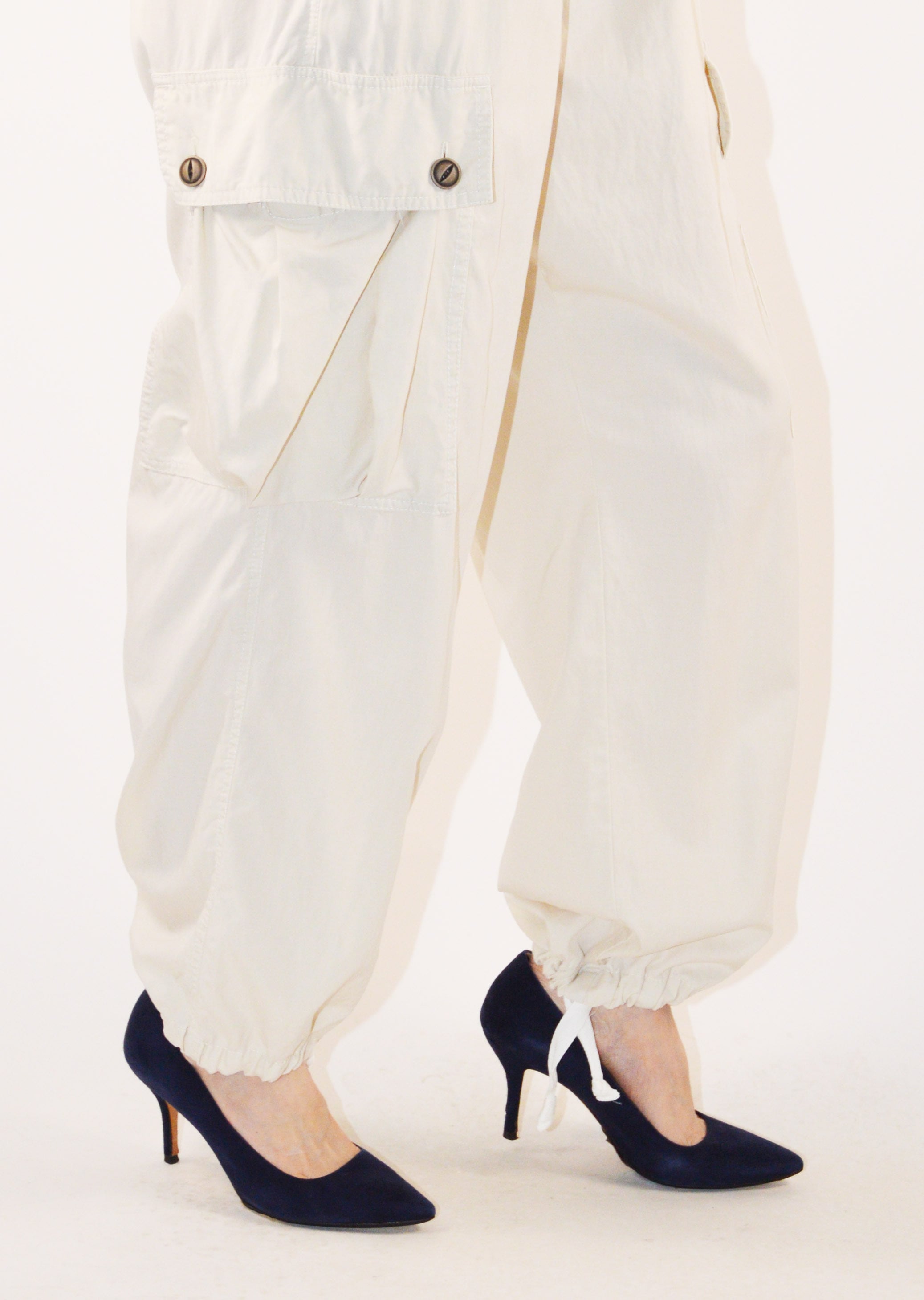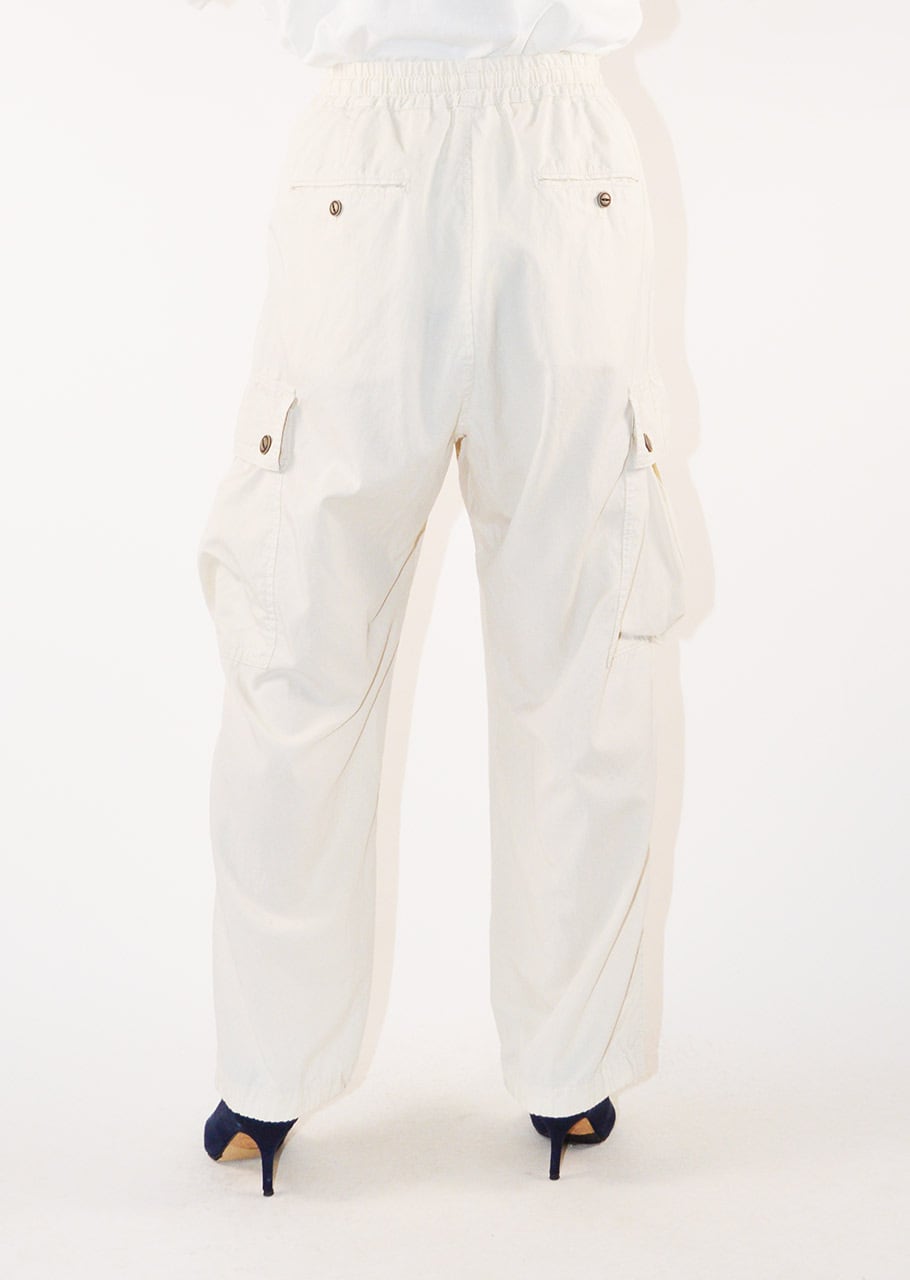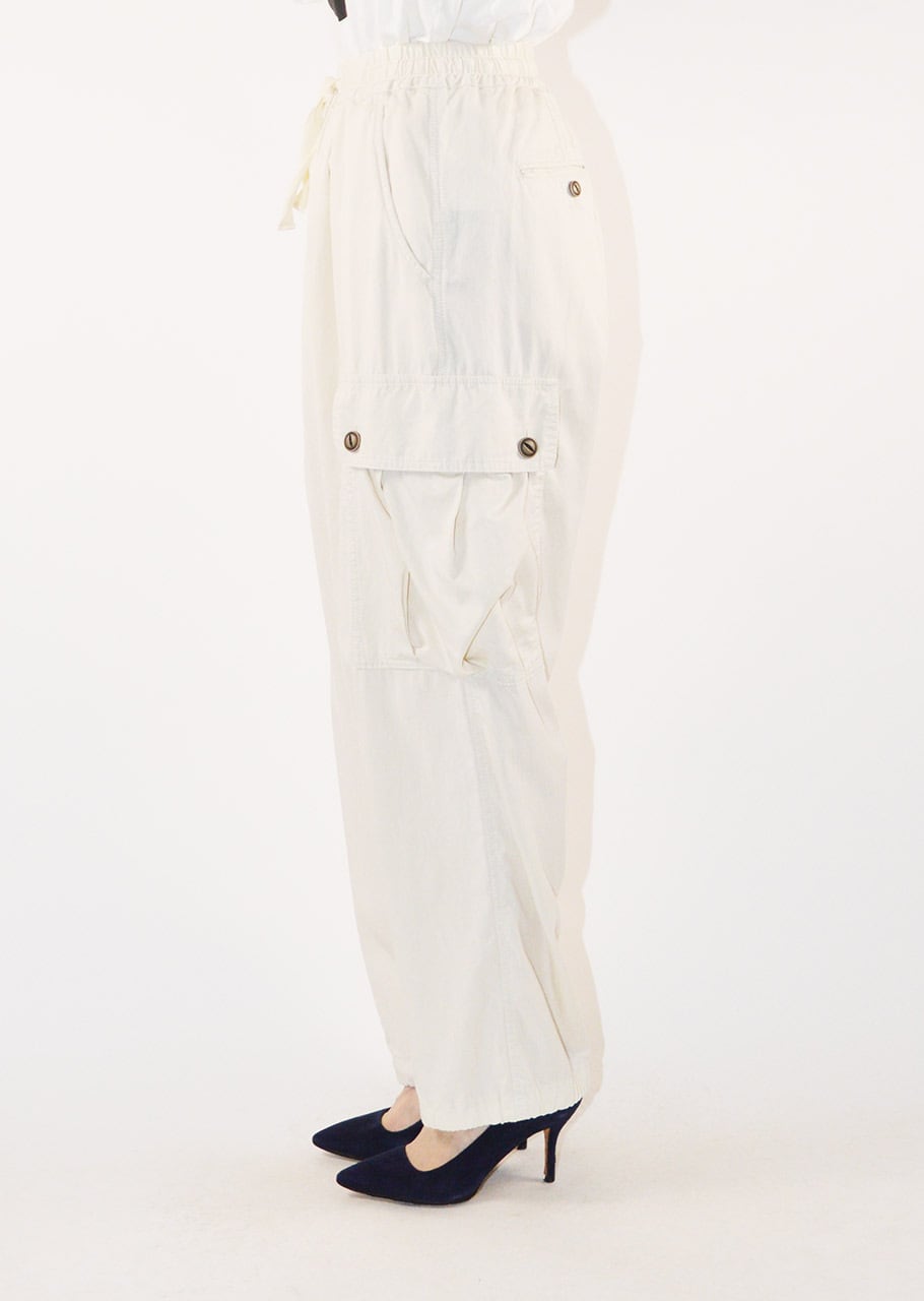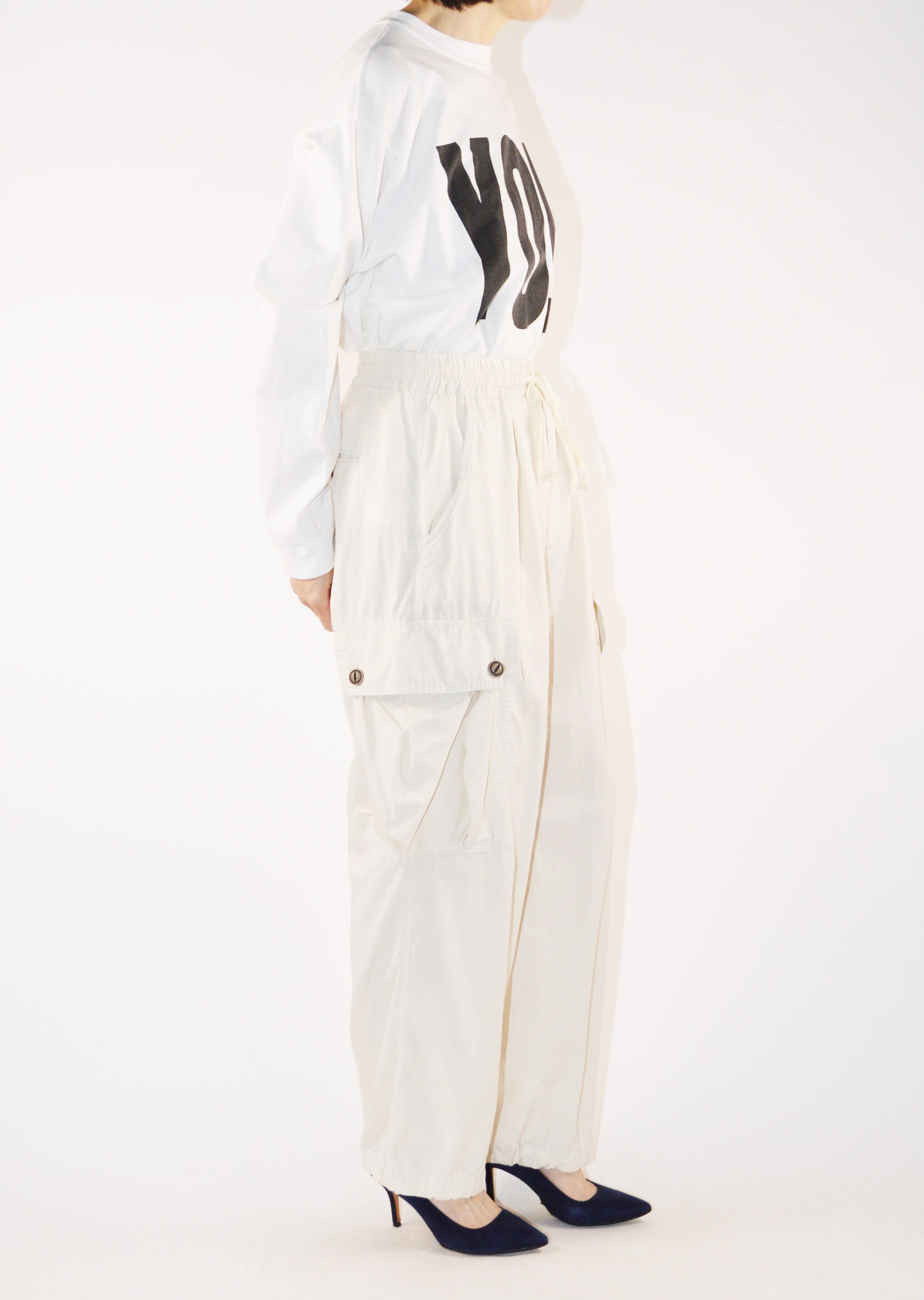 環境に配慮された製法で作られたテンセルとコットン素材を使用したカーゴパンツ。洗い込むことでうまれる独特の風合いやカラーリングを追求した一着。ワイドシルエットで裾のスピンドル調整でシルエットの変化を楽しめます。