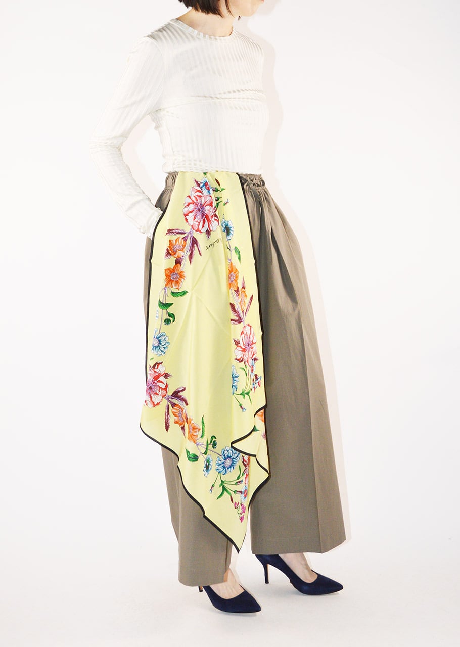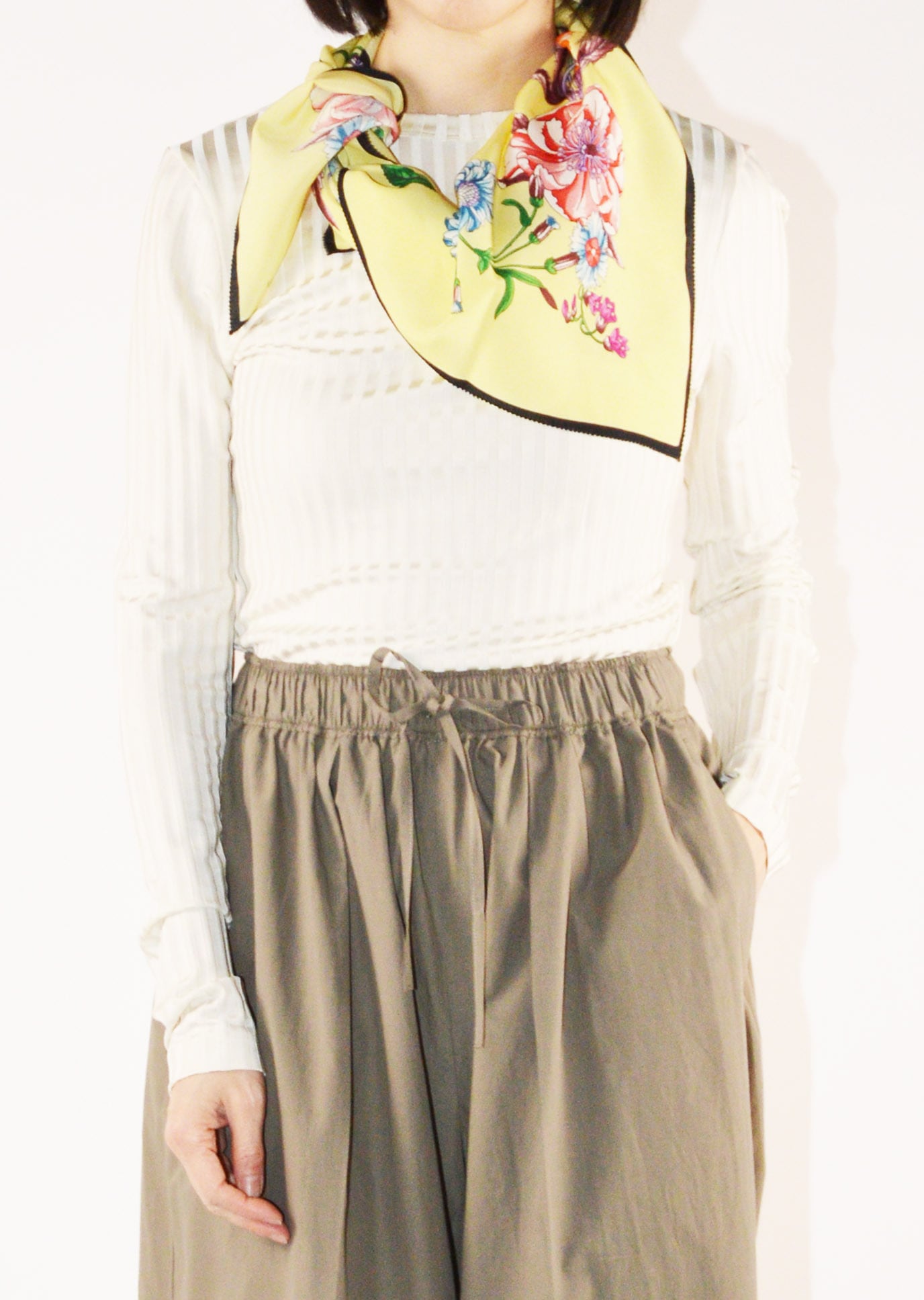 シルク素材100%のスカーフ。67cm×67cmのコンパクトなサイズ感なので様々にアレンジ可能です。プリントやカラーリングをスタイリングのアクセントに、ジャケットからTシャツまで幅広いアイテムに合わせて楽しめるスカーフです。