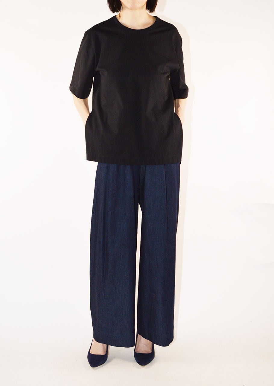 布帛のニュアンスを持ち合わせたジャージー素材のショートスリーブカットソー。適度にゆとりのあるボディラインでリラクシーなムードも持ち合わせています。バックスタイルのホール状のカットと裾に施されたスリットが全体のアクセントとなっています。