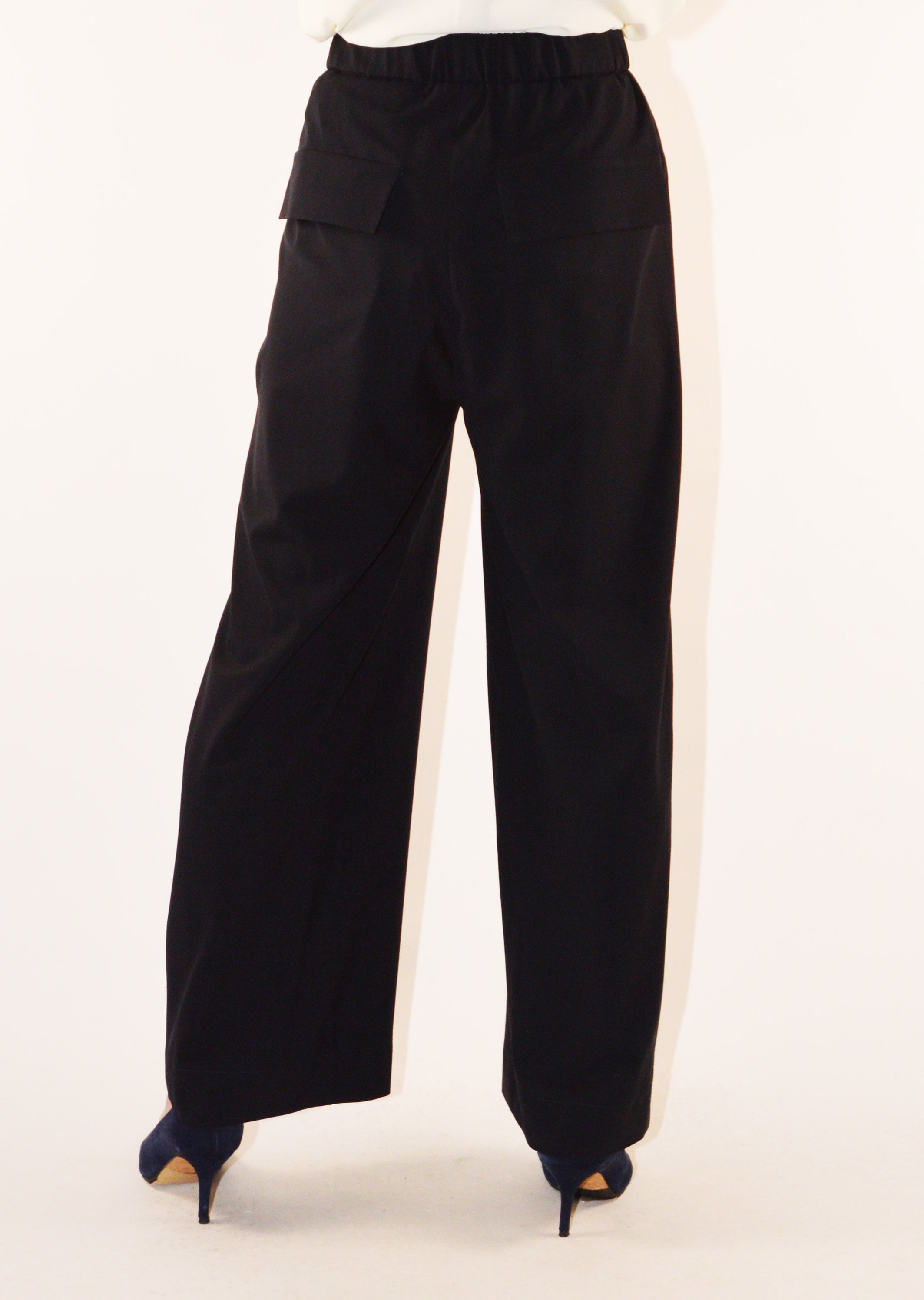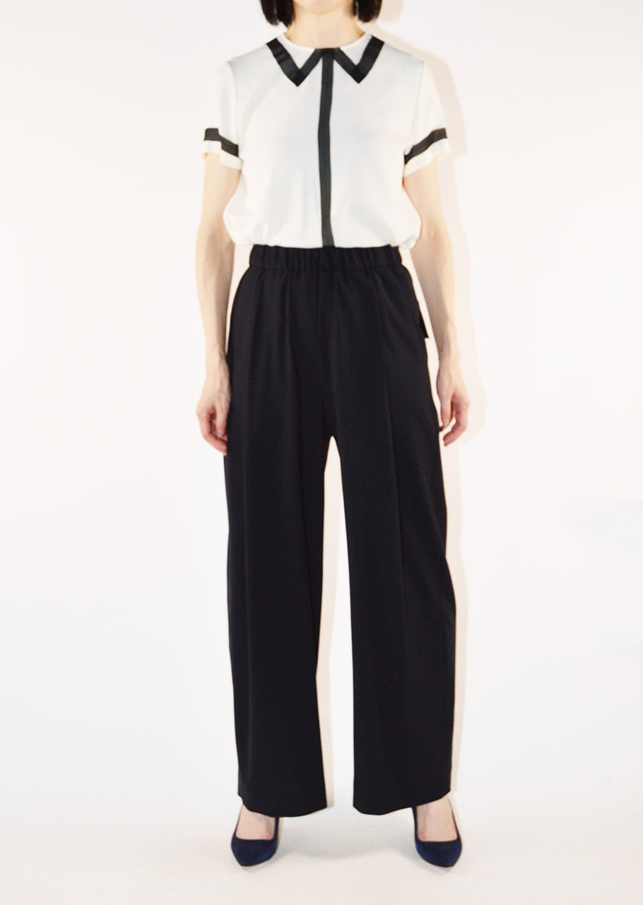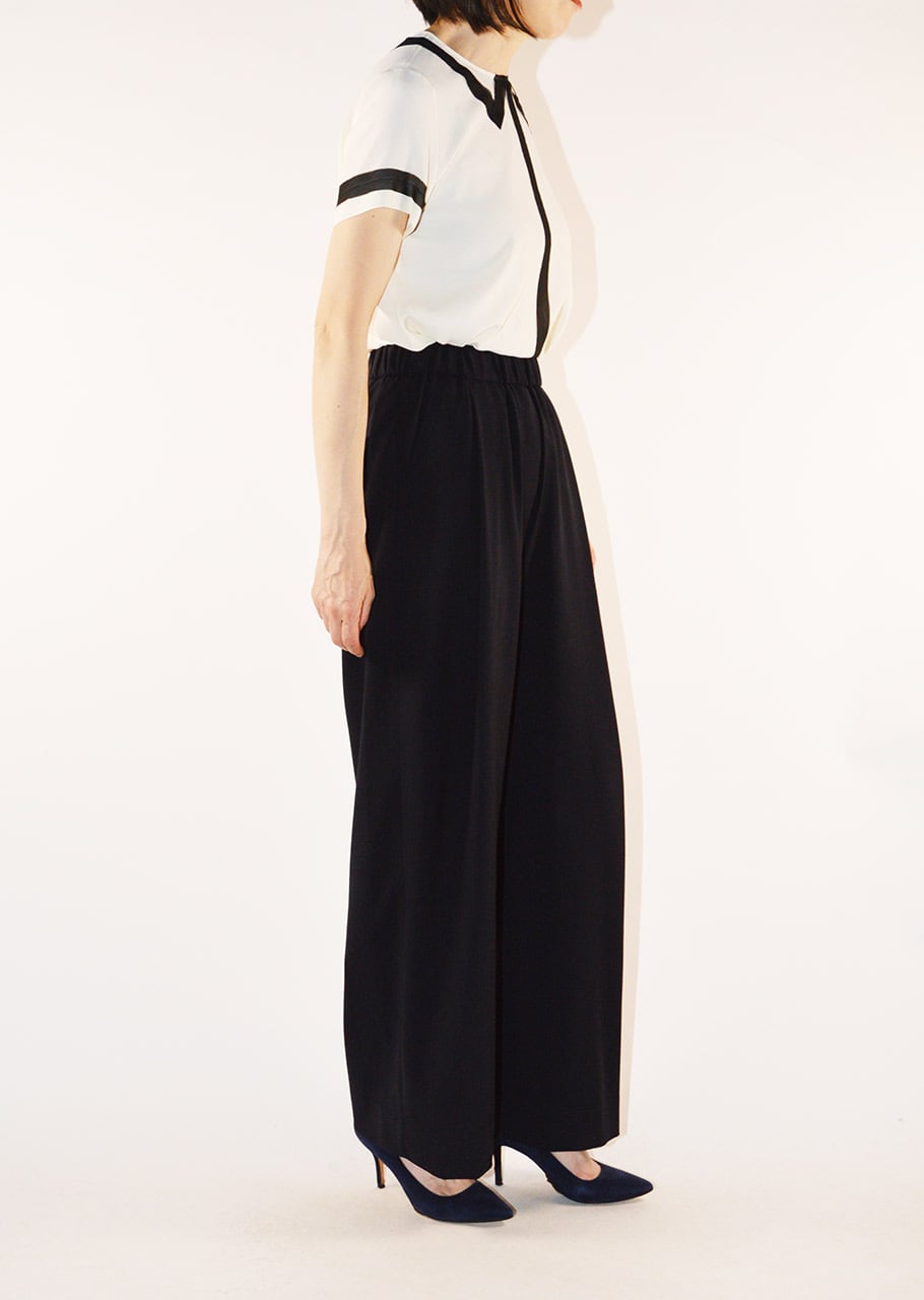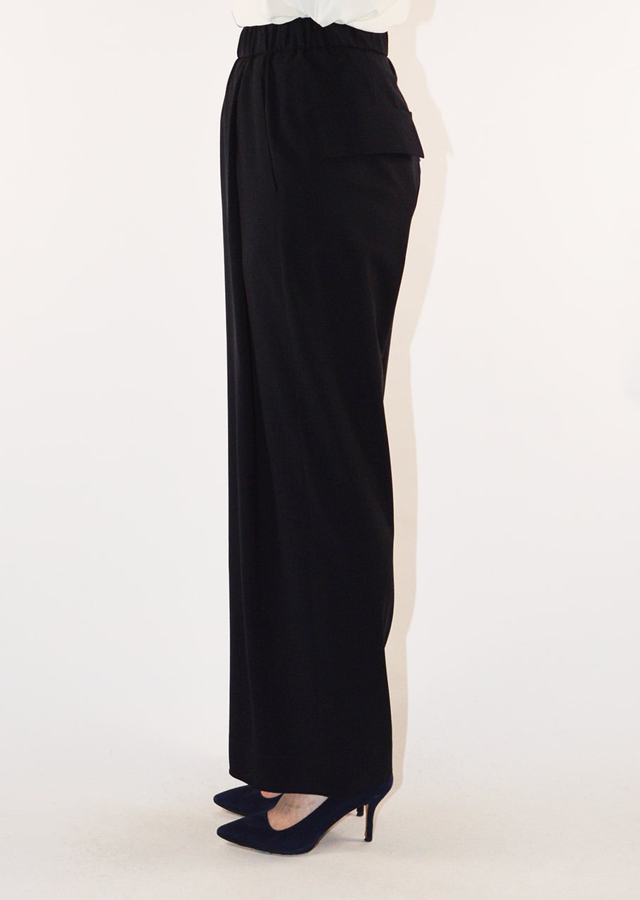 上質でなめらかなウール素材を使用した美しいシルエットのワイドパンツ。ウエストにはギャザーとタックの両方がほどこされ立体的なフォルムが美しいデザインです。ゴムの仕様のウエストで履き心地が良いのも嬉しい。同素材のブラウスを合わせたセットアップスタイルもおすすめです。