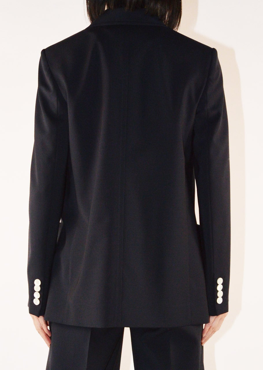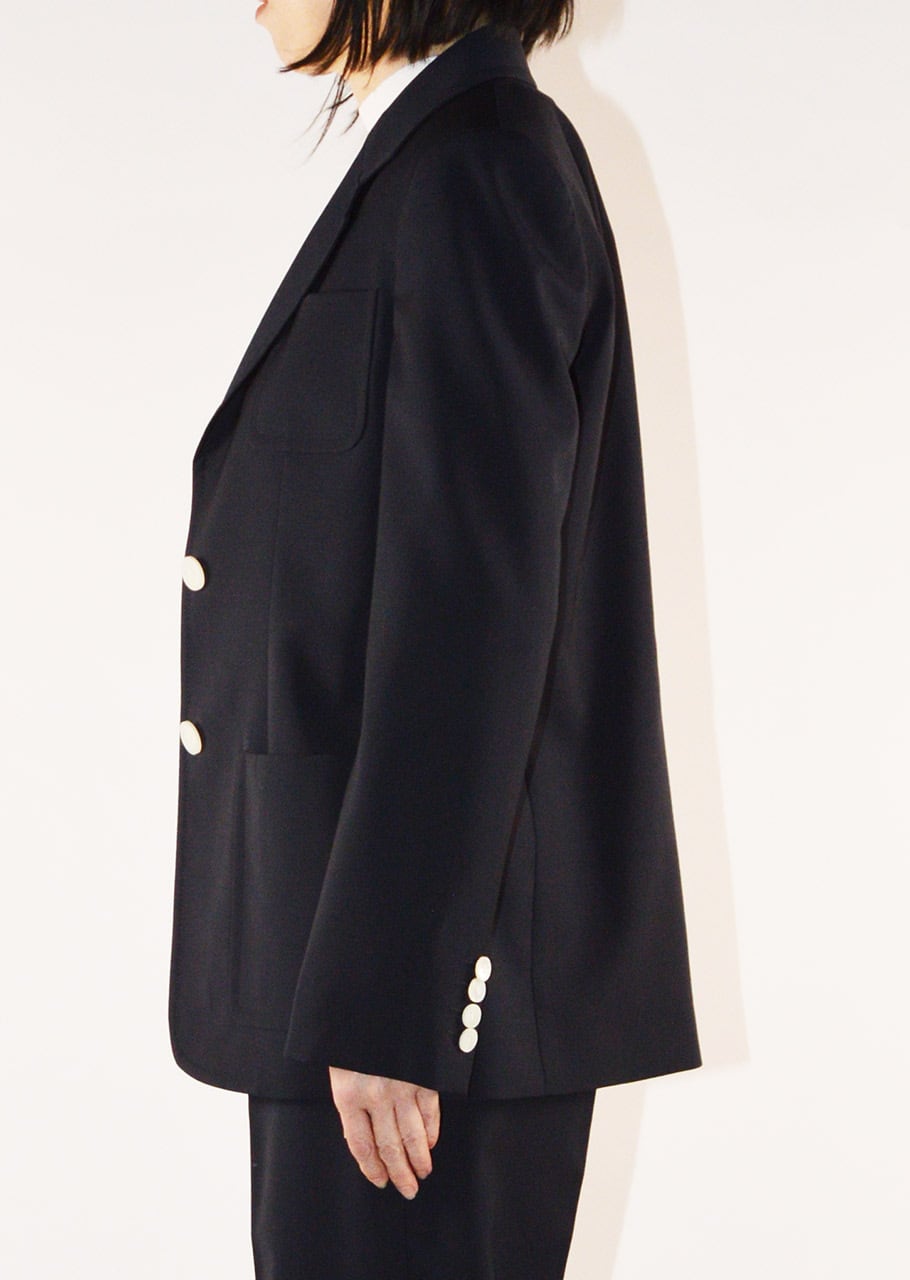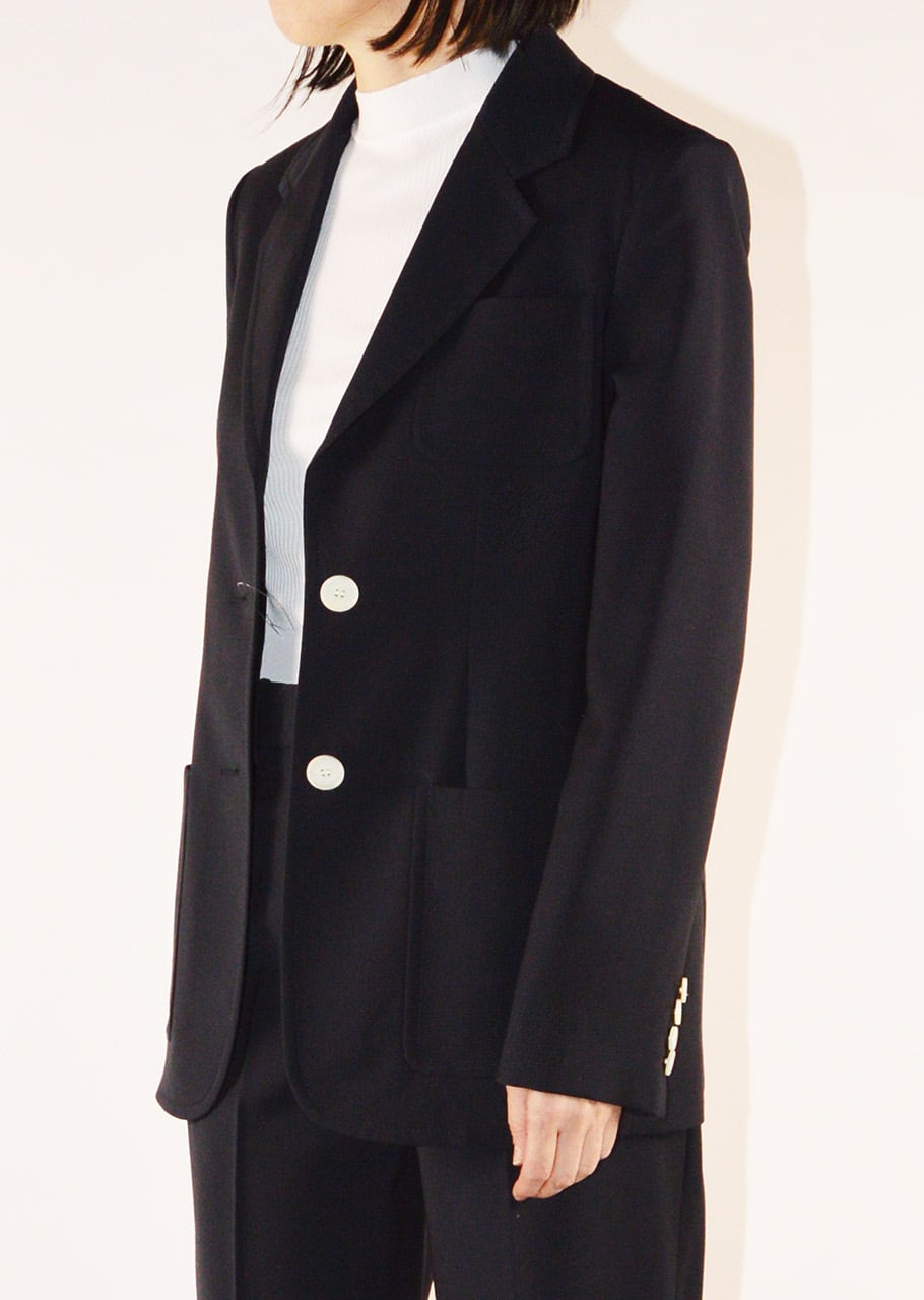 ウール×ナイロン×ポリウレタン素材のジャケット。厳選された上質な細番手の糸を高密度で織りたてたことで生まれるさらりとした肌触り。すっきりとしたボディラインがきれいに見える洗練されたシルエット。ボタンのホワイトカラーが全体のアクセントとなっています。