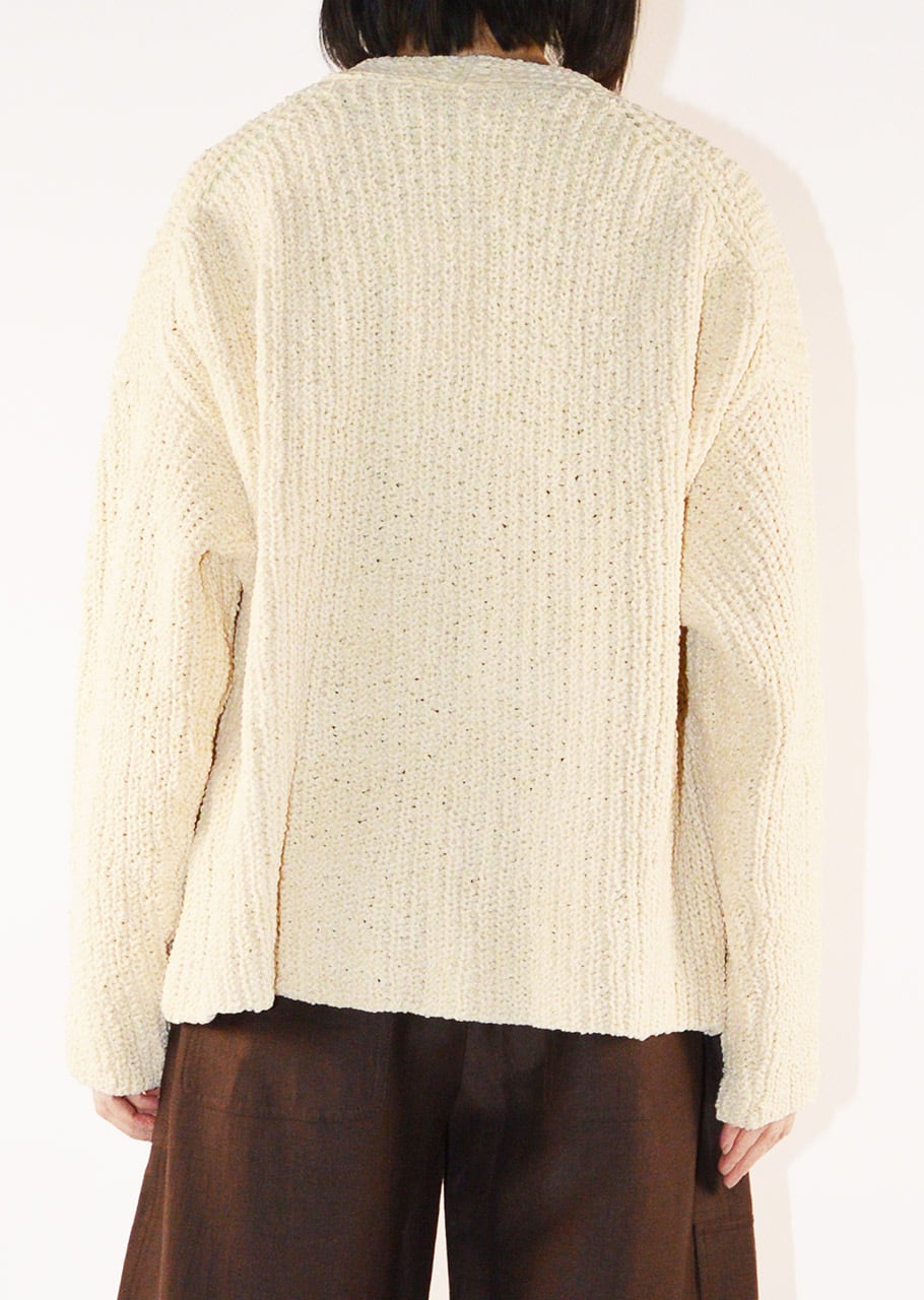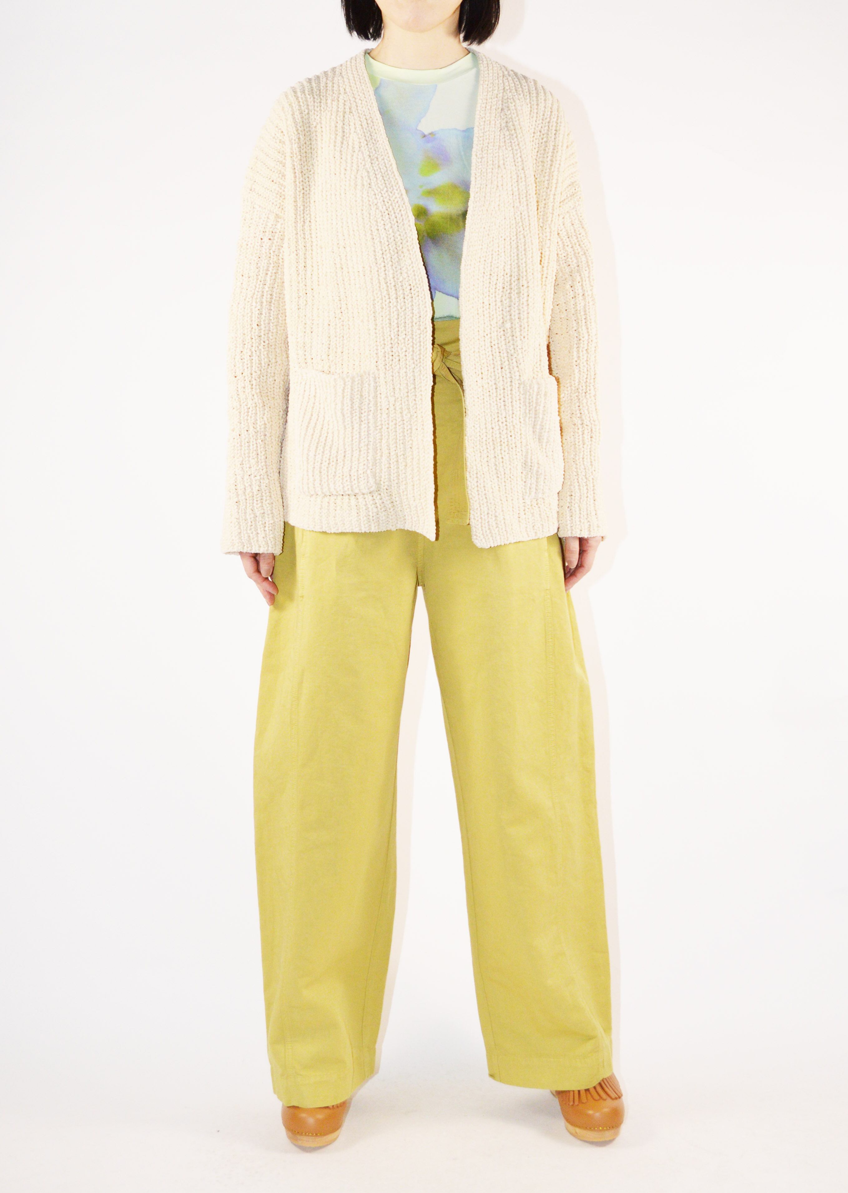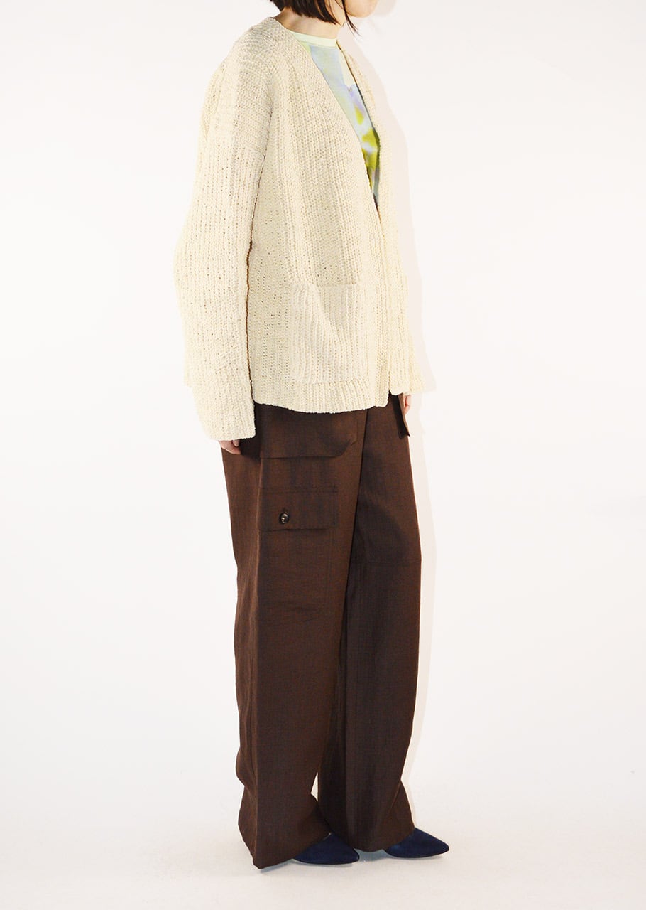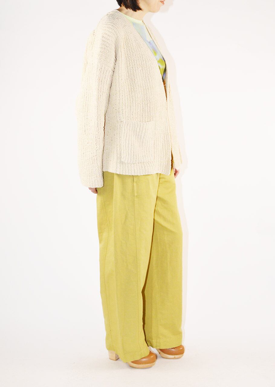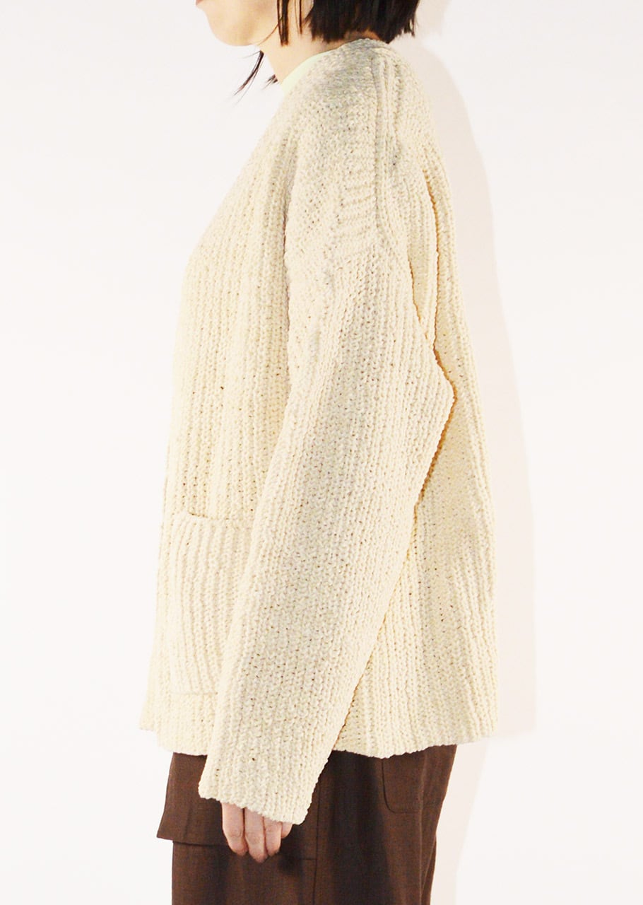 コットン100%のVネックカーディガン。肉厚ながらも軽い仕上がりの一枚となっています。適度にゆとりのあるボディラインでボタンのないデザイン。合わせるインナー次第でロングシーズン楽しめるデザインとなっています。