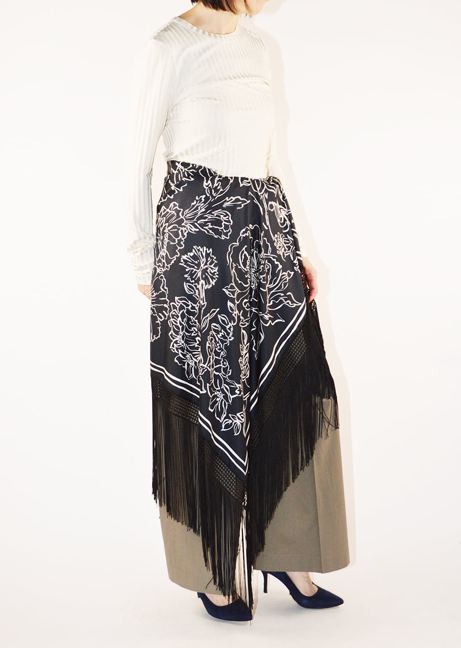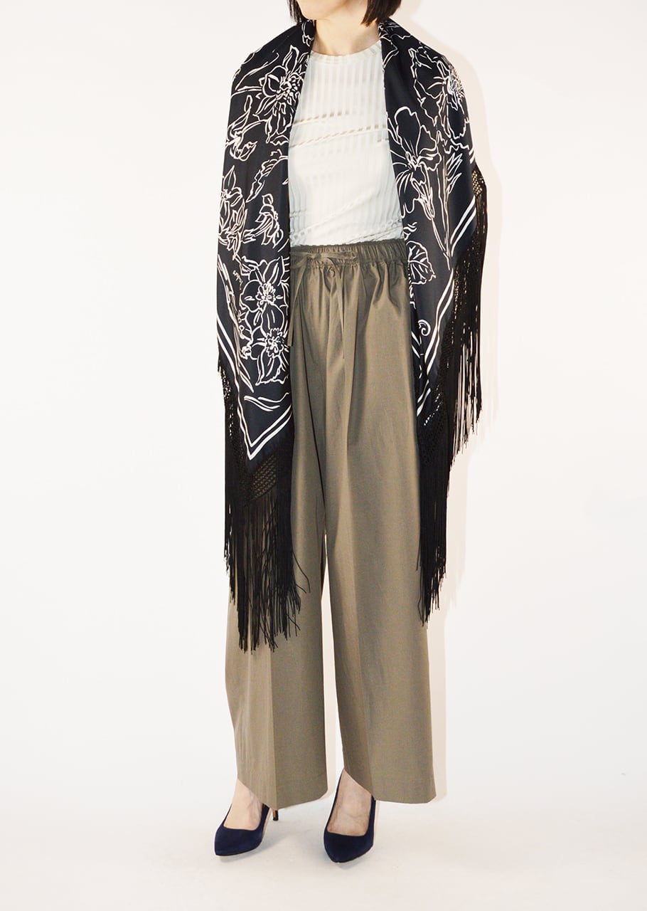 シルク素材100%のスカーフ。長めのフリンジがあしらわれた90cm×90cmのサイズ感なので様々にアレンジ可能です。プリントをスタイリングのアクセントに、ジャケットからTシャツまで幅広いアイテムに合わせて楽しめるスカーフです。