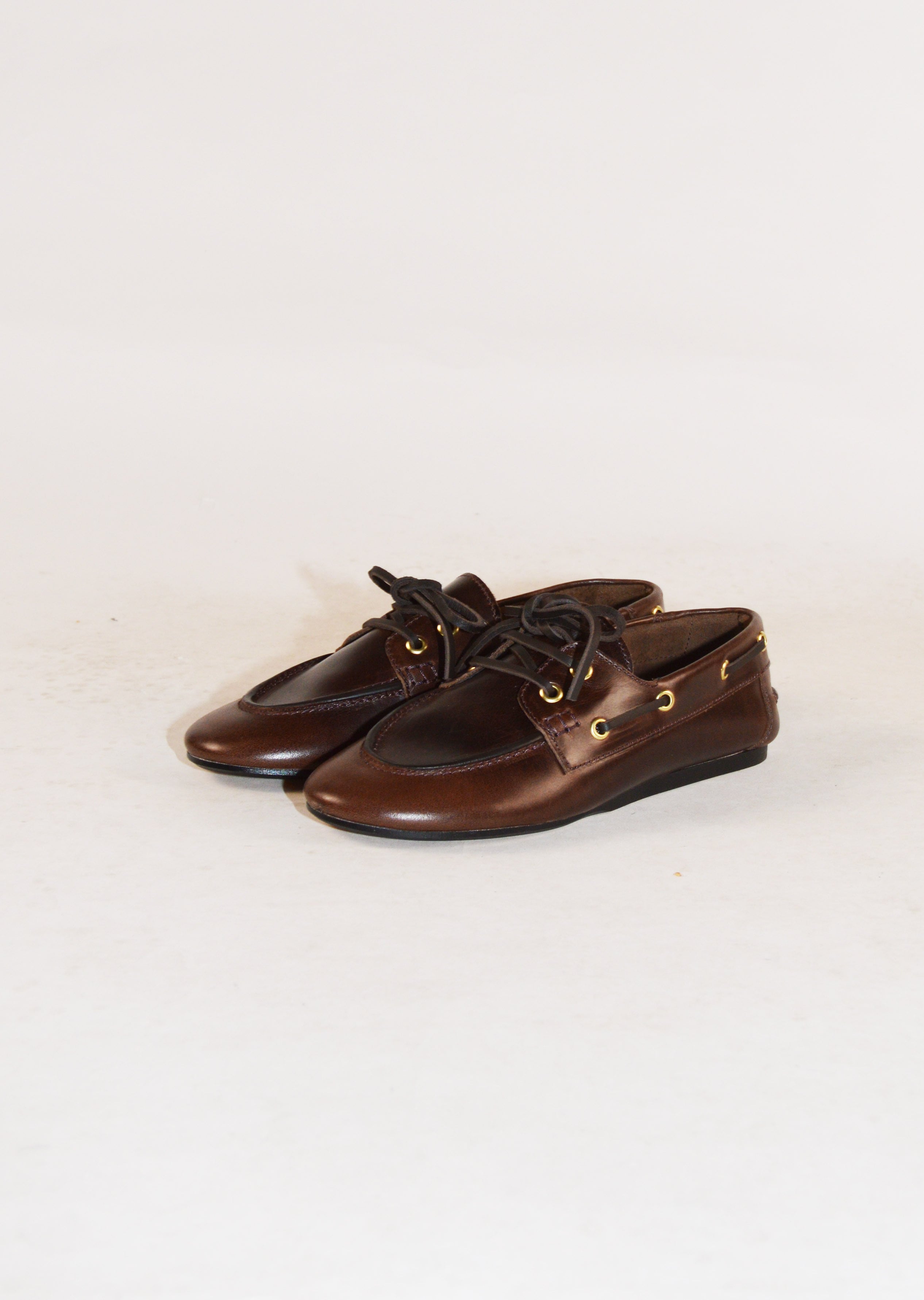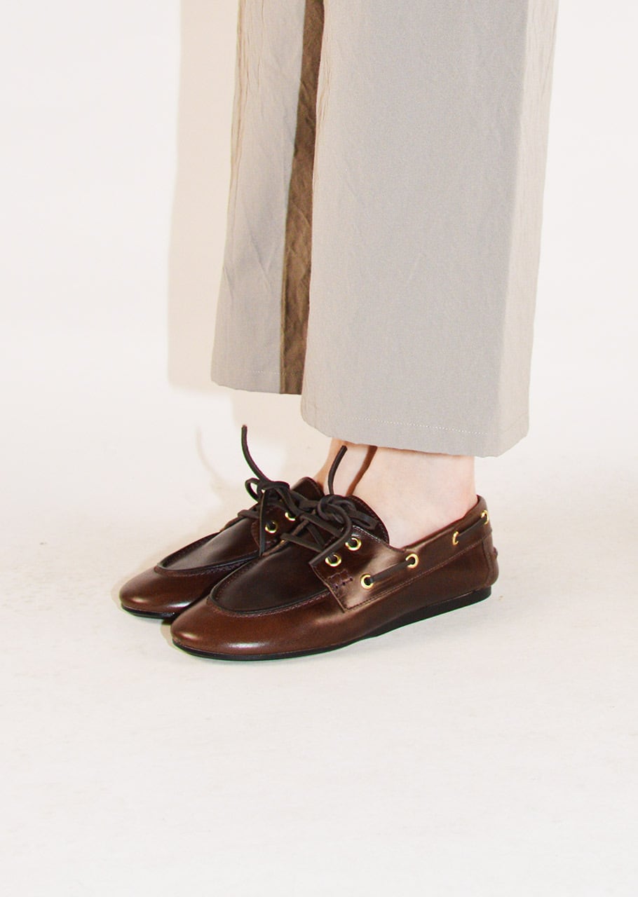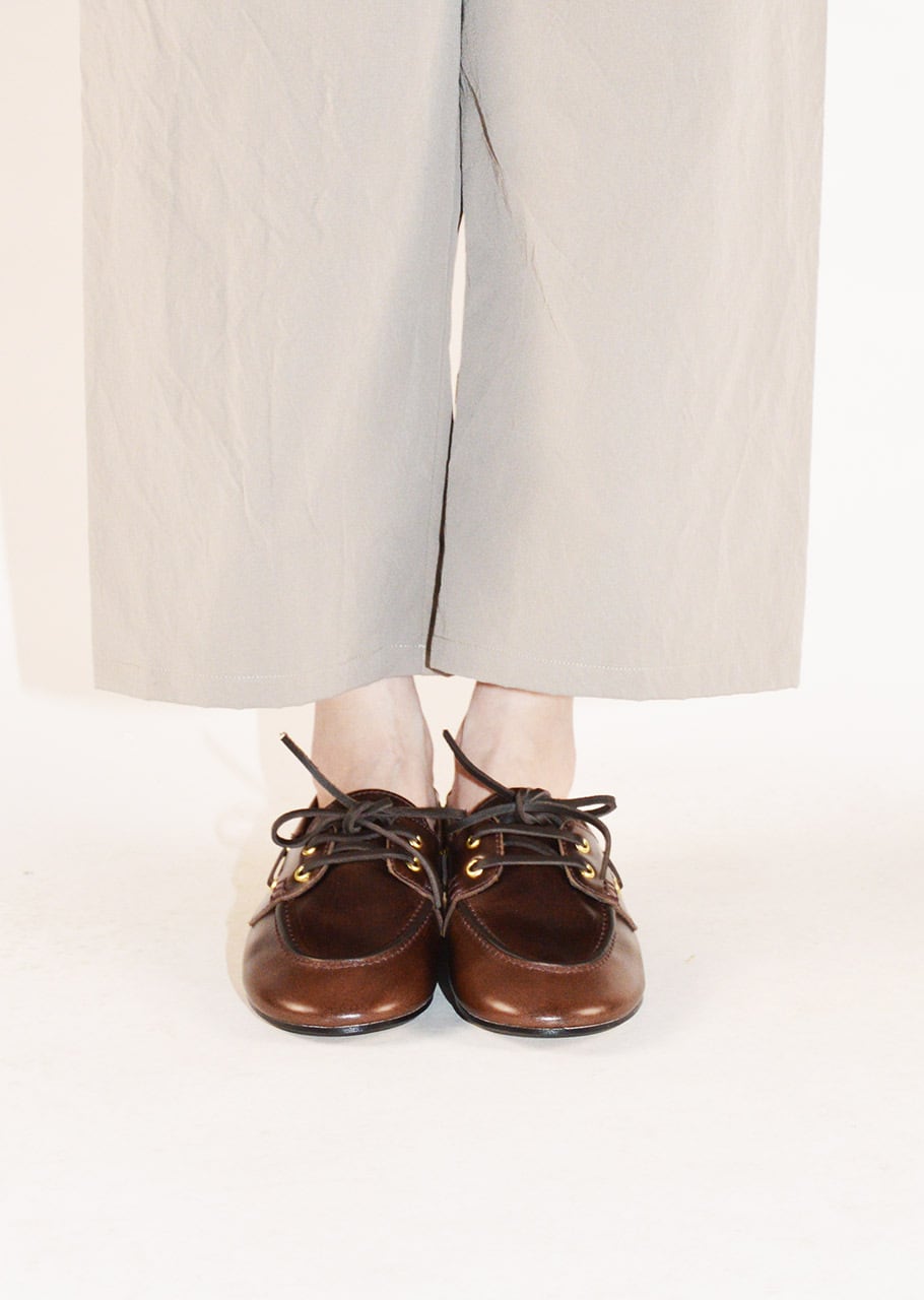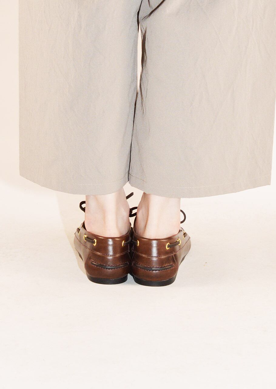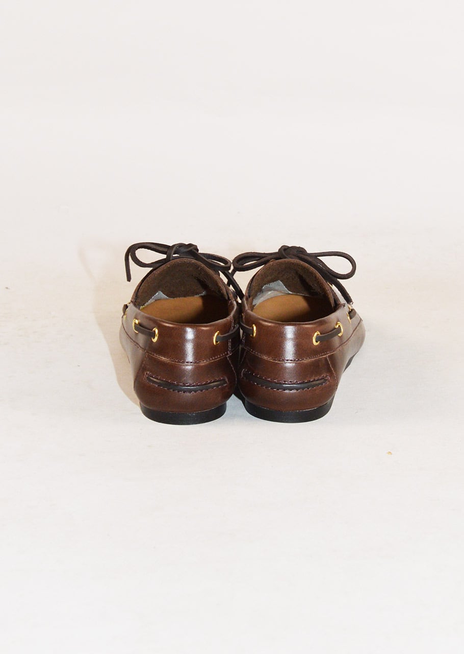柔らかなレザーが特徴的なモカシンシューズ。包み込まれるような履き心地が魅力です。ゴールドカラーのハトメ金具がさりげないアクセントをプラス。ヴィンテージ感のあるレザーの質感もとても味わい深い一足です。
