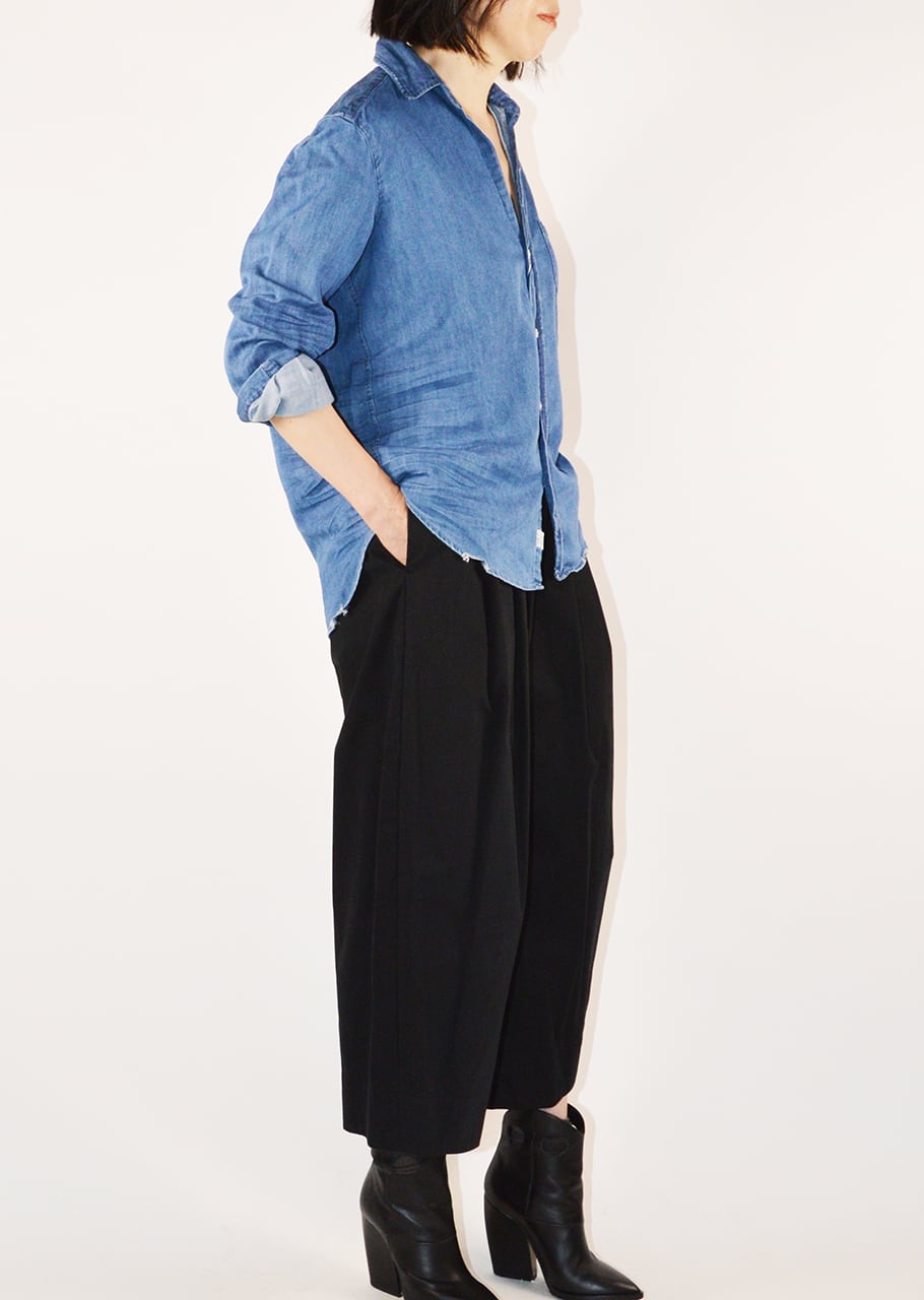 たっぷりとしたカッティングはタックインしたり、裾を結んだり、どんなものにも羽織ることができるベストセラー。やわらかなデニム素材はとても柔らかな肌触り。シーズンを問わず活躍すること間違いなしのピースです。