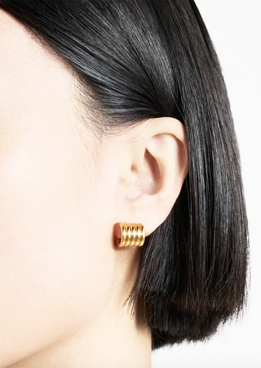 DEHANCHE (デハンシェ)のシグネチャーのベルトのフォルムを踏襲した彫刻的な作品。洗練された建築的な5つのリングが完璧なバランスで吊り下げられています。ホリーホック・ベルトの象徴的な金具にインスピレーションを得たこの作品は、腰に巻くことから耳に着けることでとよりイメージを昇華させています。