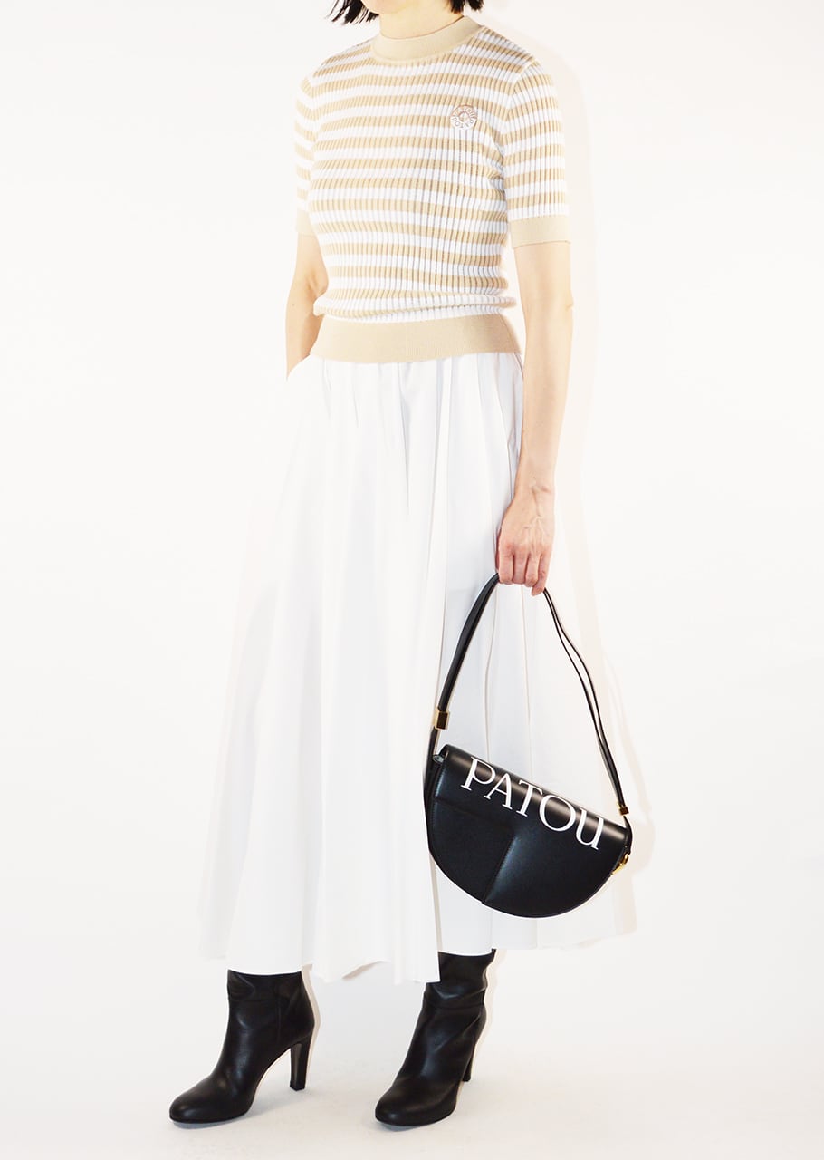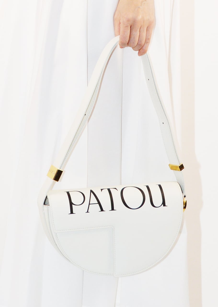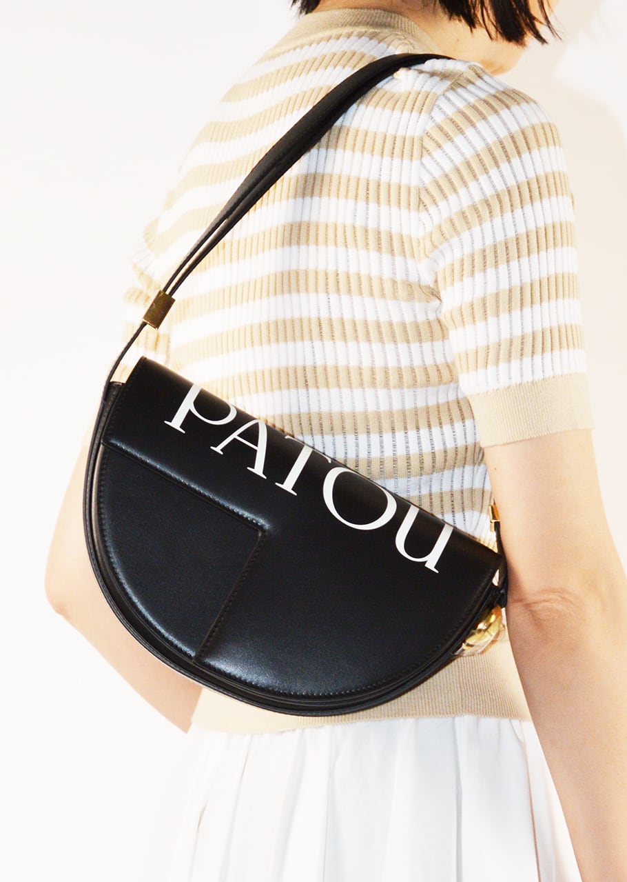 スムースレザーでできたハンドバッグ。トップ全体にatouロゴプリントが施されています。JPモノグラムにインスピレーションを得た幾何学的なカットの半円形フォルム。サイドにゴールドトーンのメタルパーツとJPモノグラムのディテールが施されています。