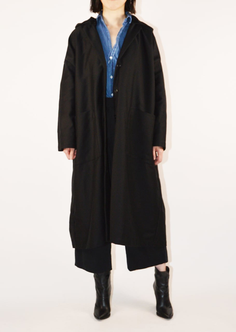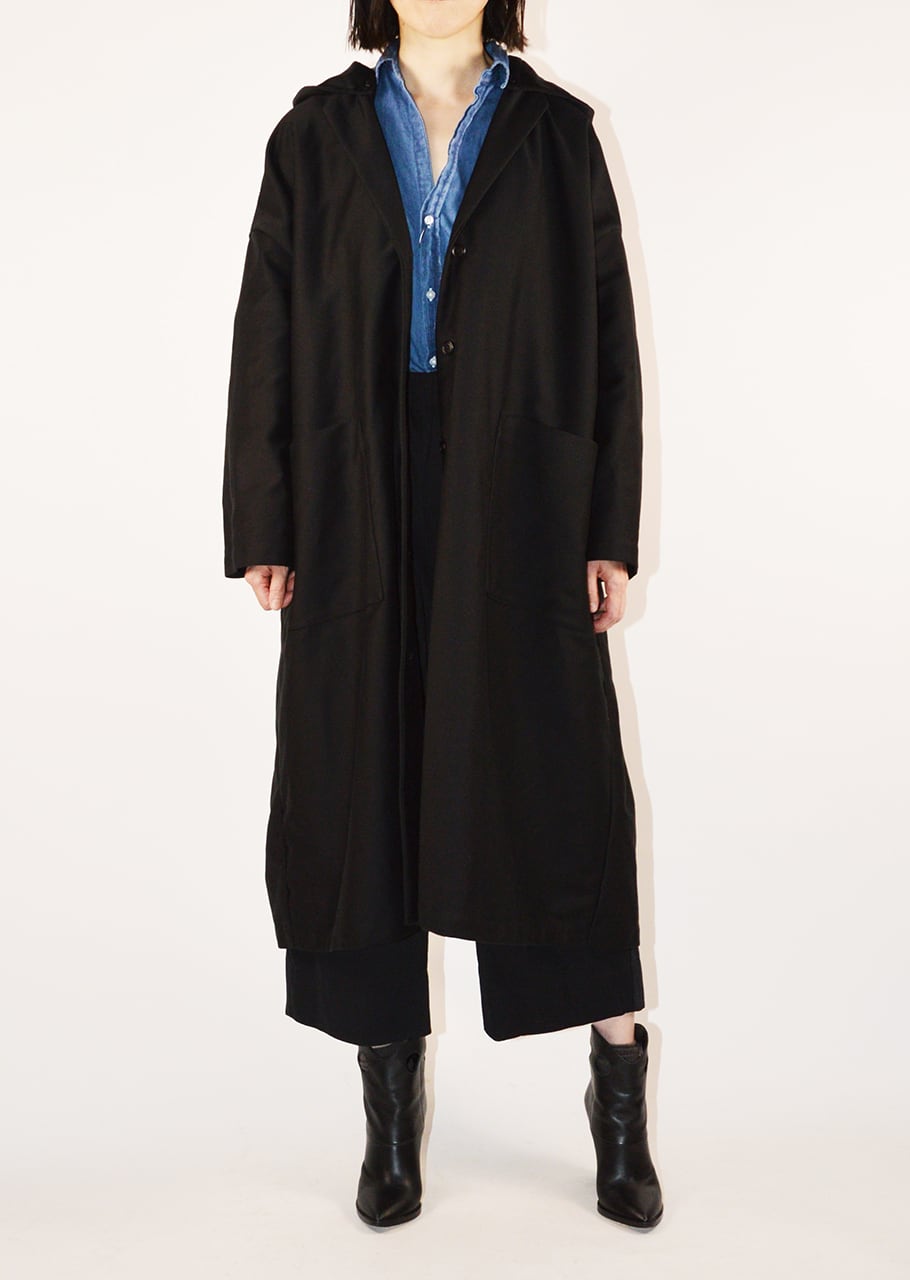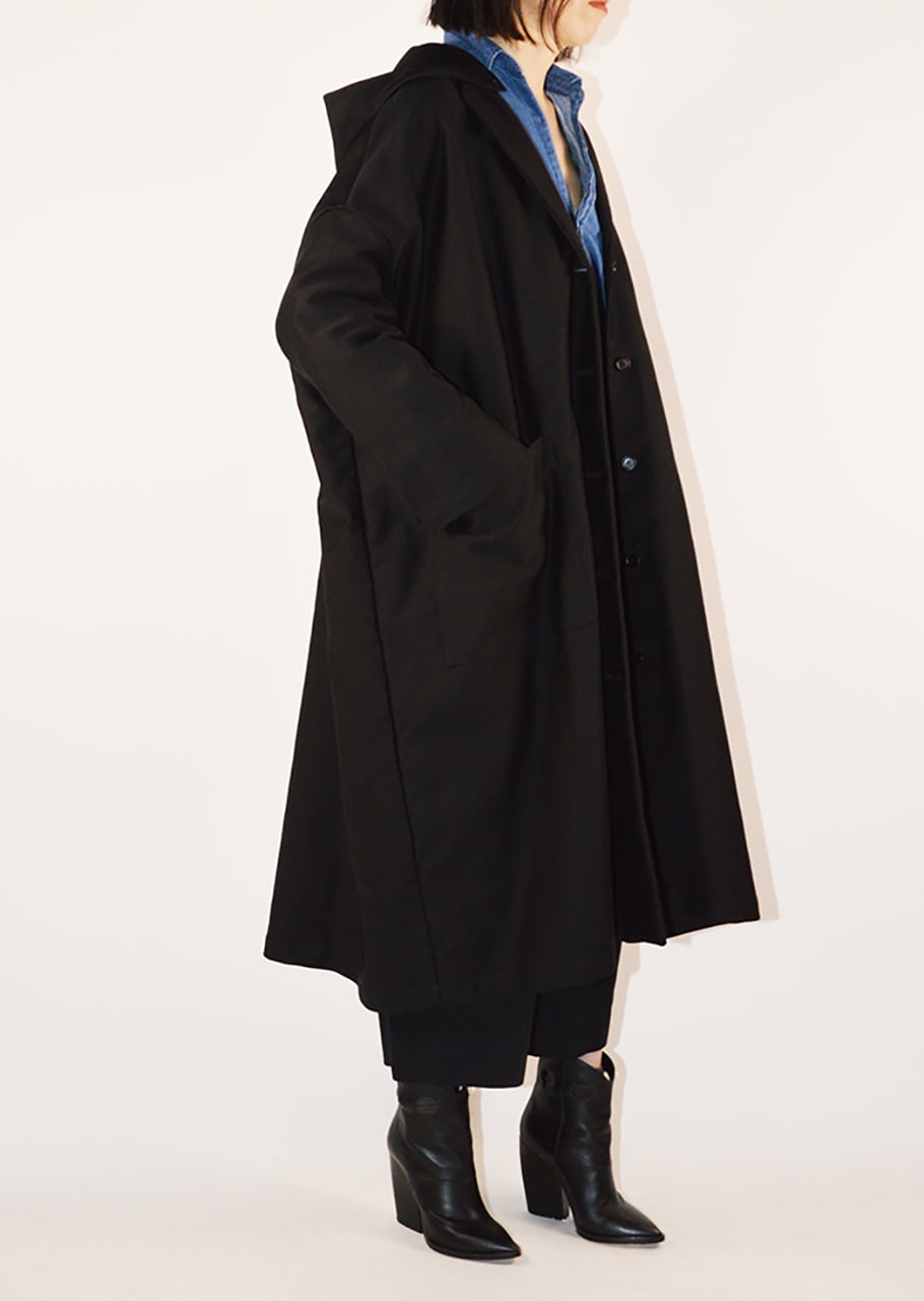 バランスの良いたっぷりとしたシルエット。デザインのポイントとなっているフードは取り外し可能。はずすとテーラードのデザインになるのできれいめなスタイリングに合わせても着こなせます。