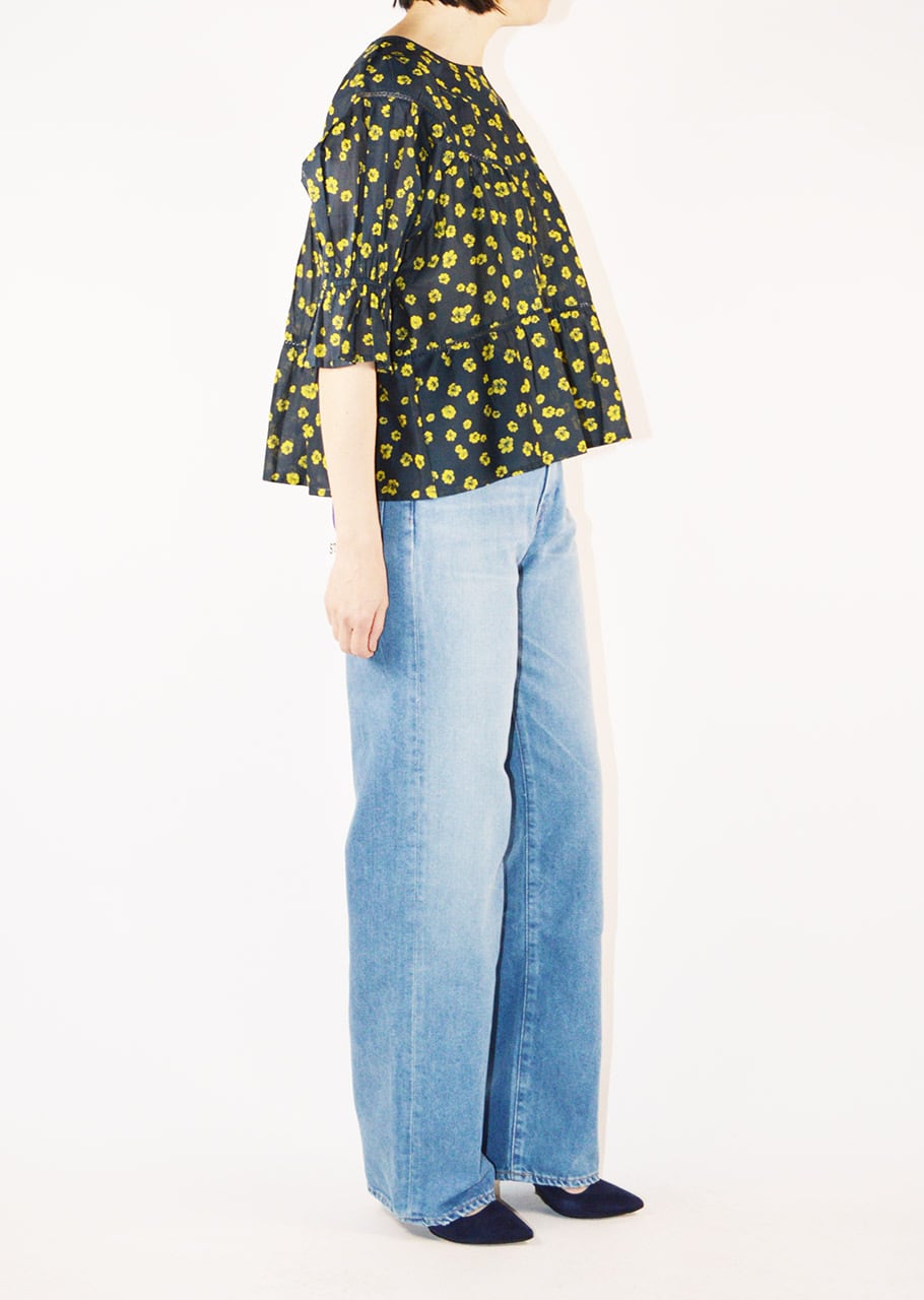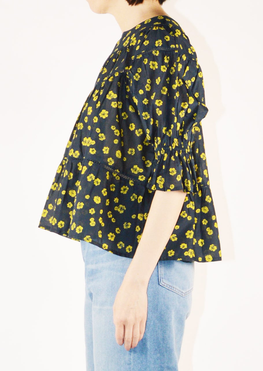 ティアードブラウスSOLの新作、レモンイエローのオリジナルフラワープリント。エアリーなコットンボイル素材に表情を与えてくれるデザイン。ラウンドしたヨークから流れるティアードデザインと、フリルを施した5分丈のパフスリーブが程よい甘さと気品を感じさせます。