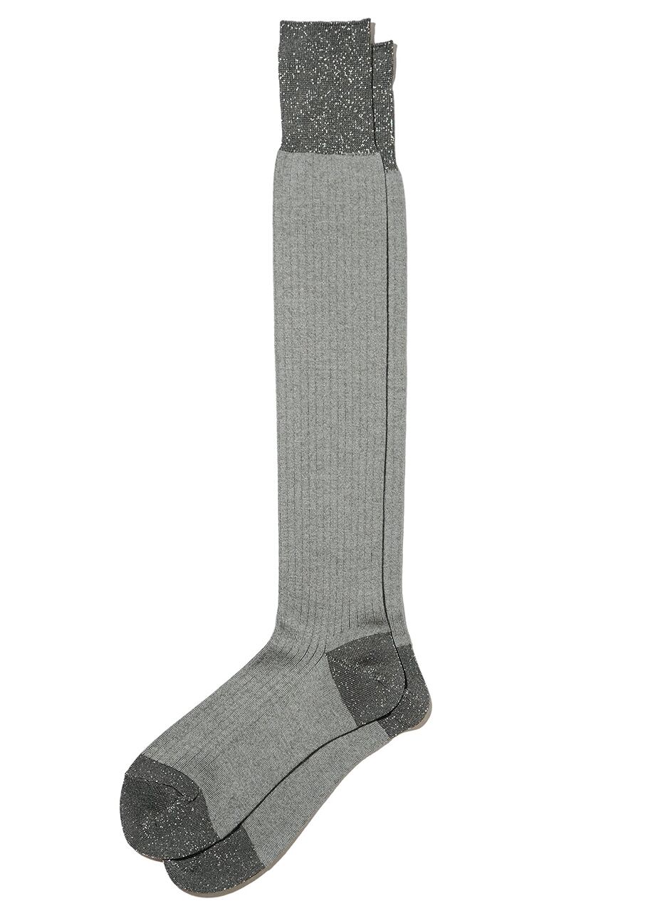 ラメがポイントとなったウール混のハイソックス。さらりとした履き心地で日常にぴったりのソックスです。ロングブーツと合わせてラメをほんのりと覗かせるスタイリングがおすすめです。