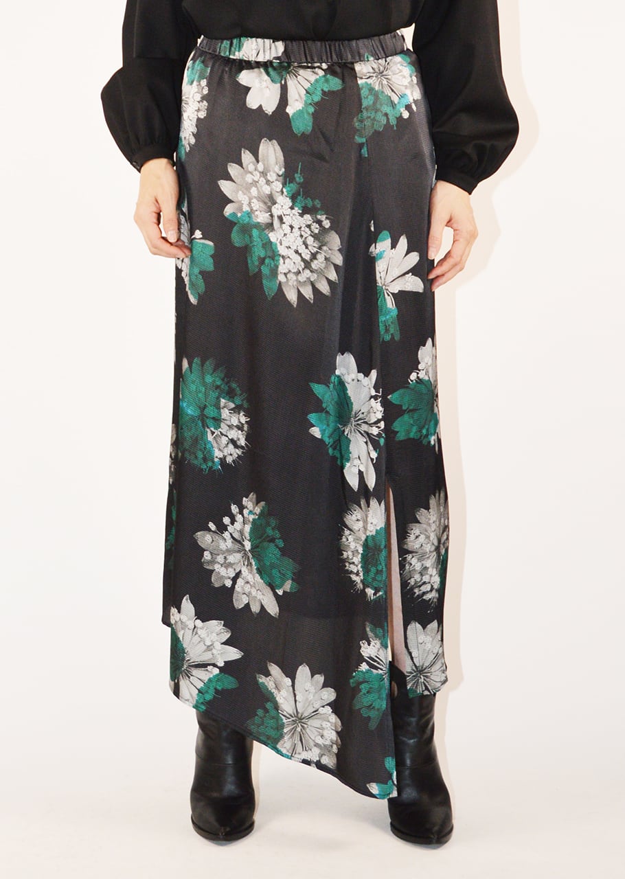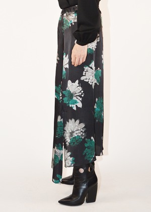 落ち感のあるシルエットがエレガントなスカートです。ブランドオリジナルのフラワープリントを施し、上品な艶とともに表現。同時にウエストはゴム仕様でリラックスした履き心地、しわになりにくくデイリーに使いやすいのも魅力です。