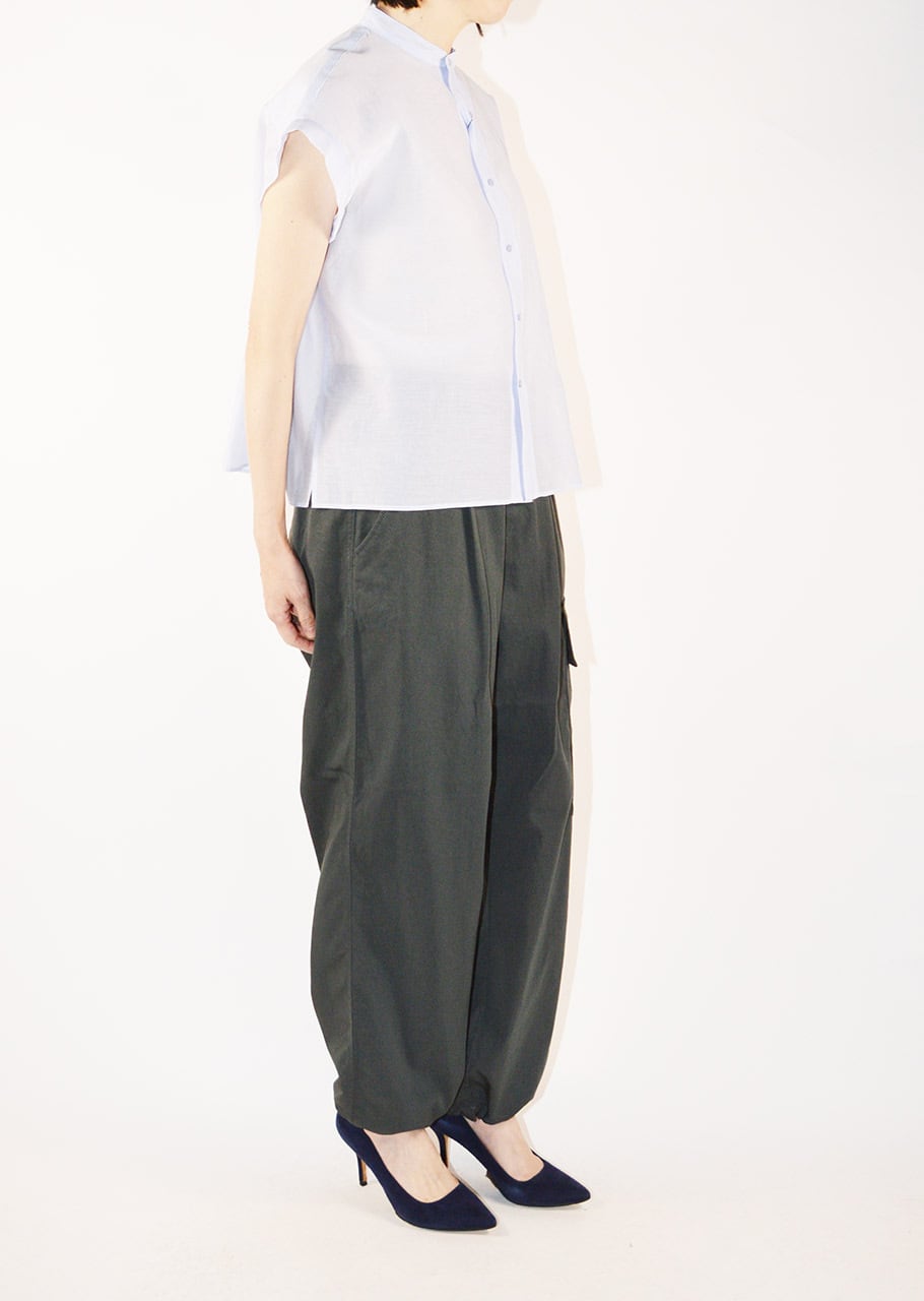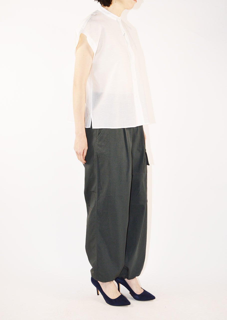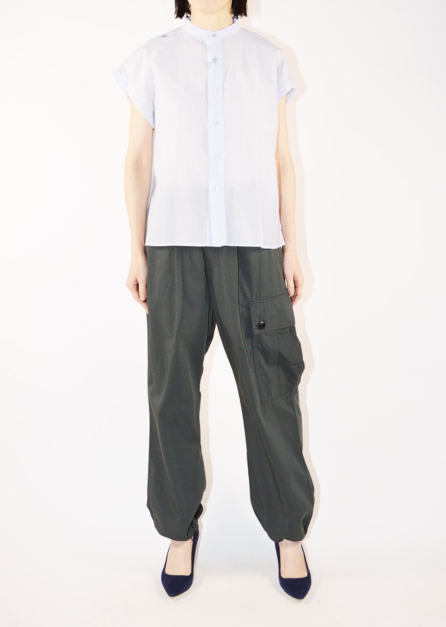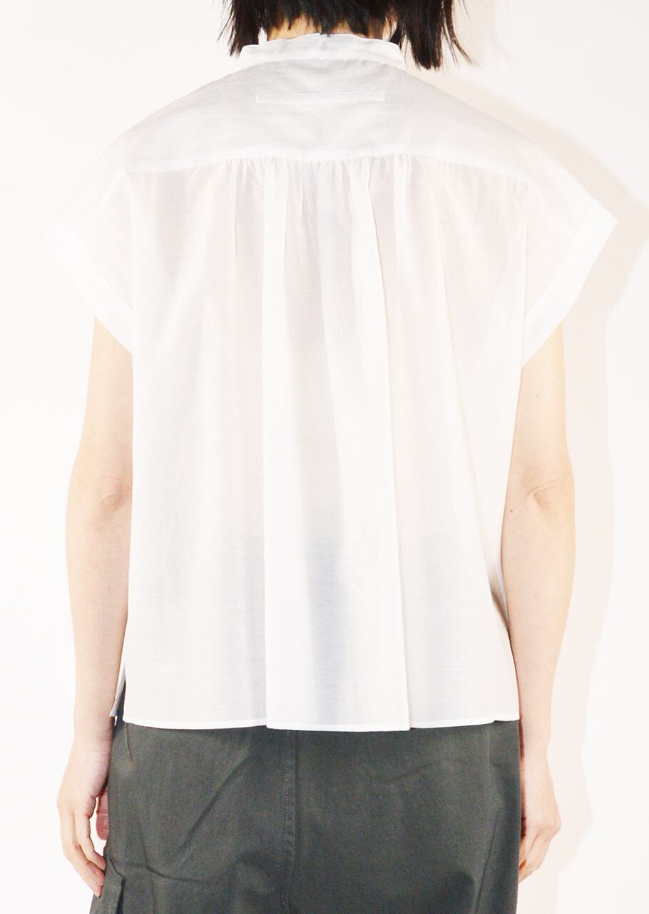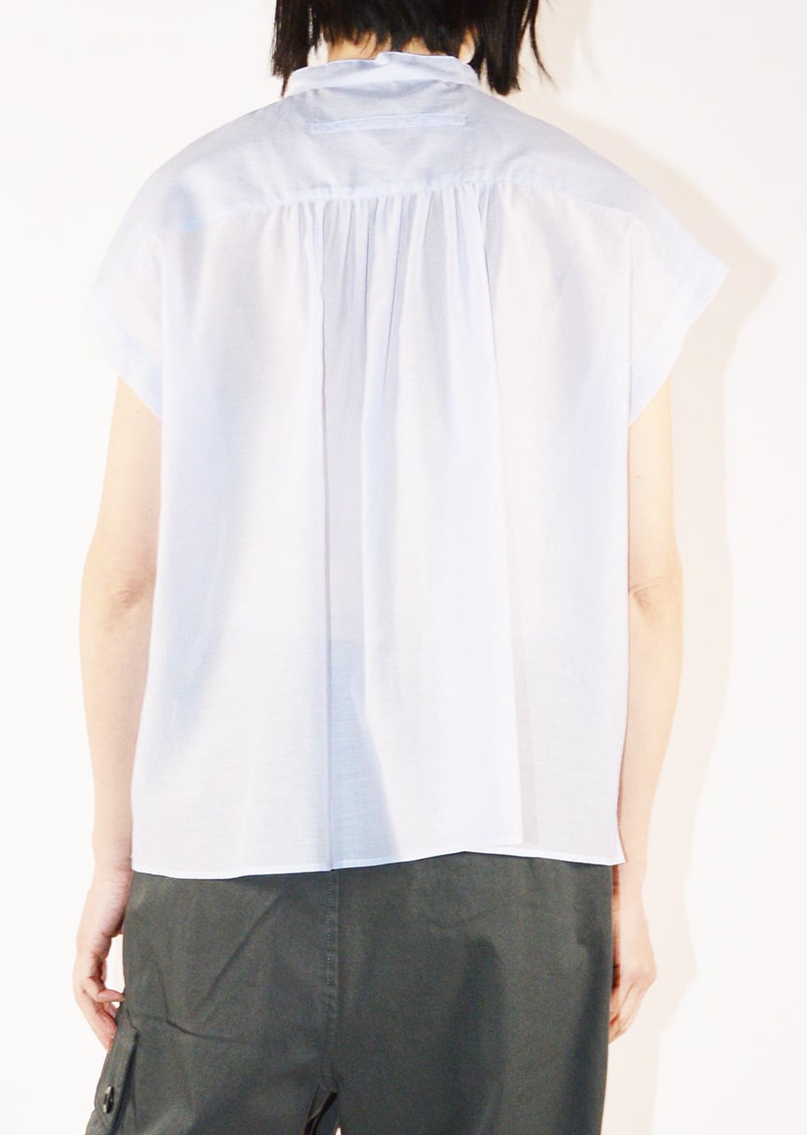 細やかなギャザーのディーテールが全体のアクセントに。かジュアルにもドレスシーンにも活躍してくれるブラウスはオン・オフ問わず夏のワードローブに欠かせない一枚に。軽やかな透け感のある素材で真夏の装いにもおすすめです。
