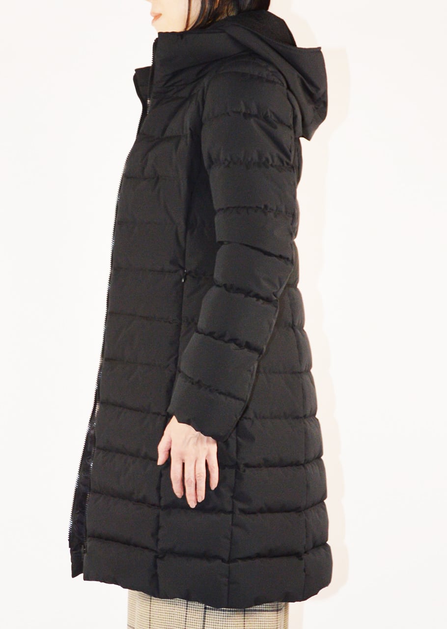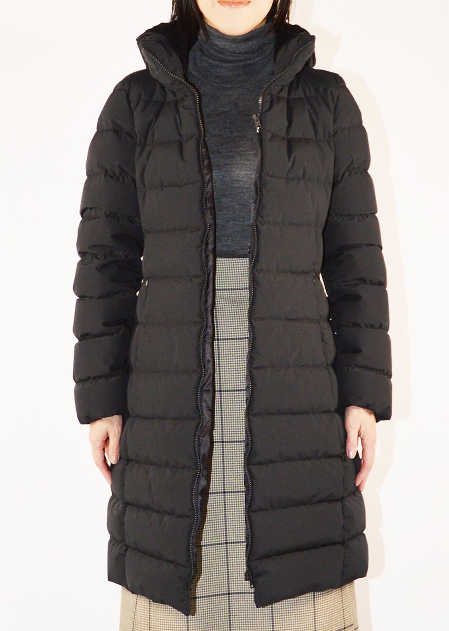 すっきりとしたフォルムで、ダウン特有のボリューム感が抑えられたモデル。すっきりとダウンウェアを楽しみたい方におすすめです。膝上まである着丈で、防寒力が高いのも魅力のデザインです。