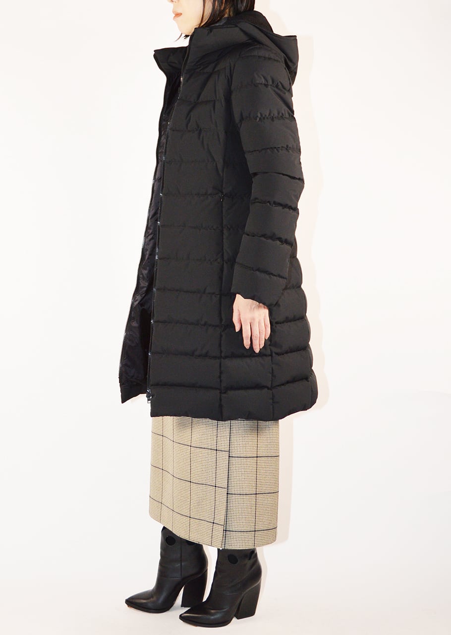 機能性に特化したFUNCTIONAL WARDROBE(ファンクショナルワードローブ)コレクションのロング丈ダウンコート。高めに配されたネックのパターンと、ウエスト部分に絶妙なシェイプラインを取り入れたエレガントなシルエットのモデルです。着脱可能なフード内側のフリースが暖かさに加えて全体のアクセントに。フィット感が高く、空気が入りにくい仕様で保温性が抜群なのも嬉しい。