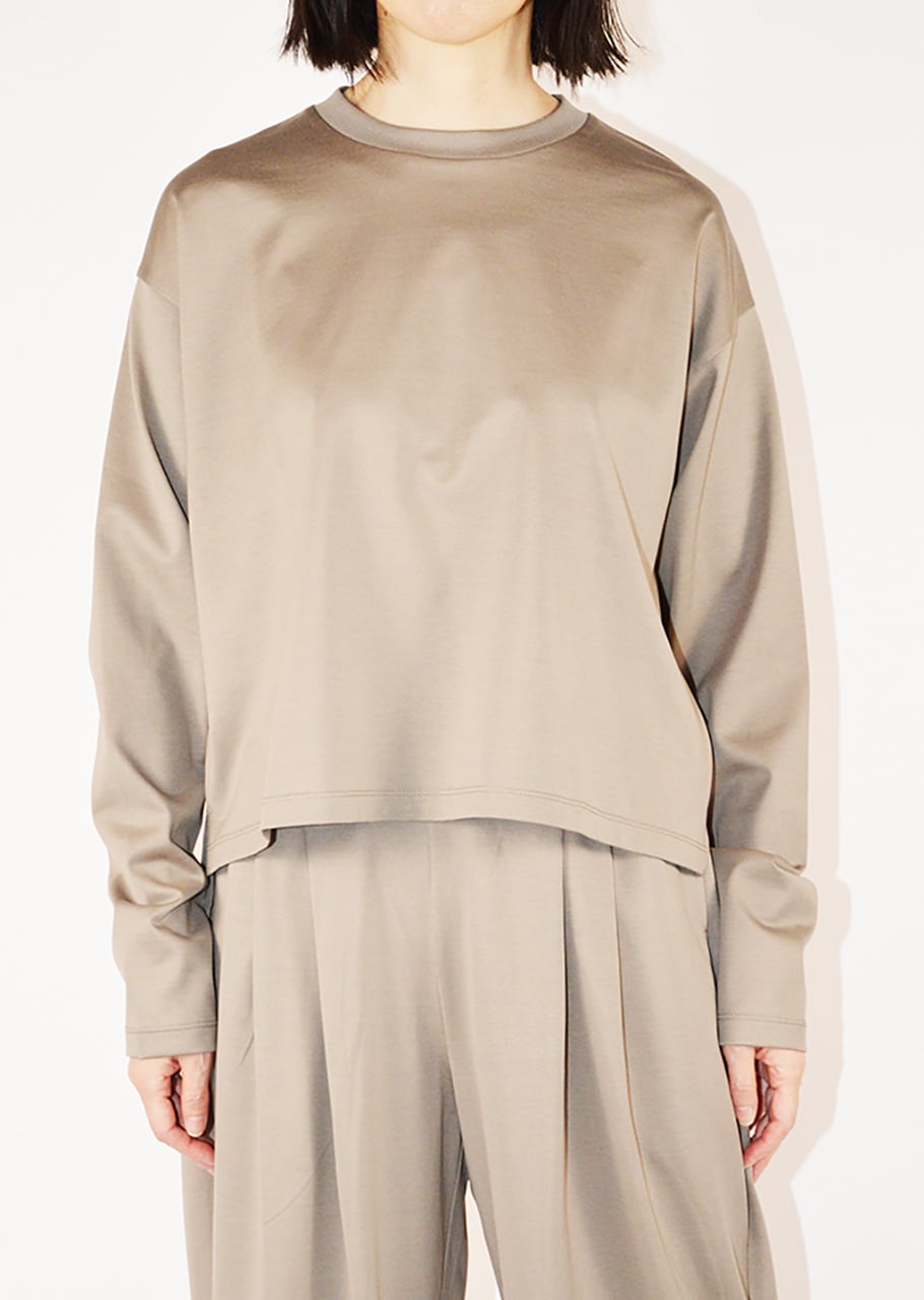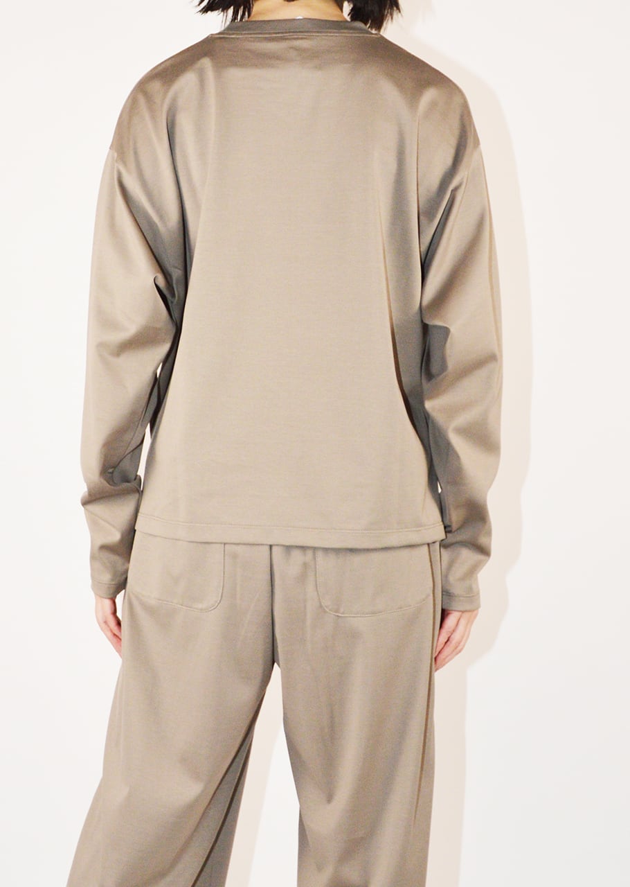 コットン100%のロングスリーブTシャツ。シルクを思わせるような上品な光沢が特徴の素材感です。ゆったりとしたドルマンスリーブのデザインで、これ一枚着ただけでニュアンスをもたらしてくれる一着となっています。同素材のパンツと合わせたセットアップのスタイリングもおすすめです。
