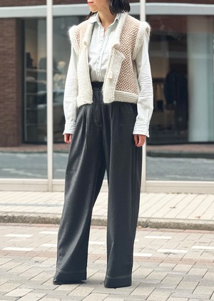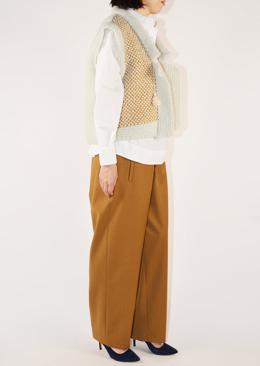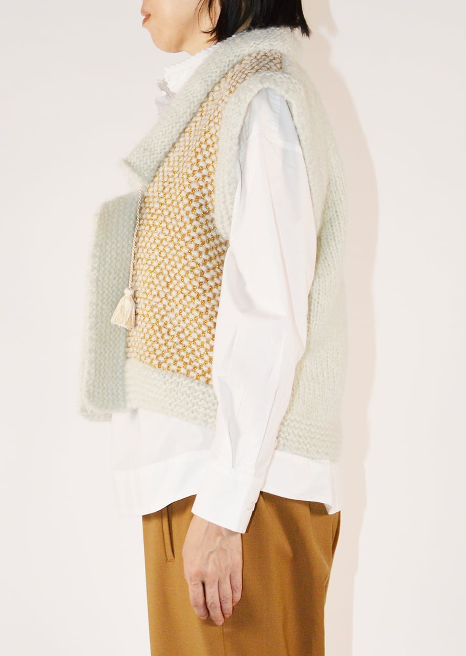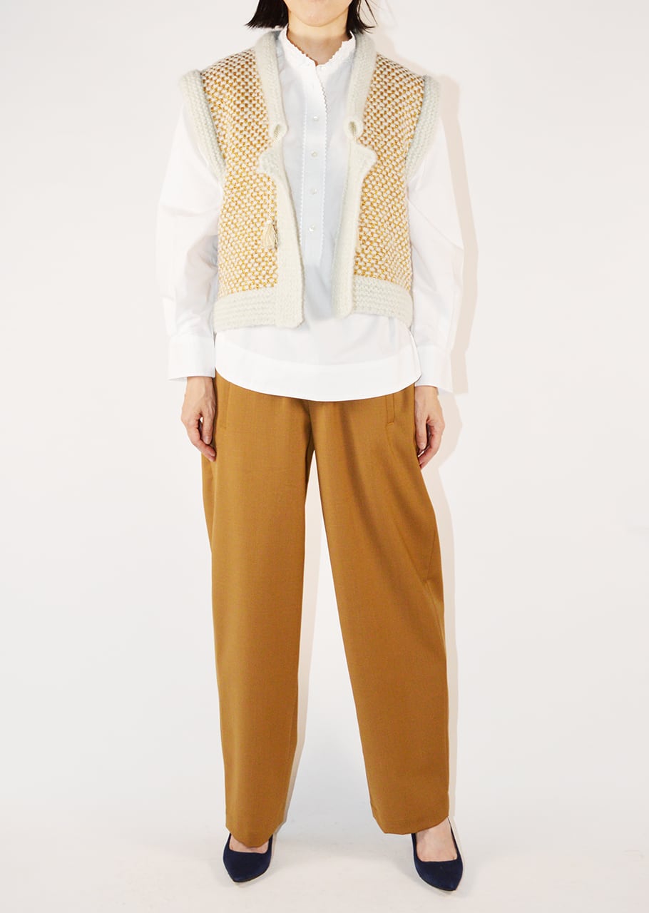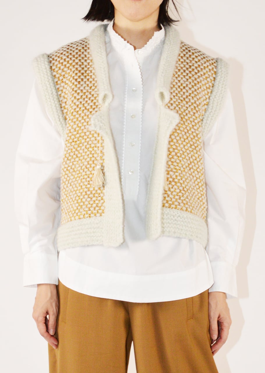 なんとも可愛らしいフォークロアを感じさせるニットベストはFORTE FORTEならではのアイテム。ほどよいラメがポイントになっており、アームホールを広めにデザインしたことでレイヤードしやすく、こなれ感のある印象に。タッセル遣いがアクセントになっています。