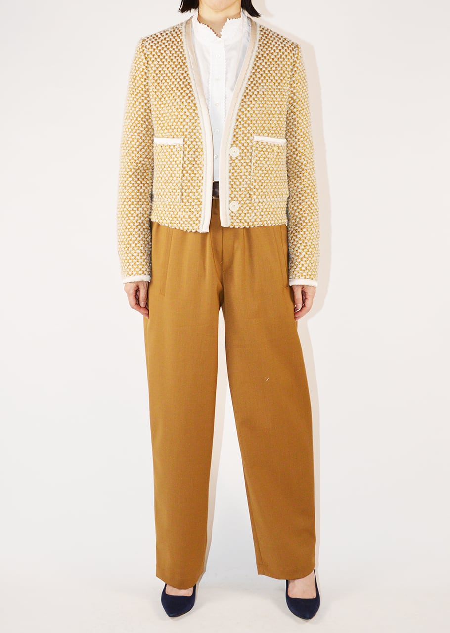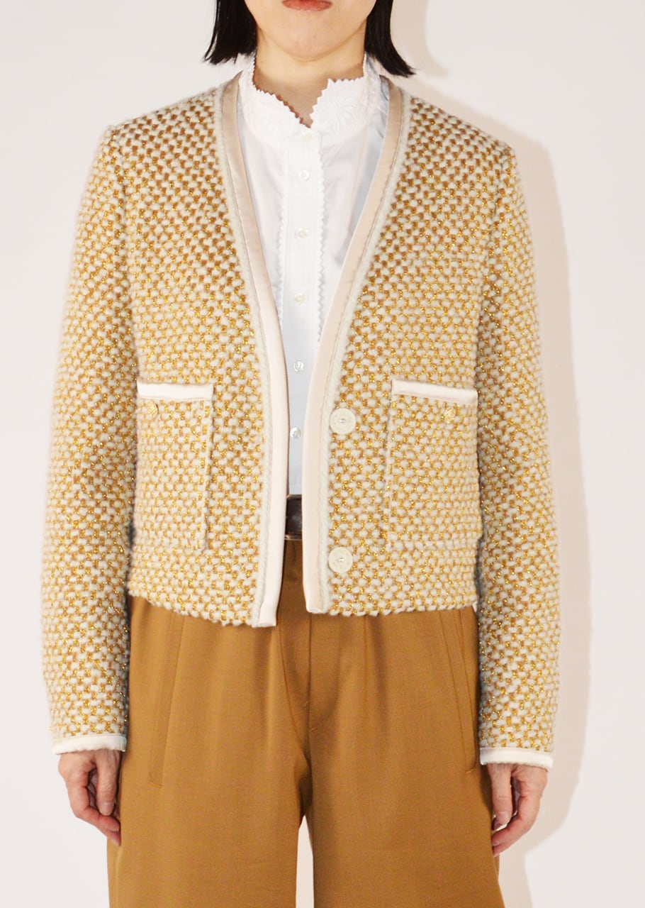 ふっくらと立体的な織りとさりげないラメが高級感を感じさせるジャケットです。淡い色のトリミング、クロップレングスがカジュアルさをも感じさせ、デイリーからパーティまで幅広いシーンで活躍してくれそうです。顔まわりをすっきりと見せるノーカラーがポイントです。