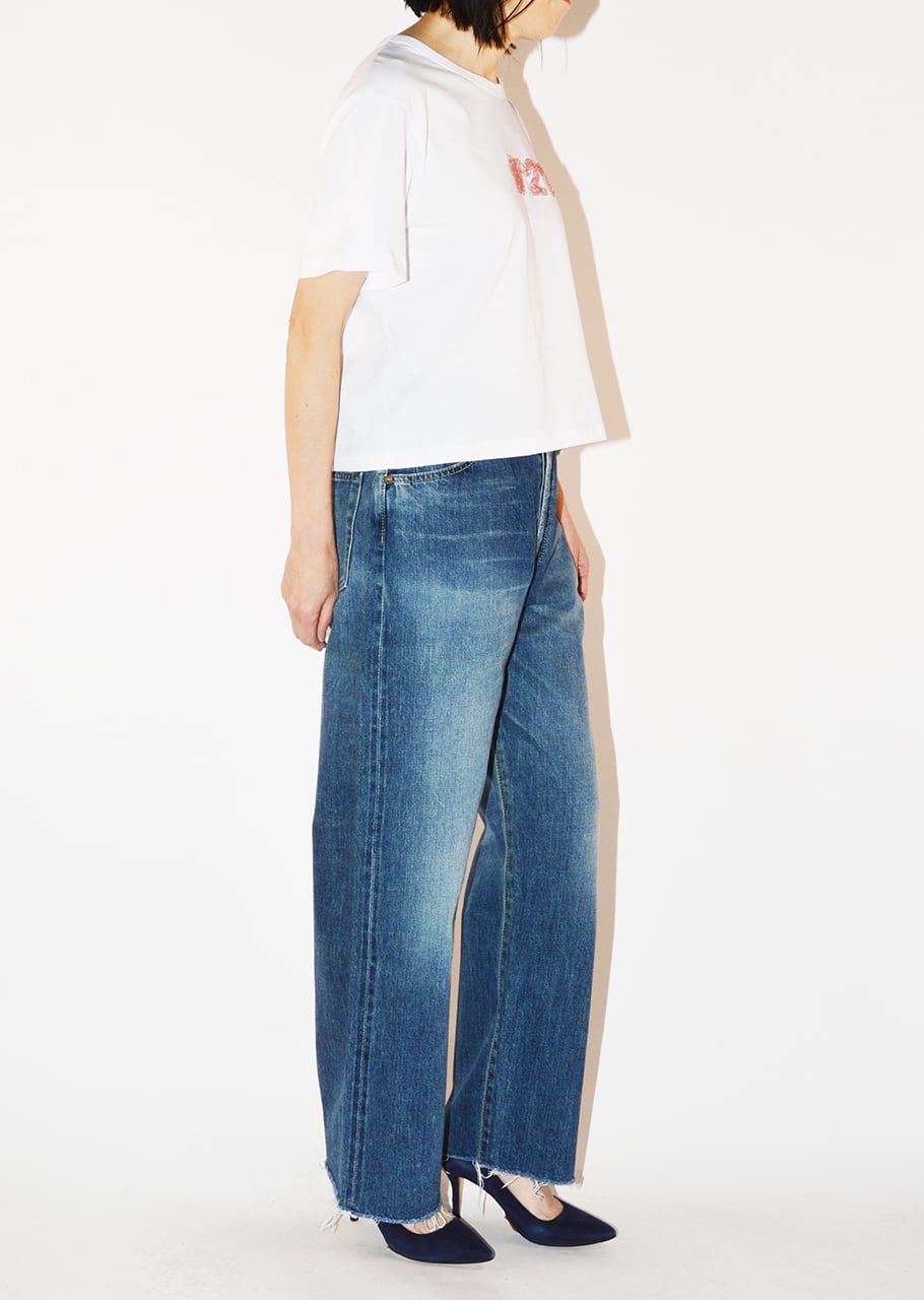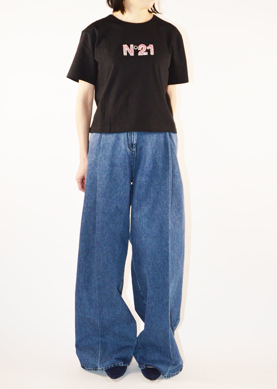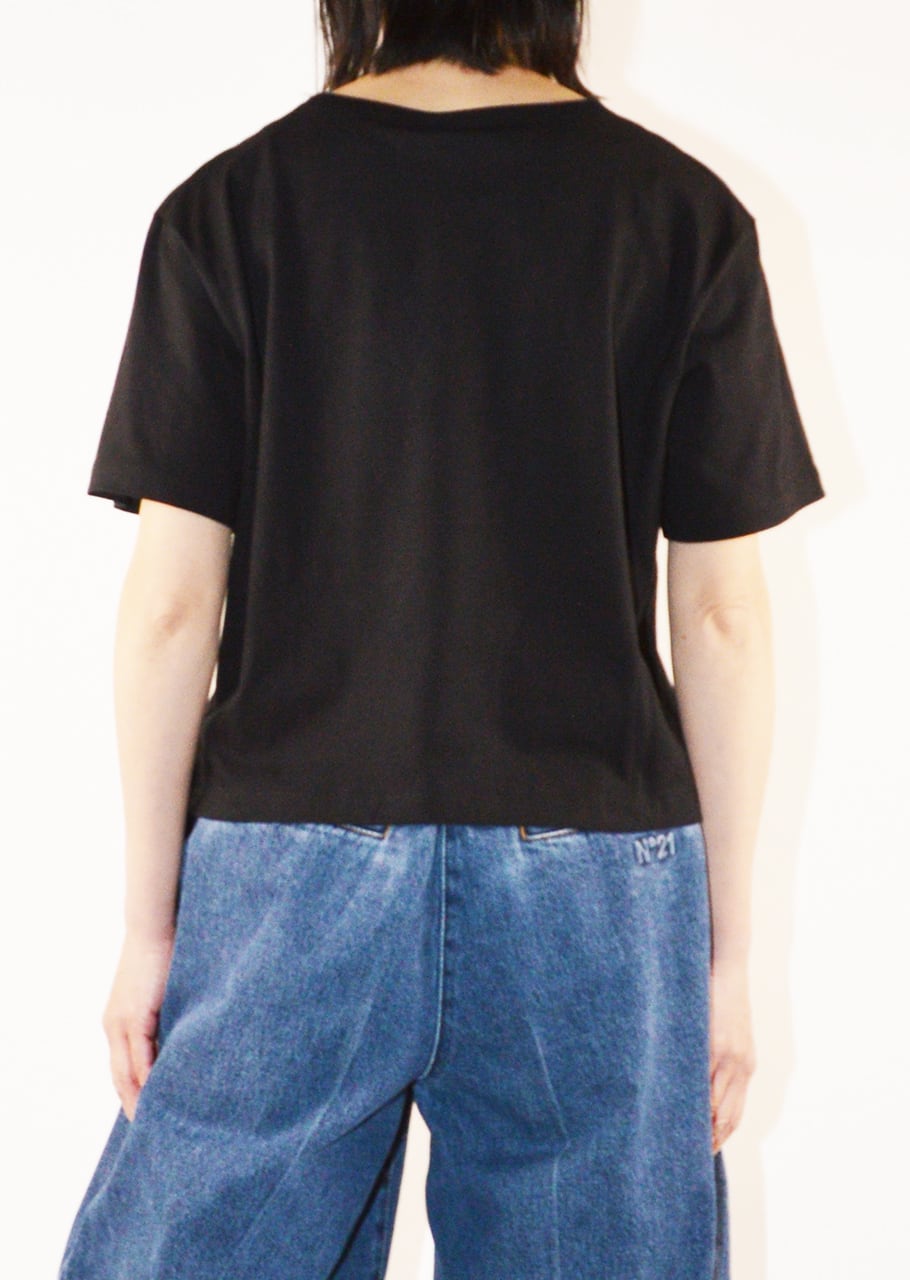ややゆとりのある身幅と短めの着丈、計算されつくしたシンプルなデザインで、女性らしさを感じさせるTシャツです。スパンコールとビーズを用いたキラキラと輝くブランドロゴが可愛らしいアクセントになっています。