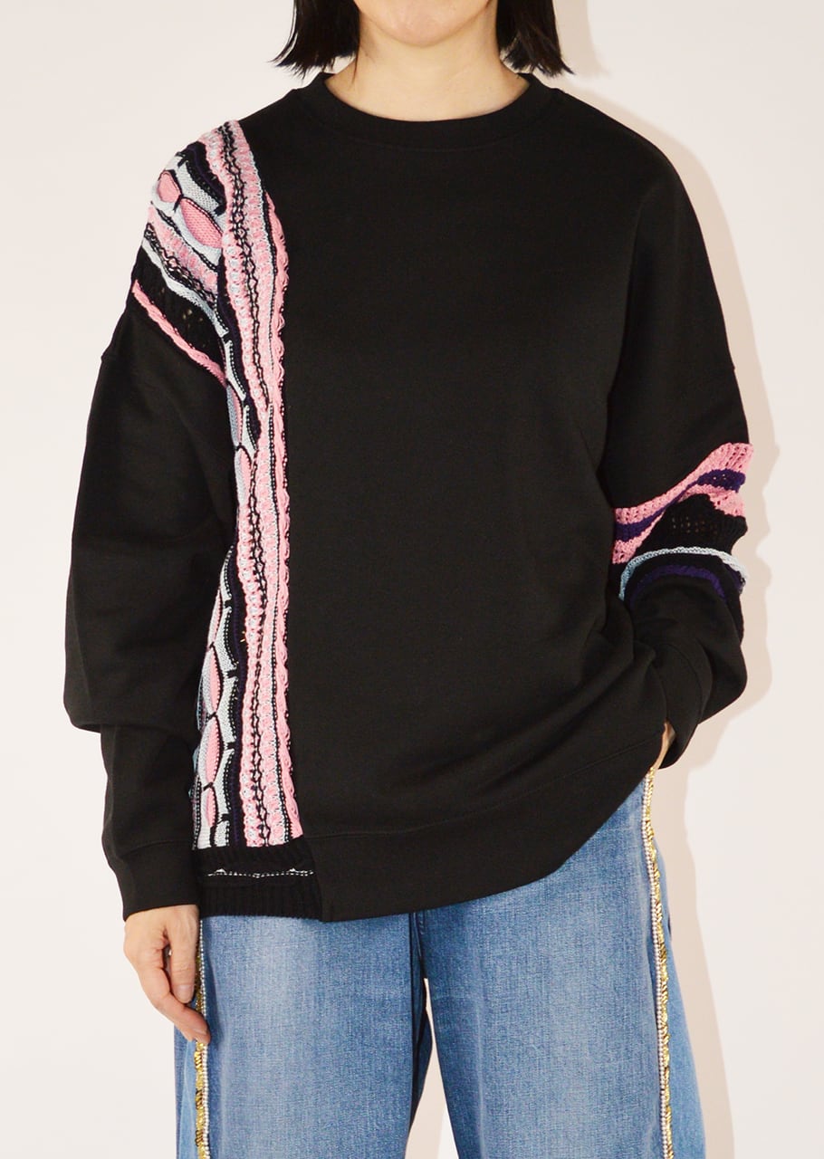 スウェットシャツの構造をベースに、ブランドのシグネチャー、クレイジーニットを大胆に切り替えた一着。プレーンな面と複雑に積層された編み柄との対比がリズムと陰影を生み出します。繊細な透け感や奥行きを宿したクレイジーニットが、スウェットシャツに新たな緊張感をもたらし、日常にアートを纏うような感覚です。