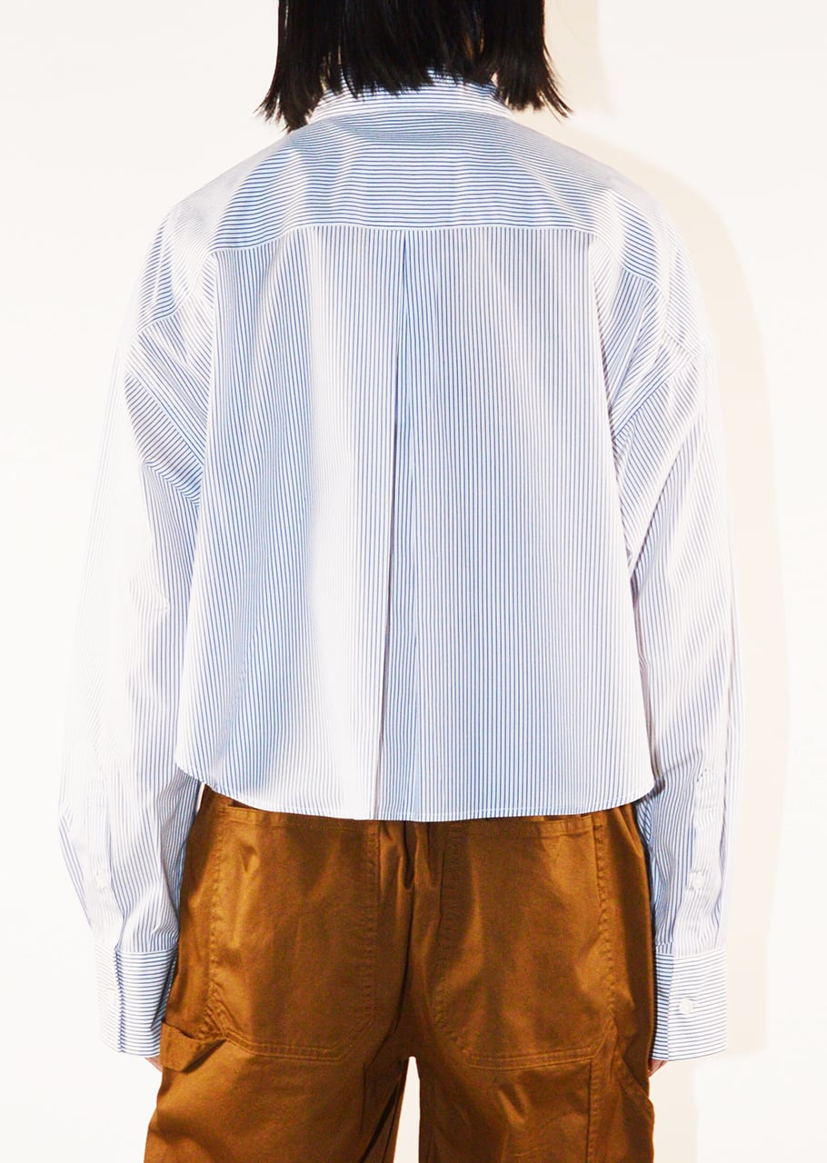定番のストライプシャツを現代的にアップデート。軽やかなコットンポプリン素材を使用し、クロップド丈のボックスシルエットで仕上げたストライプシャツです。レイヤーコーデにも取り入れやすく、デニムとの相性も抜群です。