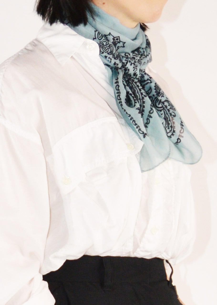 100%コットン素材の柔らかさの中に適度にハリのあるスカーフ。カジュアルなバンダナのデザインがアクセントとなっています。90×90センチの大きさになっているので、スカーフのようにコンパクトにさりげなく首元に巻けるサイズ感に。シンプルなウェアのアクセントとして活躍してくれる一枚です。