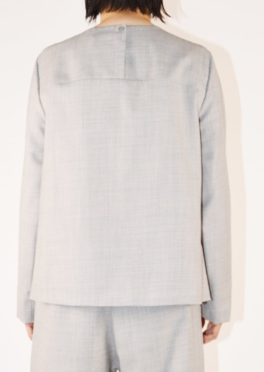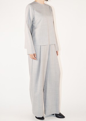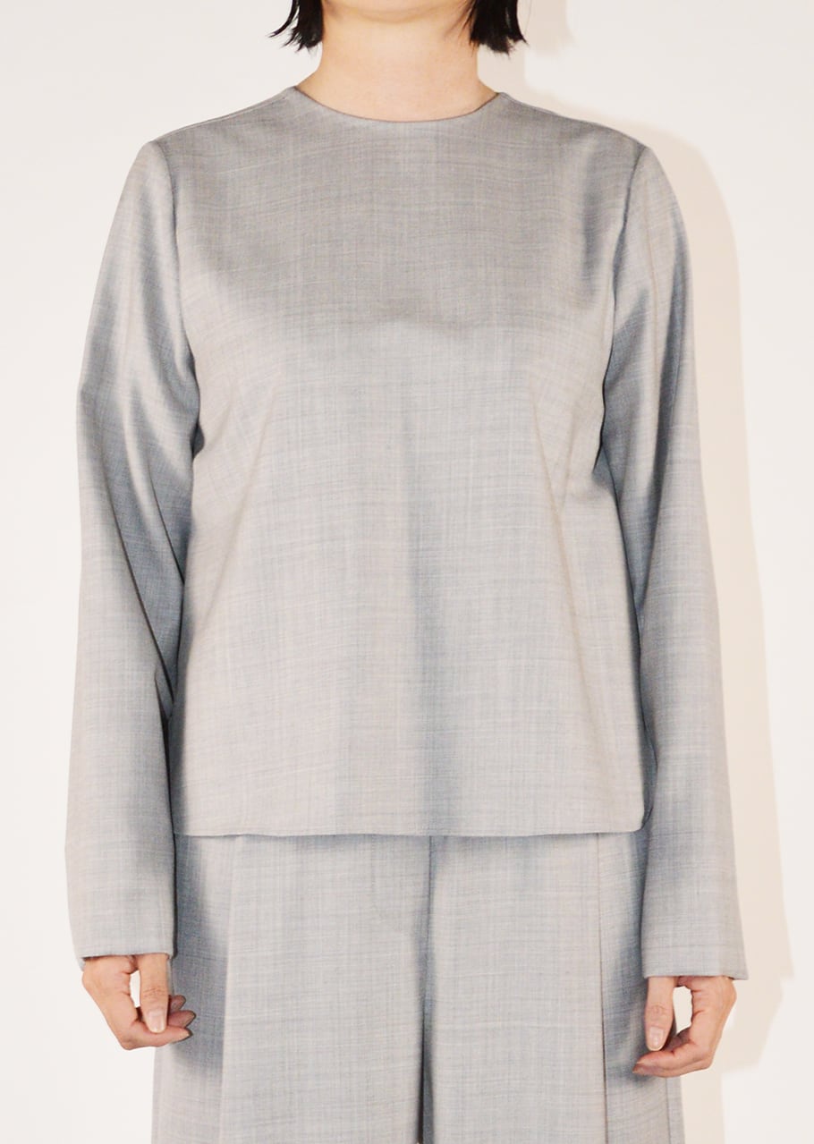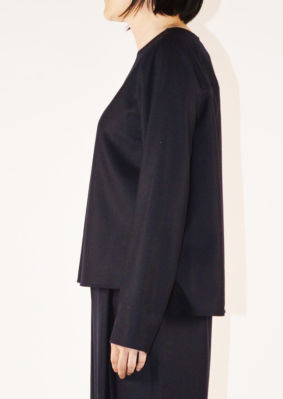 上質でなめらかなウール×ポリウレタン素材を使用したクルーネックプルオーバーブラウス。シンプルなデザインなので素材とカッティングの美しさを堪能できるアイテムです。前後差のある裾のデザインが全体のアクセントに。同素材のパンツを合わせたセットアップスタイルもおすすめです。日常着としても特別なシーンの装いにも幅広く活躍してくれる一着です。
