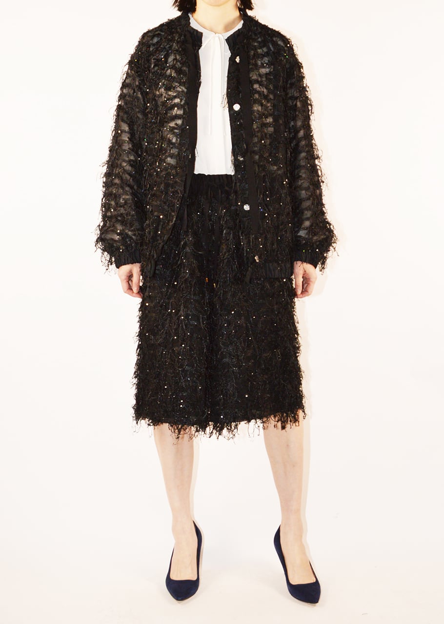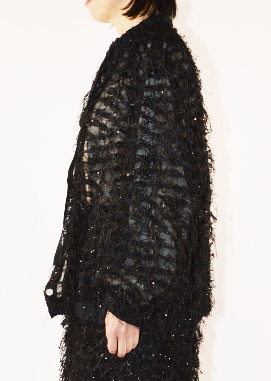 イタリアSOLUZIONI社のカットジャカードを使用、カット部分は手間をかけ丁寧に処理することで、表面のムラや引っかかりを抑えたジャケットです。メッシュ状のシアーな生地に繊細なフリンジを施し、小さなスパンコールが動くたびに輝きます。首元のグログランリボンや、ビジューボタンにも注目を。