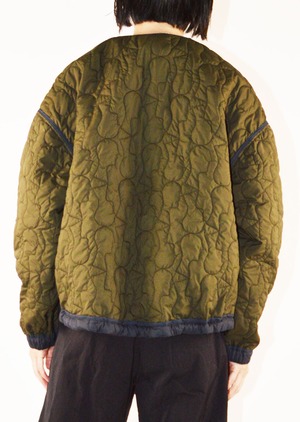 襟のリブニットとボリュームを変えて楽しめる裾のドローストリングがアクセントとなったMA-1ジャケット。リサイクルポリエステルとリサイクルカシミアをミックスしたオリジナルのファブリックです。ヘッド柄のキルティングがユニークで、リバーシブル可能なインサイドはカーキをセレクト。