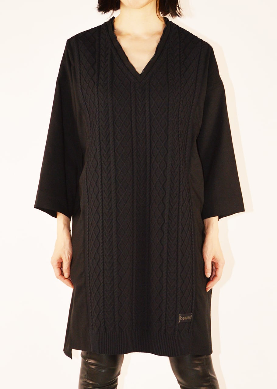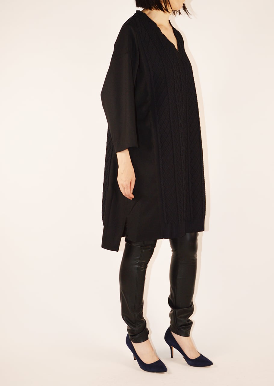 立体感のあるケーブルニットとしなやかな布帛を組み合わせたショートドレス。異なる質感が自然に溶け合い、ミニマルでありながら奥行きのある表情を作り出しています。編み模様のリズムと布の柔らかな動きが静かにコントラストを奏でながら、体のラインに添うように構成されています。ニットのぬくもりと布帛の軽やかさが共存、オダカらしいバランスを宿した一着です。