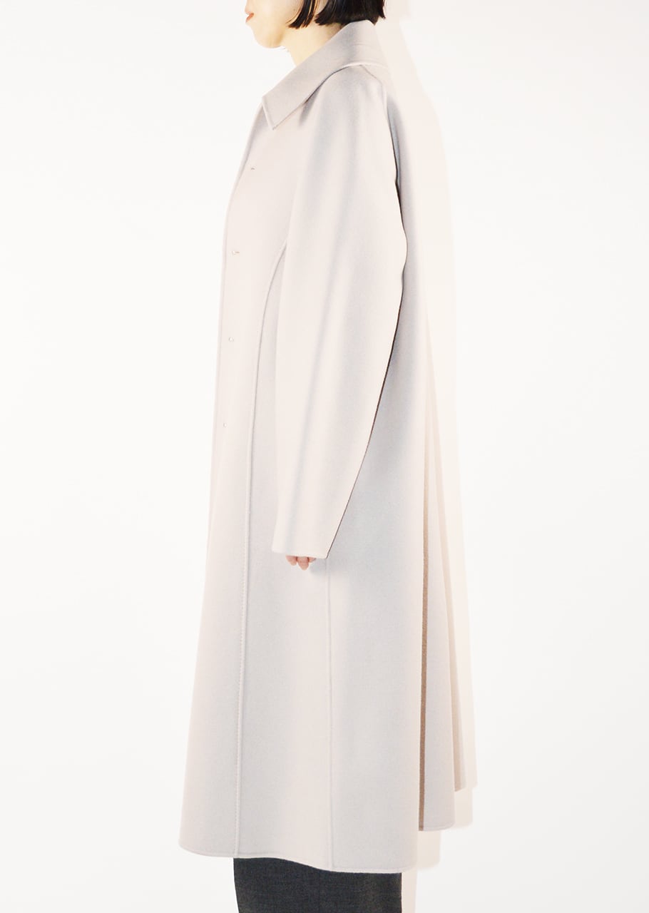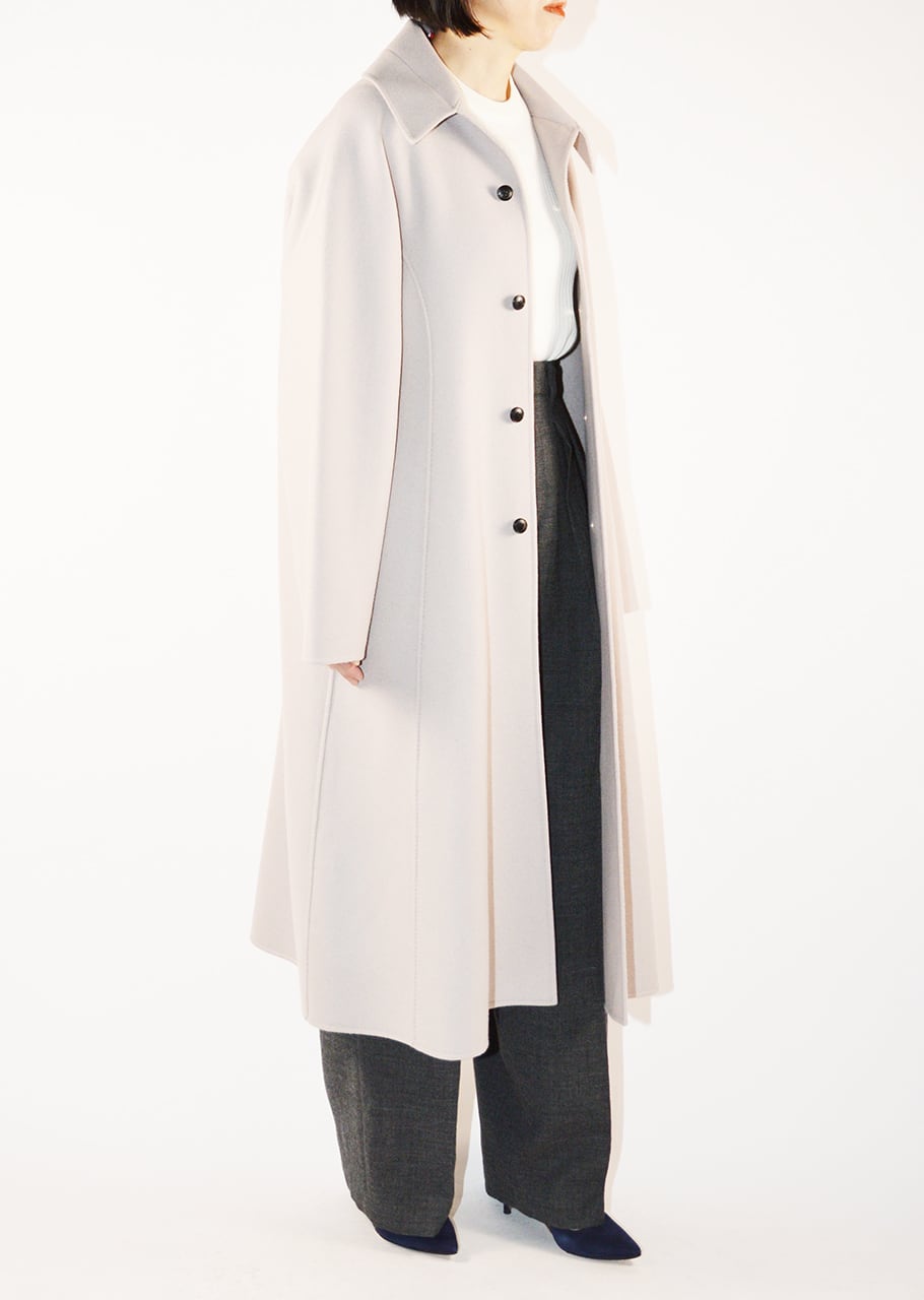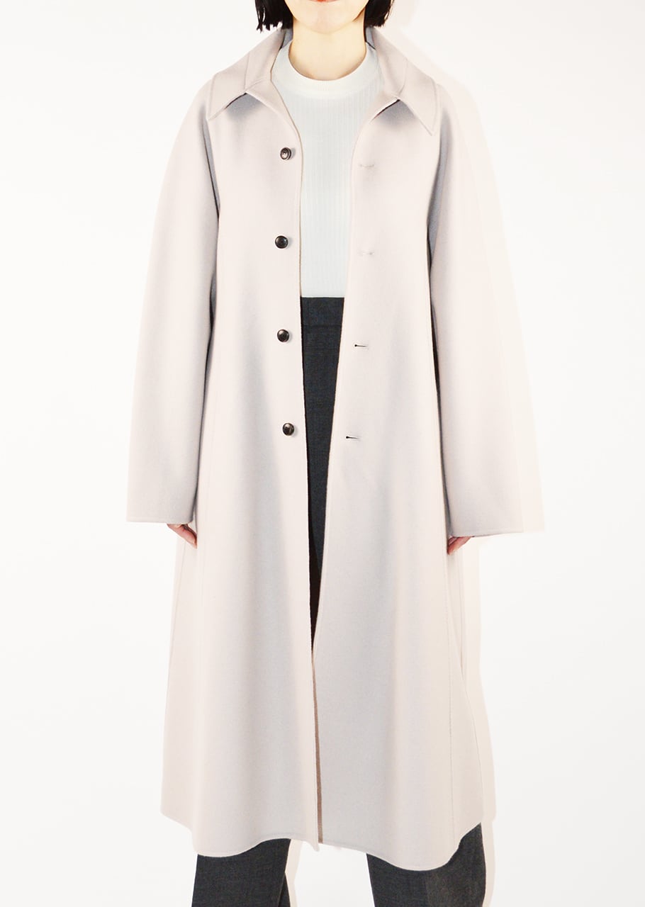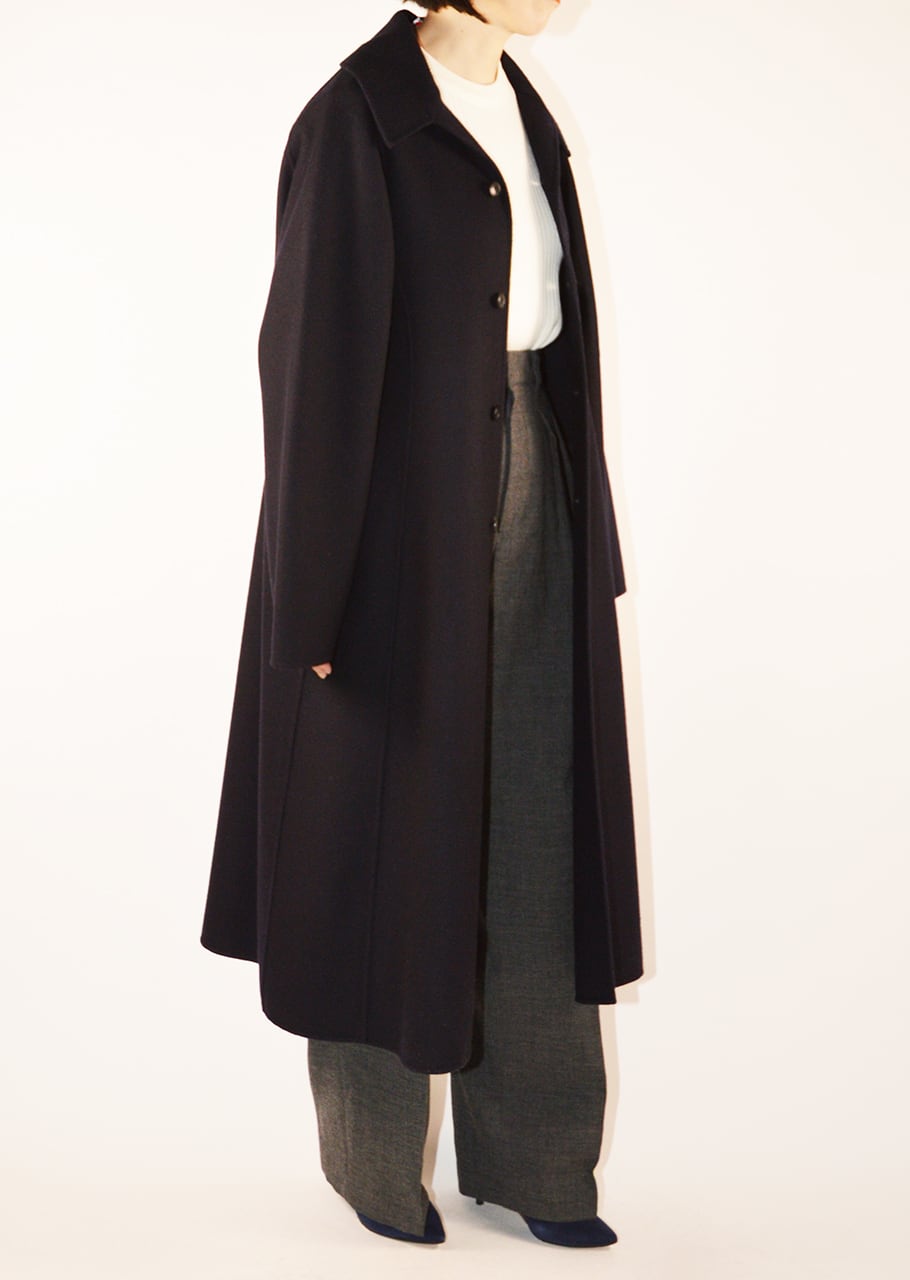 スーパー140ウールを使用したダブルフェイスのコートです。オーストラリアのジーロン、クィーンズランドの希少なベビーラムなどをブレンド、膨らみのある柔らかなファブリックにハイテク加工を加え、きれいな張りのあるメルトンに仕上げました。高い位置の襟はタートルと相性がよく、秋冬の着こなしにマッチ。美しいドレープとボリュームを楽しむアイテムです。
