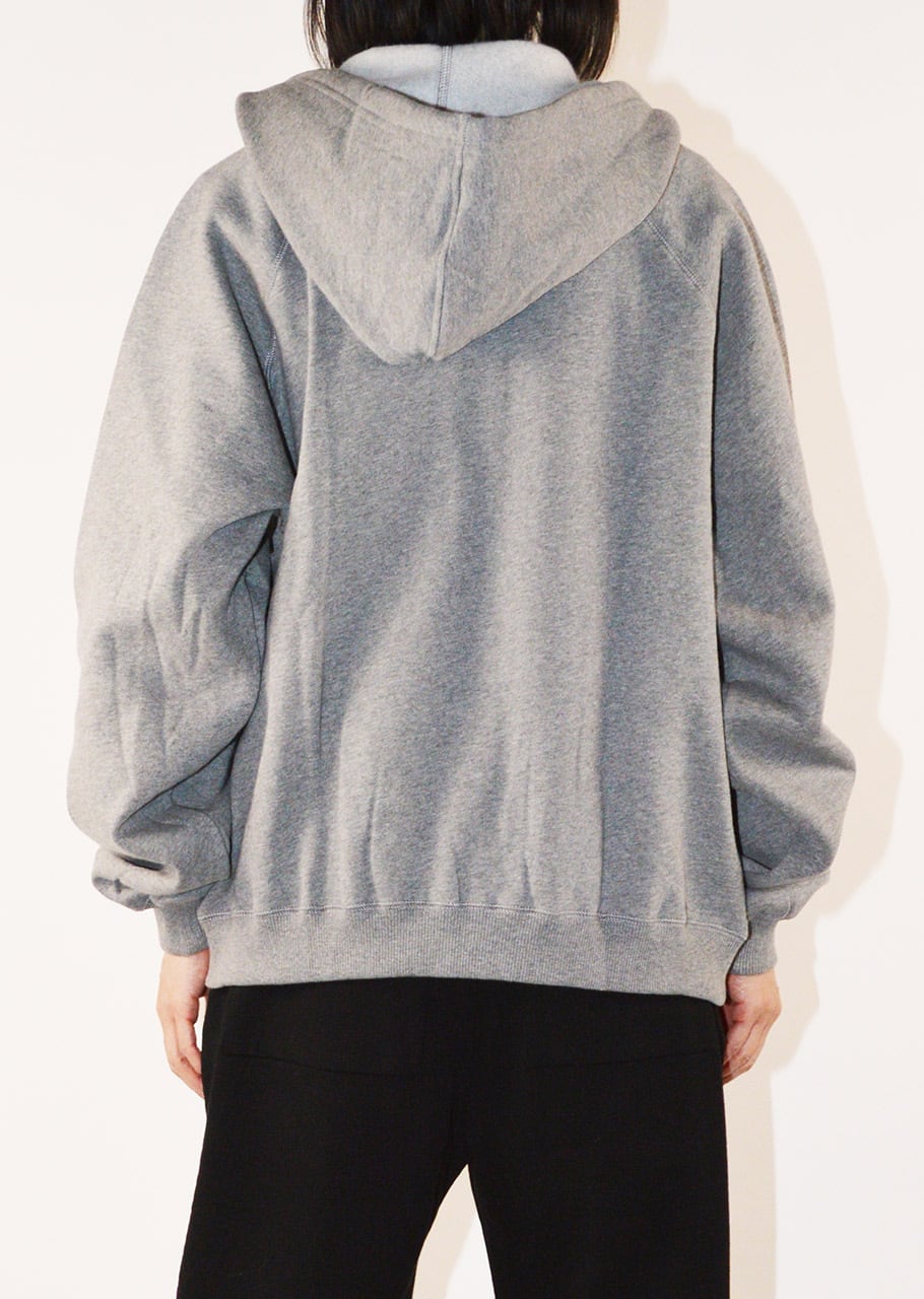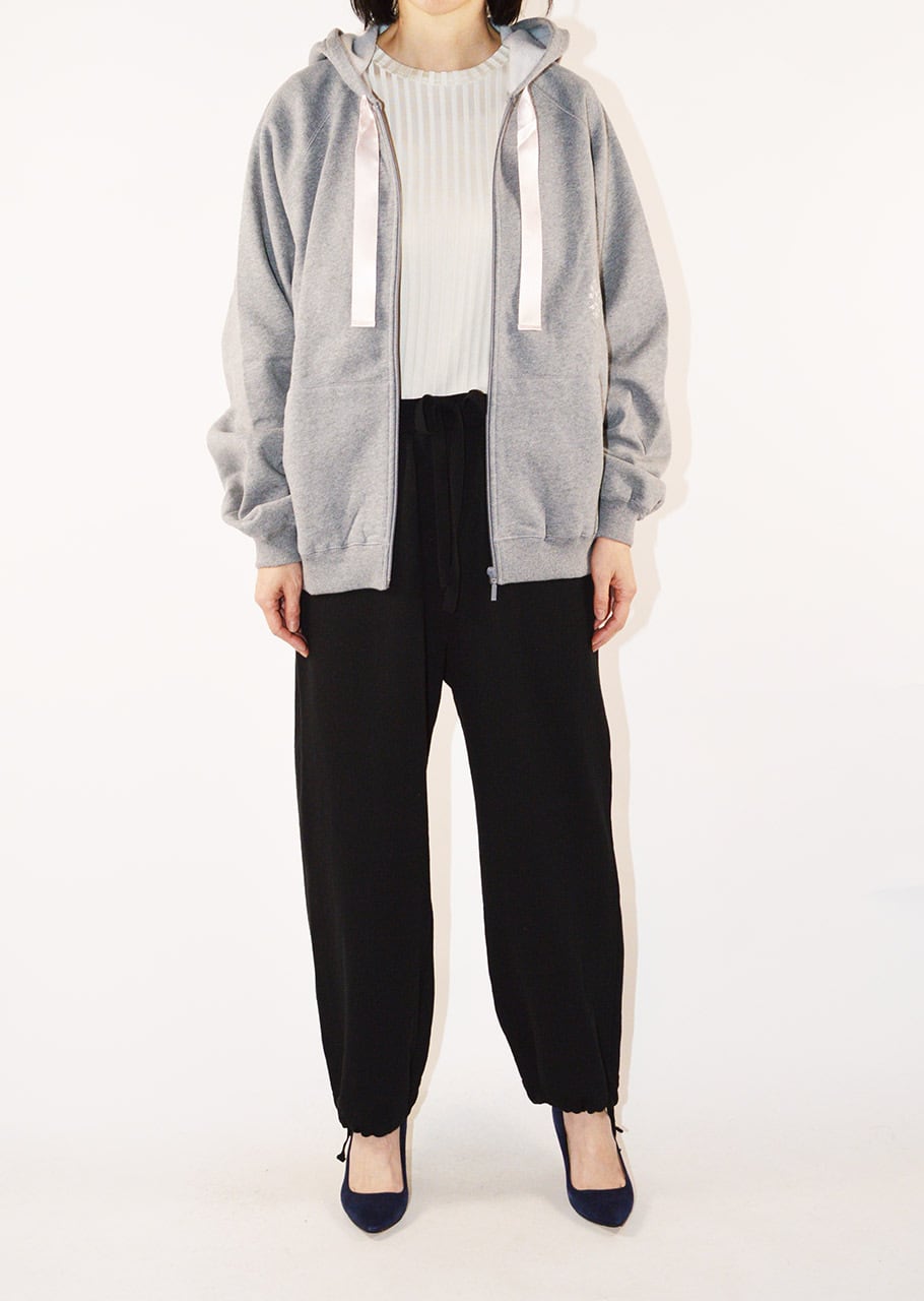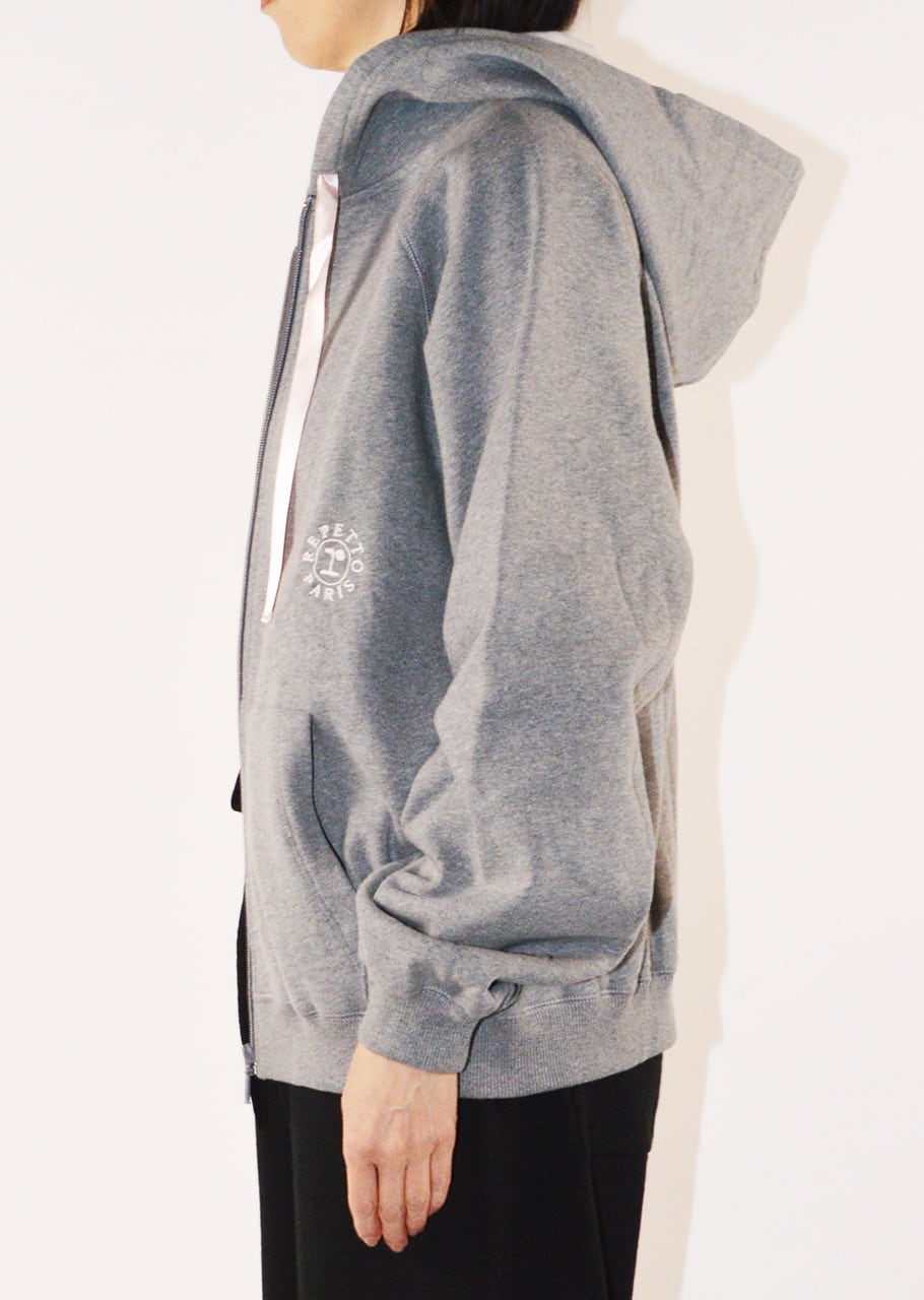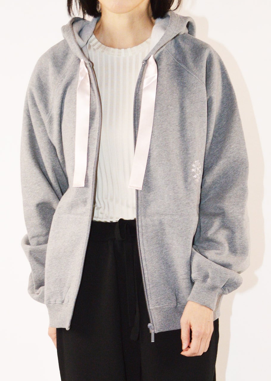 コットン100%のフロントジップパーカー。フードにほどこされた光沢感のあるリボンがアクセントになっています。前身頃にさりげなくrロゴ入りの刺繍をほどこし、袖先にややボリュームを持たせてフェミニンなムードをプラスしたアイテムです。