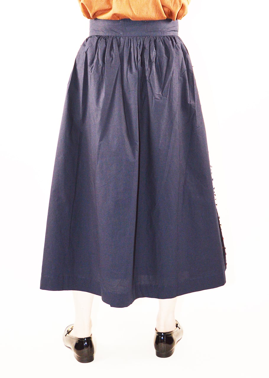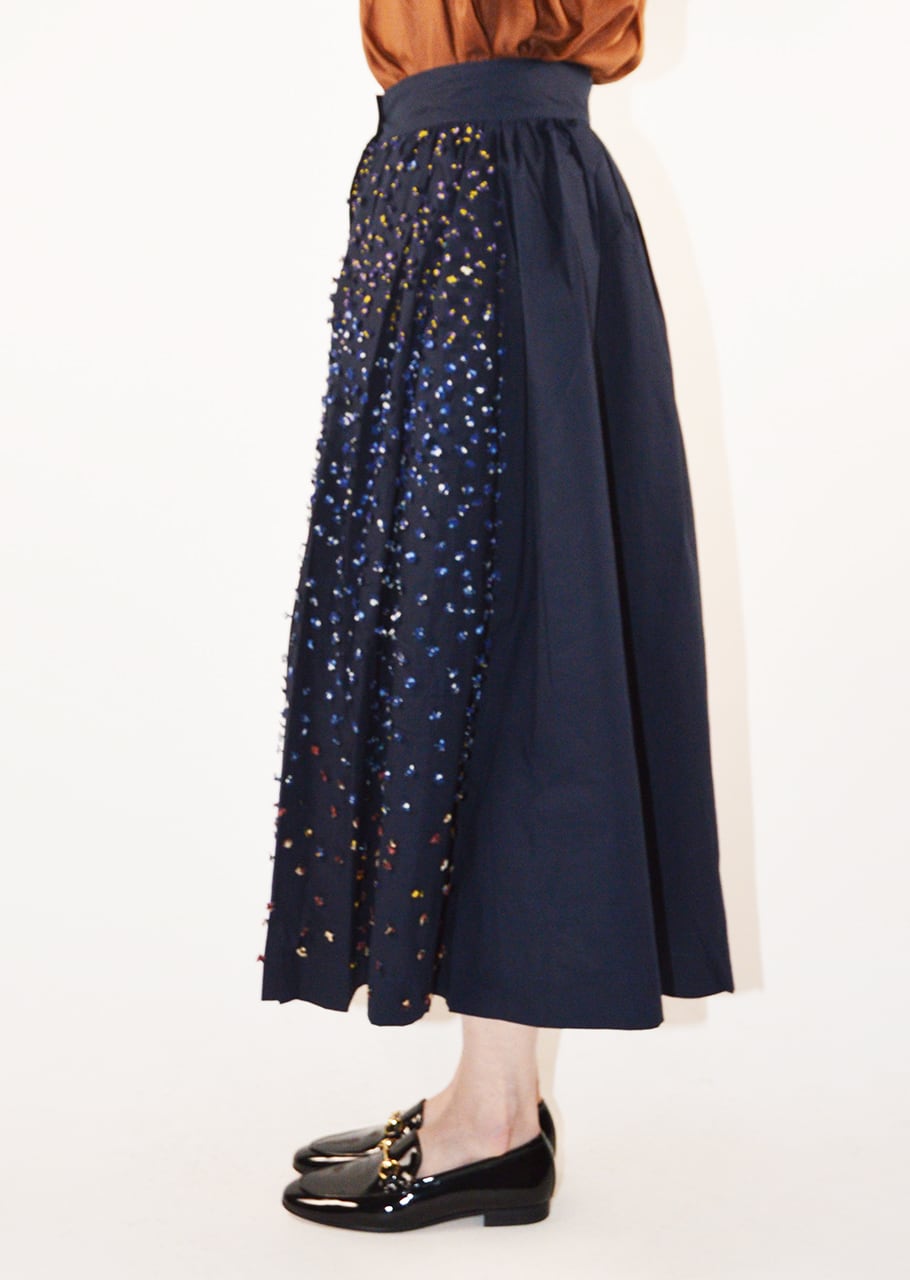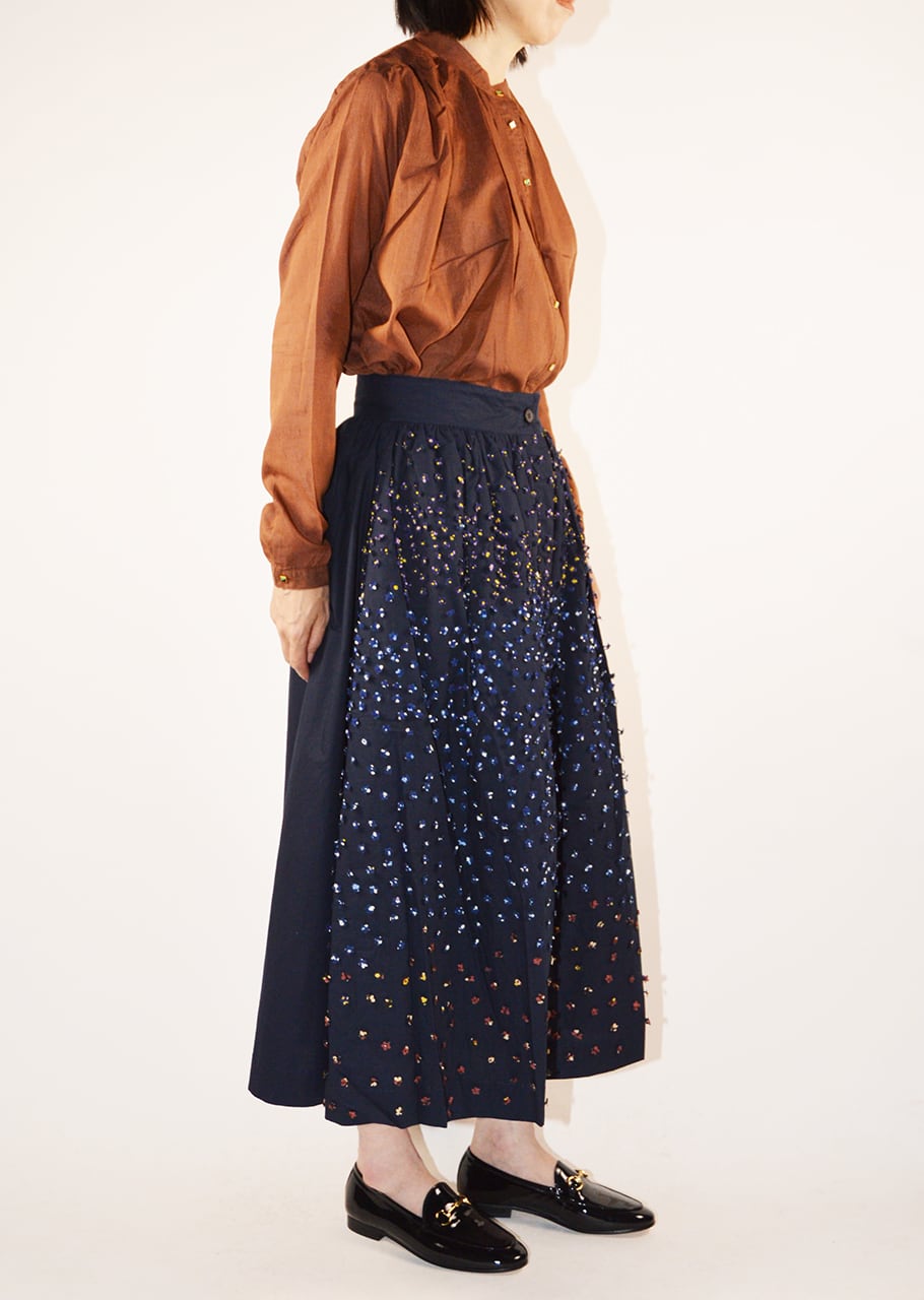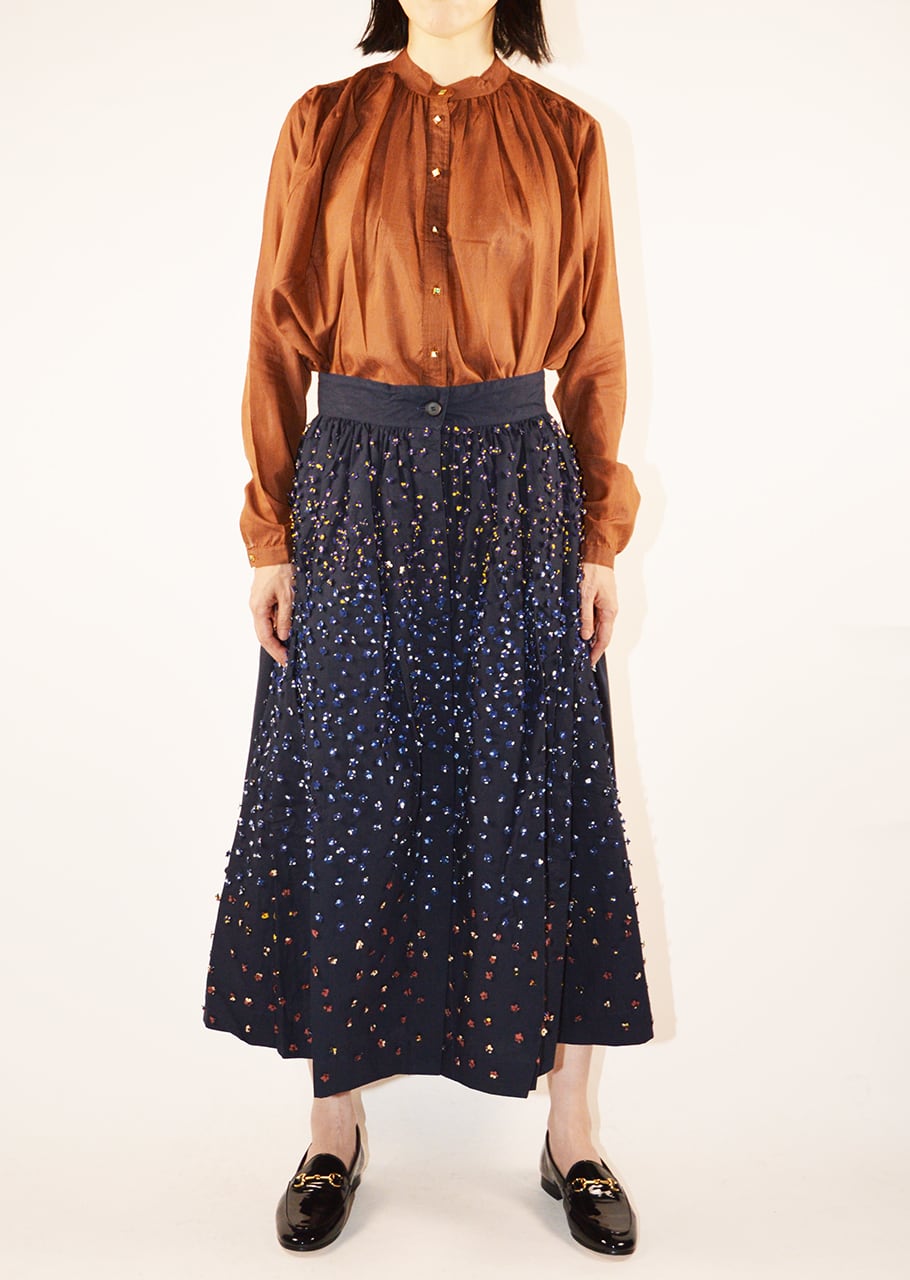 これ一枚で存在感のある華やかな印象にしあがり、なおかつウエストにボタンが付いたハイウエストのスカートで快適な着心地なのも嬉しいポイント。。