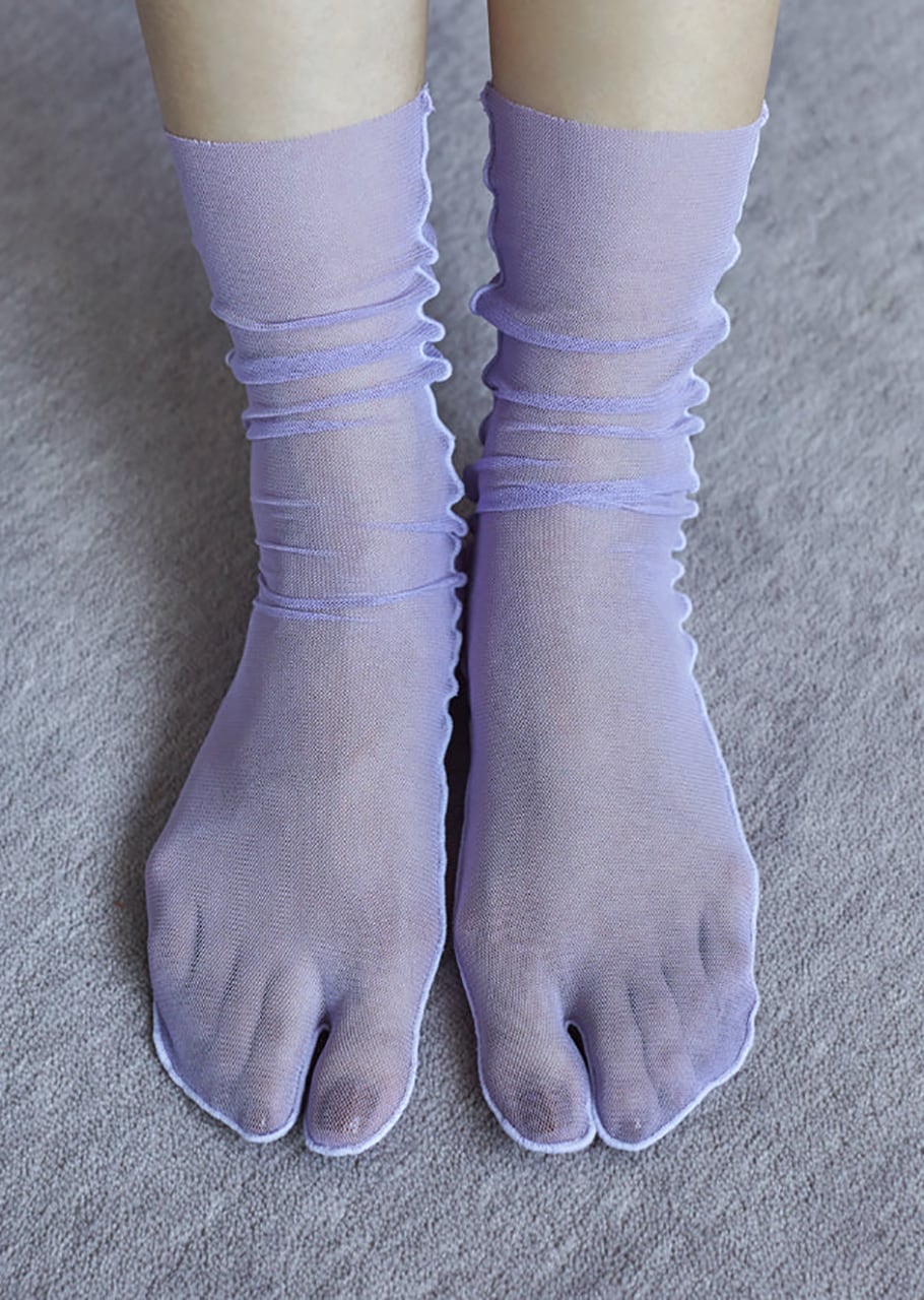 ストレッチの効いたチュール素材で出来たタビソックスは、足に程よくフィットし、サイドのメロウのウェーブがポイントに。透け感のある素材感を活かした重ねばきもおすすめです。