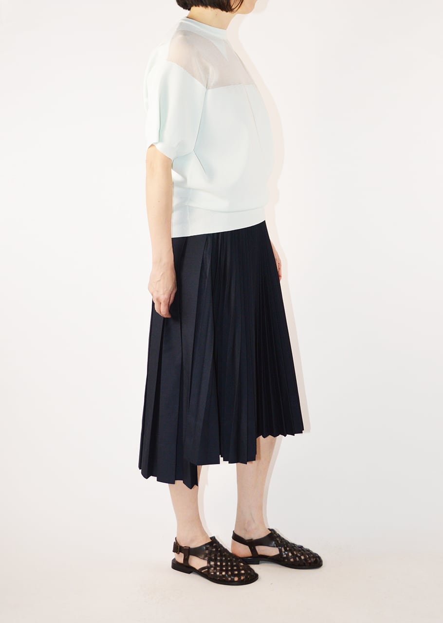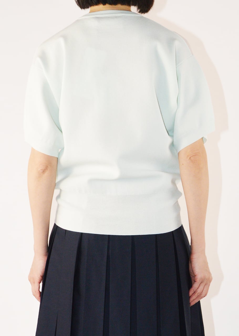 程よい透け感が軽やかな印象をもたらすクルーネックニット。首元には襟のシルエットが編み込まれていてクラシカルな印象に。薄手の生地に柔らかさとハリをもたせた素材感で、このブランドらしいモダンを感じさせます。