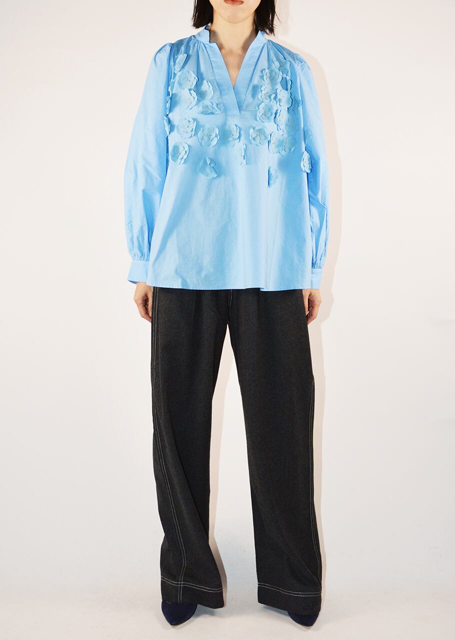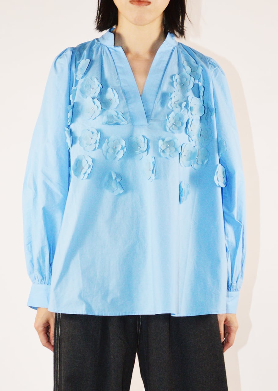 スリットネックのプルオーバーロングスリーブブラウス。レーザーカットの花々が刺繍され、繊細さとボリューム感を併せ持つ一枚です。肩周りと袖口にたっぷりとあしらわれたギャザーによってうまれるボリュームスリーブのフォルムが華やかなデザイン。スリットネックとタイトなカフスが女性らしさを演出します。