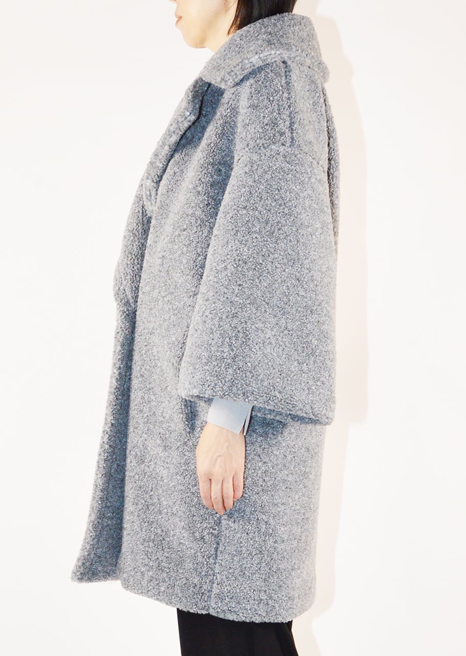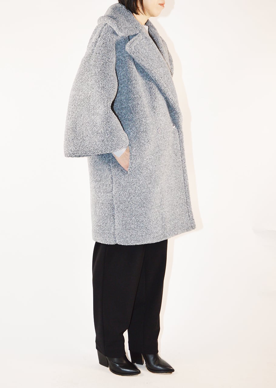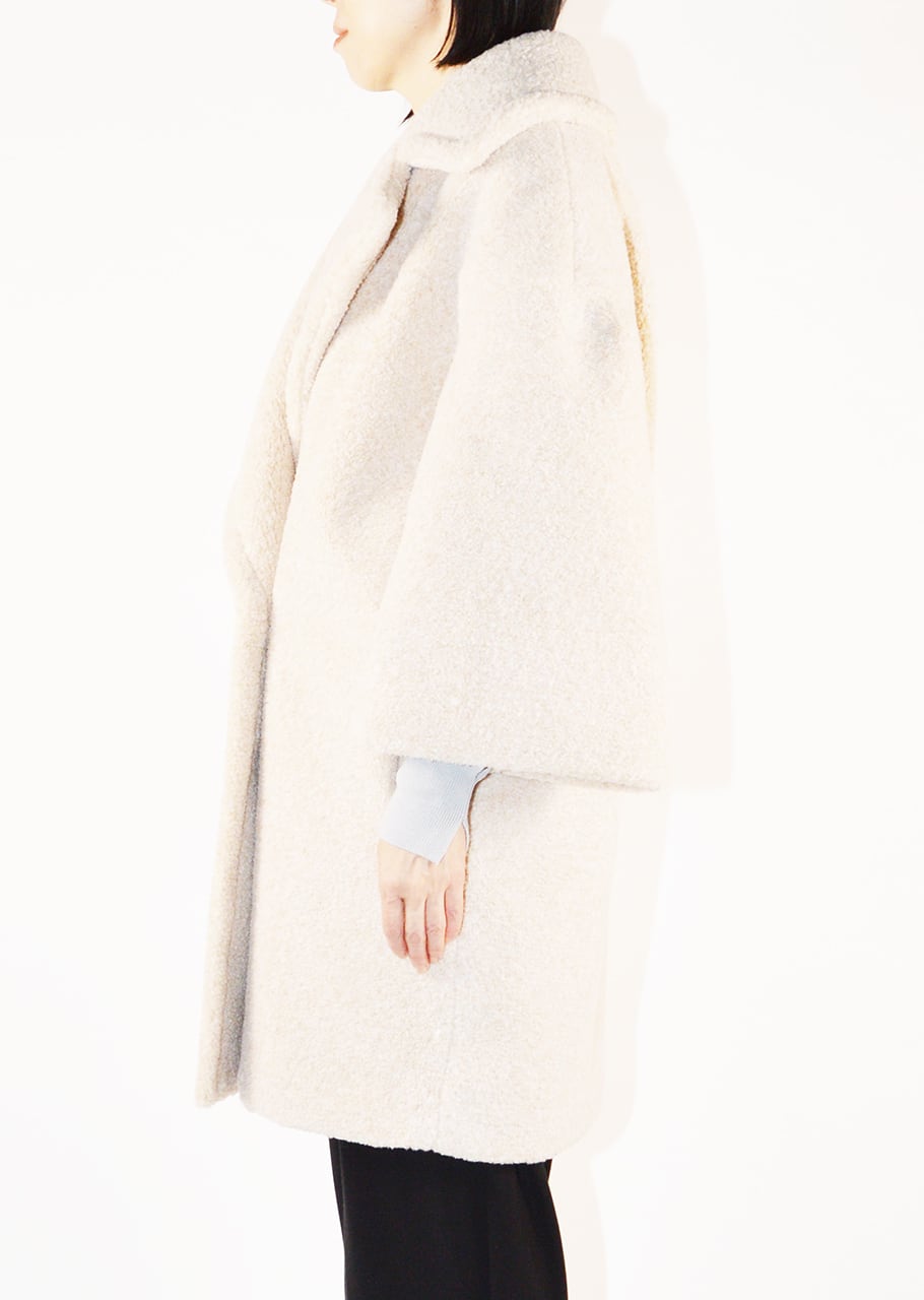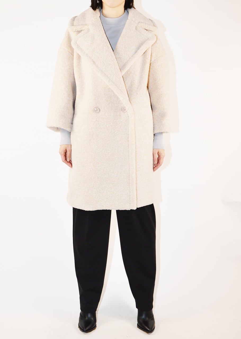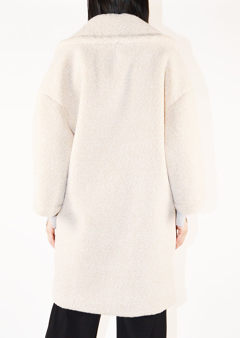 ボリュームのあるボアを全面に使用、表情豊かなコートです。ポリエステルのカールボアは、空気を含むため、軽くて暖かく、柔らかな着心地が魅力。ベースの生地にはジャージを使用しており、伸縮性にも優れており快適。ややゆったりとしたシルエットで中に合わせるものを選ばないので、オンオフ問わず着こなし可能です。