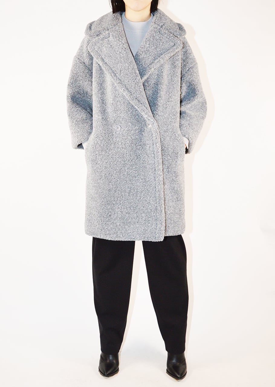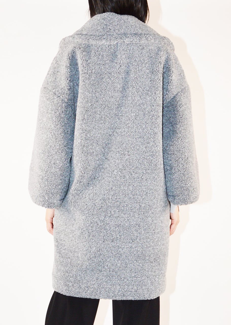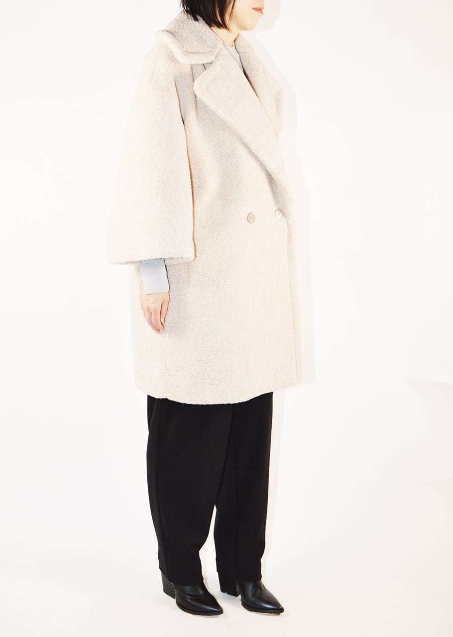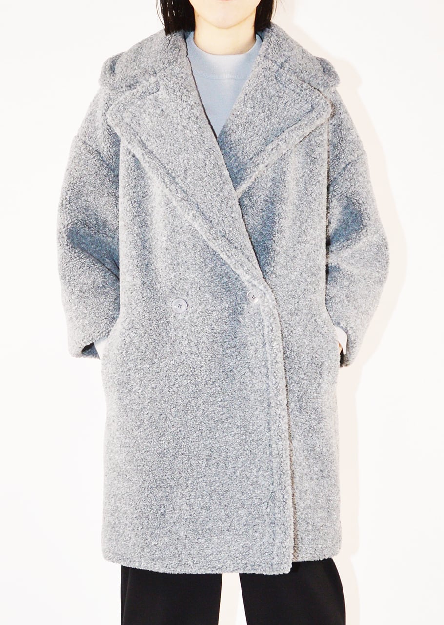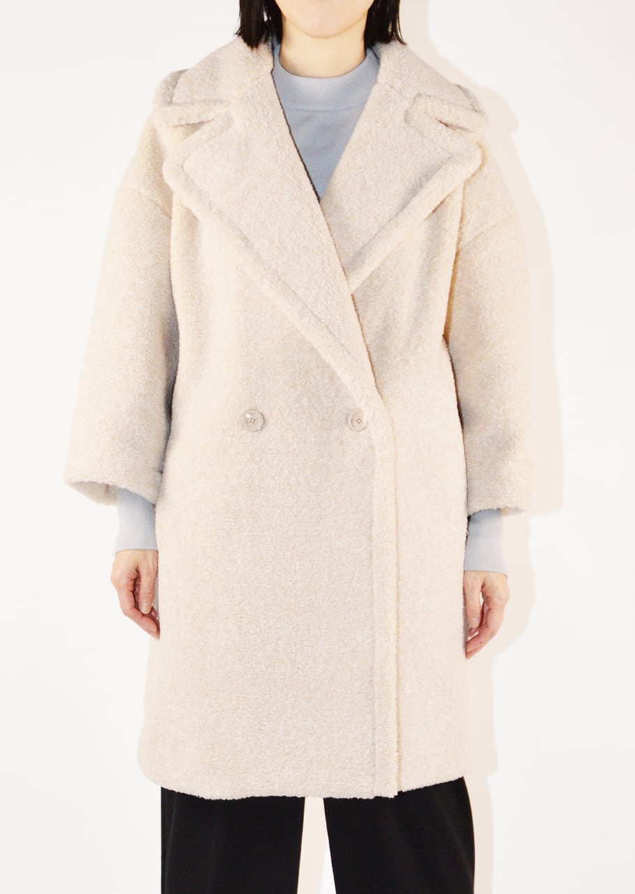 ボリュームのあるボアを全面に使用、表情豊かなコートです。ポリエステルのカールボアは、空気を含むため、軽くて暖かく、柔らかな着心地が魅力。ベースの生地にはジャージを使用しており、伸縮性にも優れており快適。ややゆったりとしたシルエットで中に合わせるものを選ばないので、オンオフ問わず着こなし可能です。